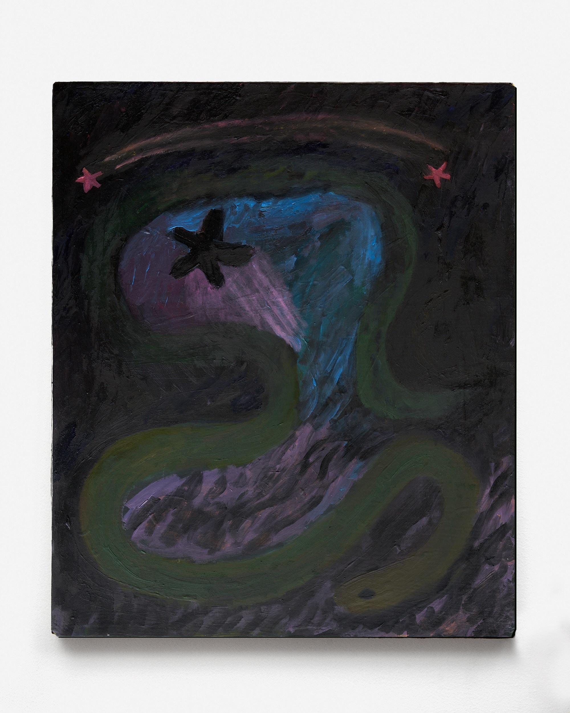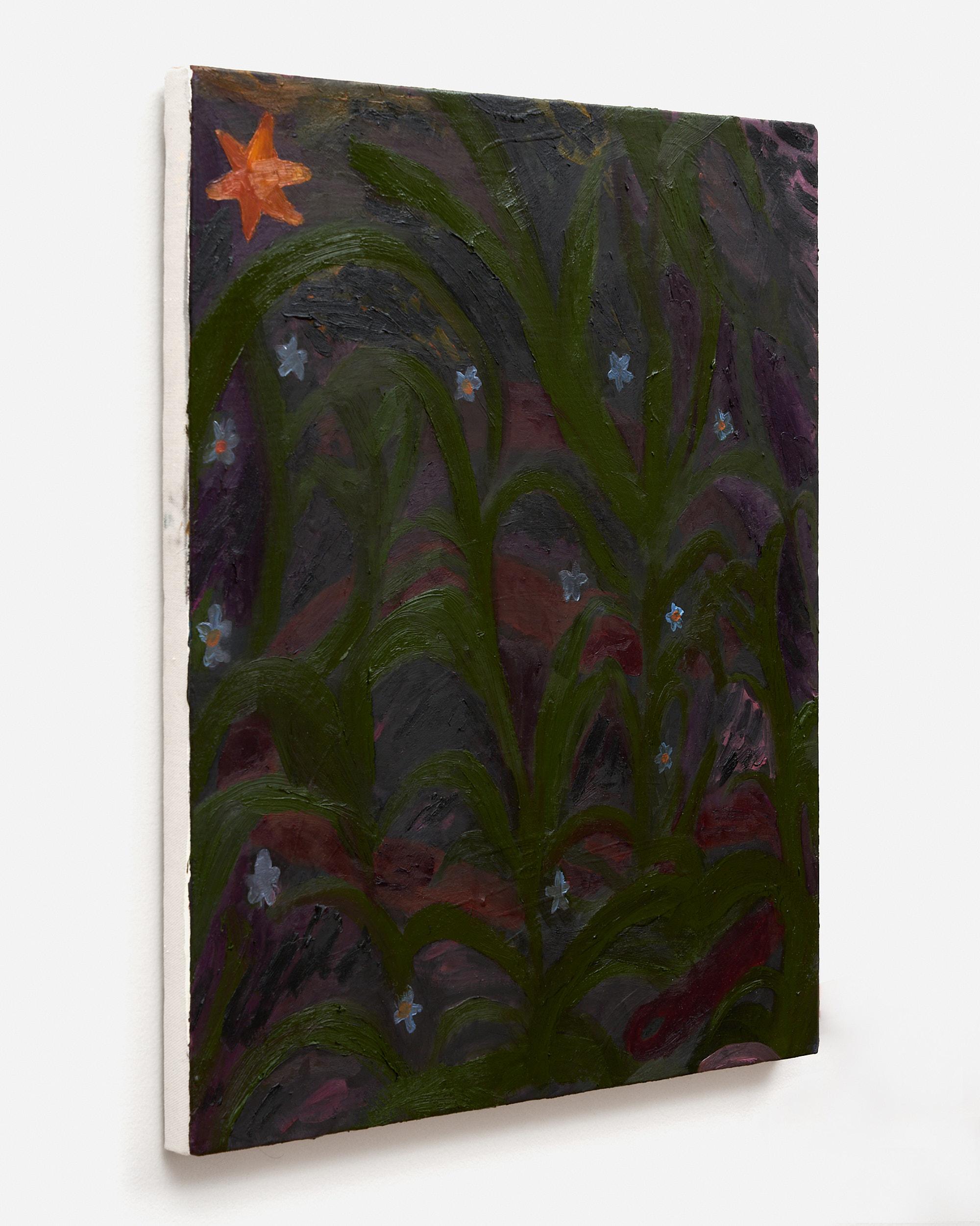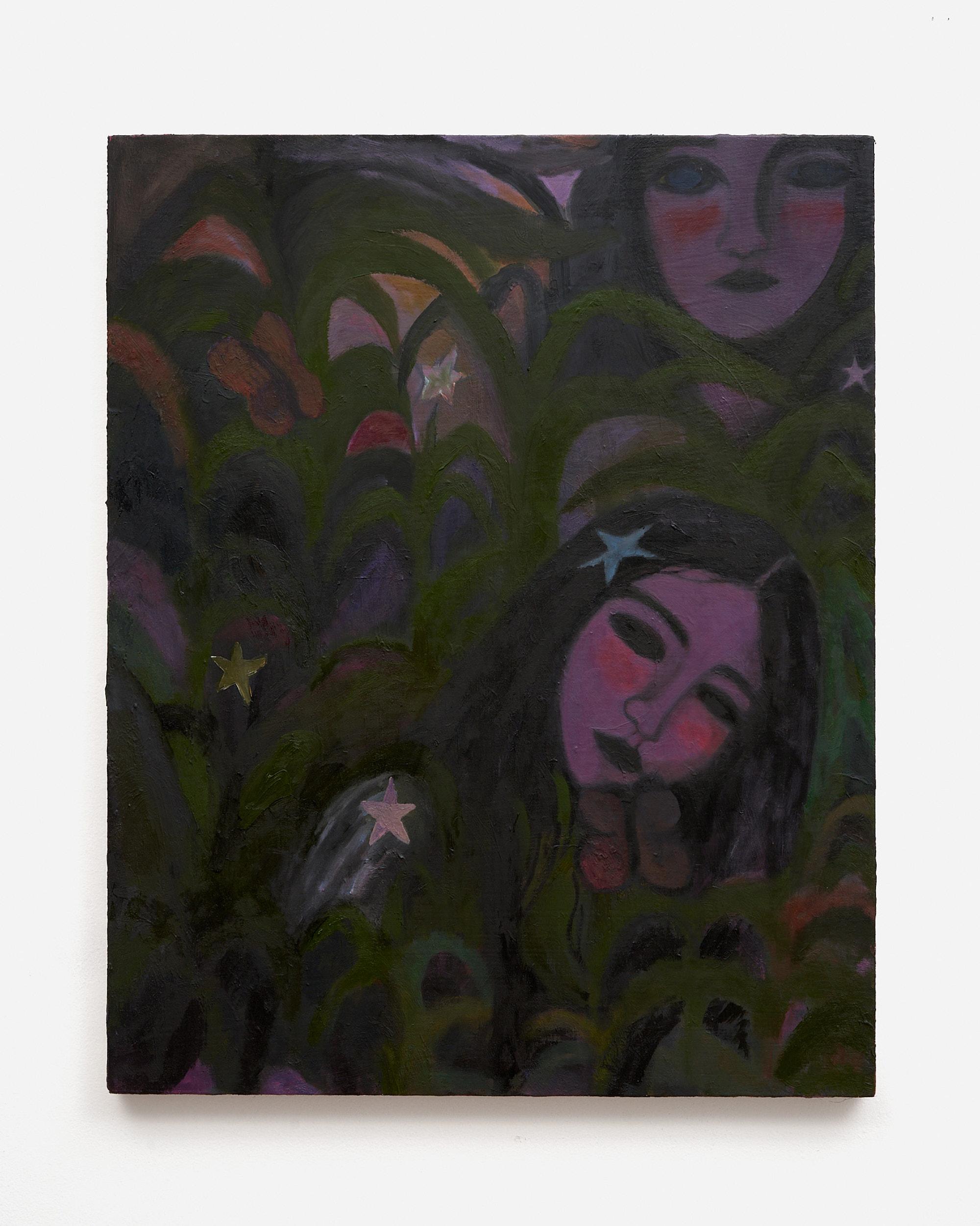 The Seven Stars—To look at Song’s paintings is to look into portals. Or, perhaps more accurately, to have portals look into you. The figures, femmes emerging out of the near- darkness of the gloaming, or returning to it, are tangled in webs of tropical flora, and each other, stars hovering in their otherworldly mi(d)st. Their environment is assembled from parts both earthly and cosmic. Their skin, a deep violet, marks their otherness, and potentiates their power.