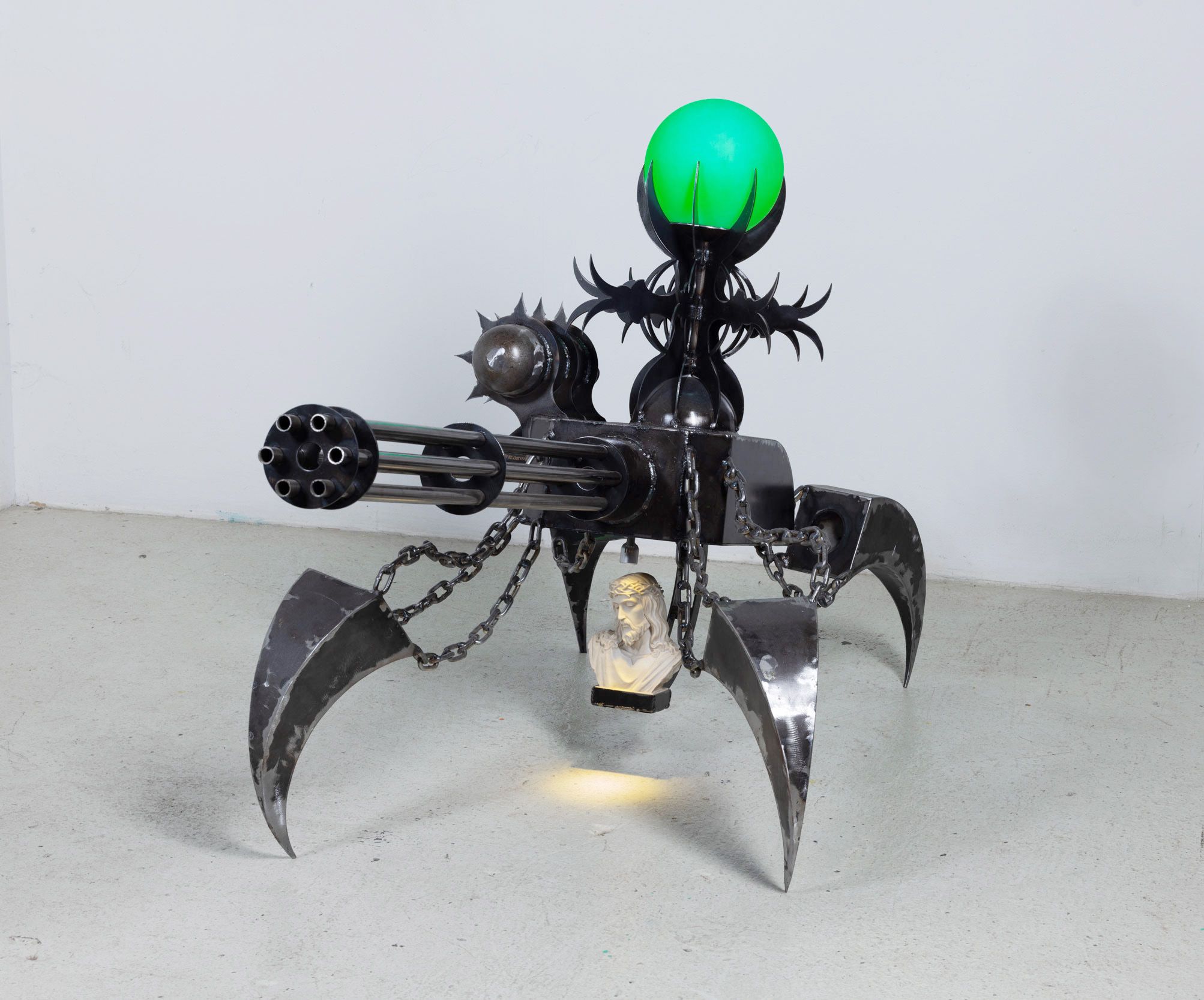 Eric Coolidge (b. 1988, Cleveland, Ohio) lives and works in Brooklyn, NY. A sculptor by training, Eric Coolidge’s practice centers on bold, confrontational works that probe intersections of absurdity, religion, and the American political landscape. Drawing inspiration from science fiction and the occult, his sculptures function as charged symbols, part monument and part provocation. Working primarily in metal, Coolidge introduces unexpected materials such as glitter to create deliberate tensions that speak to duality, spectacle, and belief. His works assert a physical presence that mirrors their conceptual intensity, inviting viewers into spaces of discomfort, humor, and reflection.