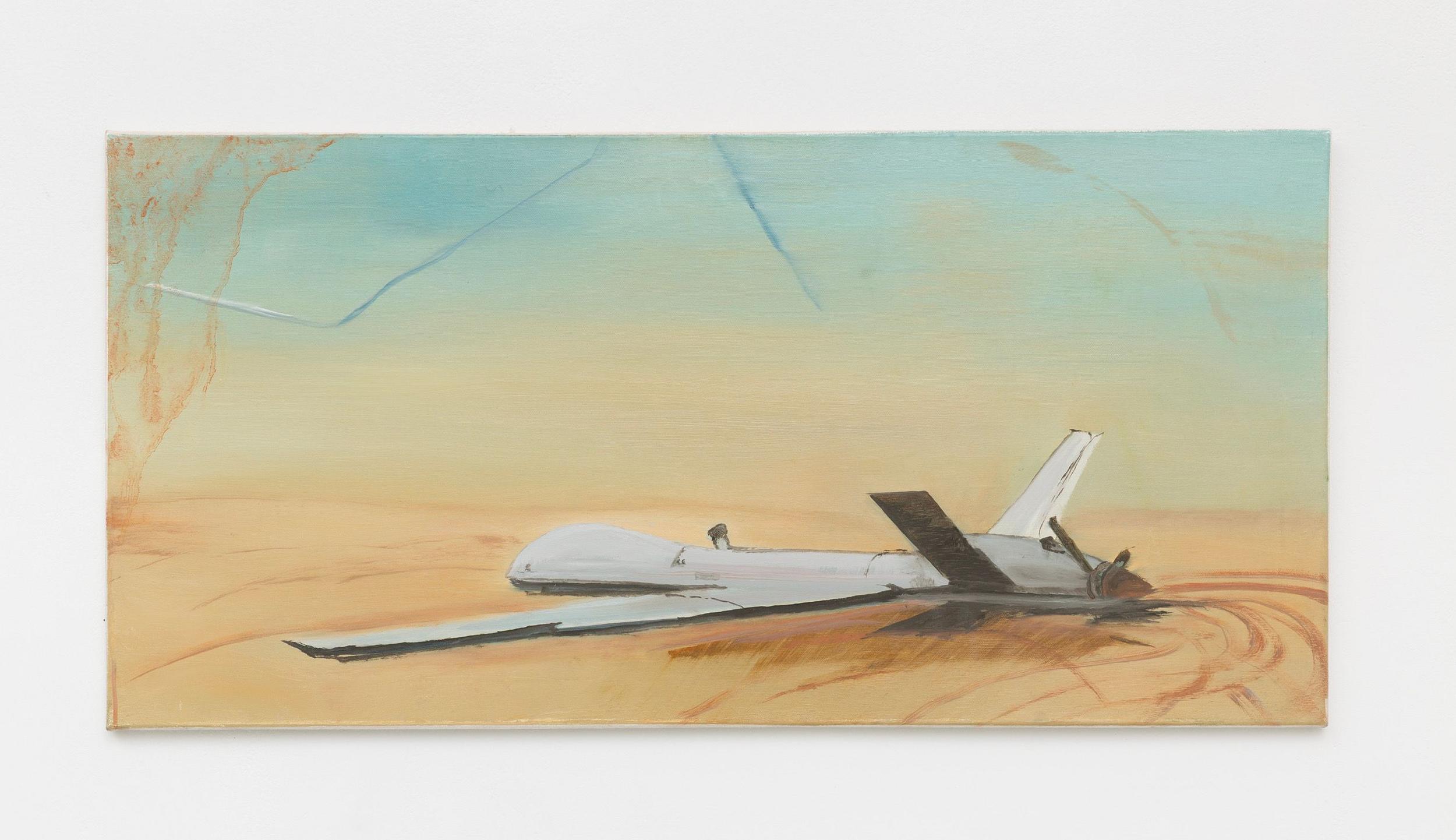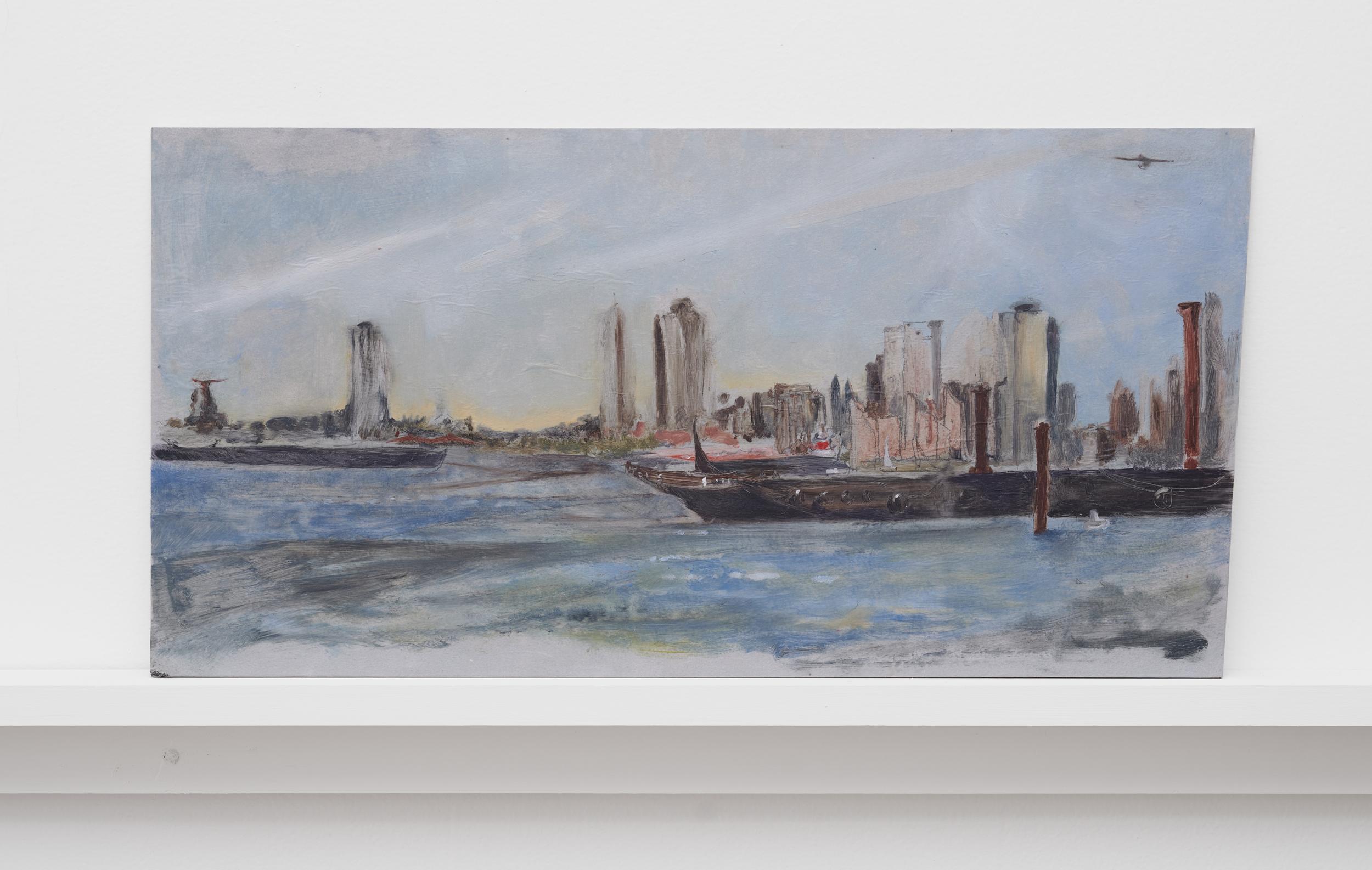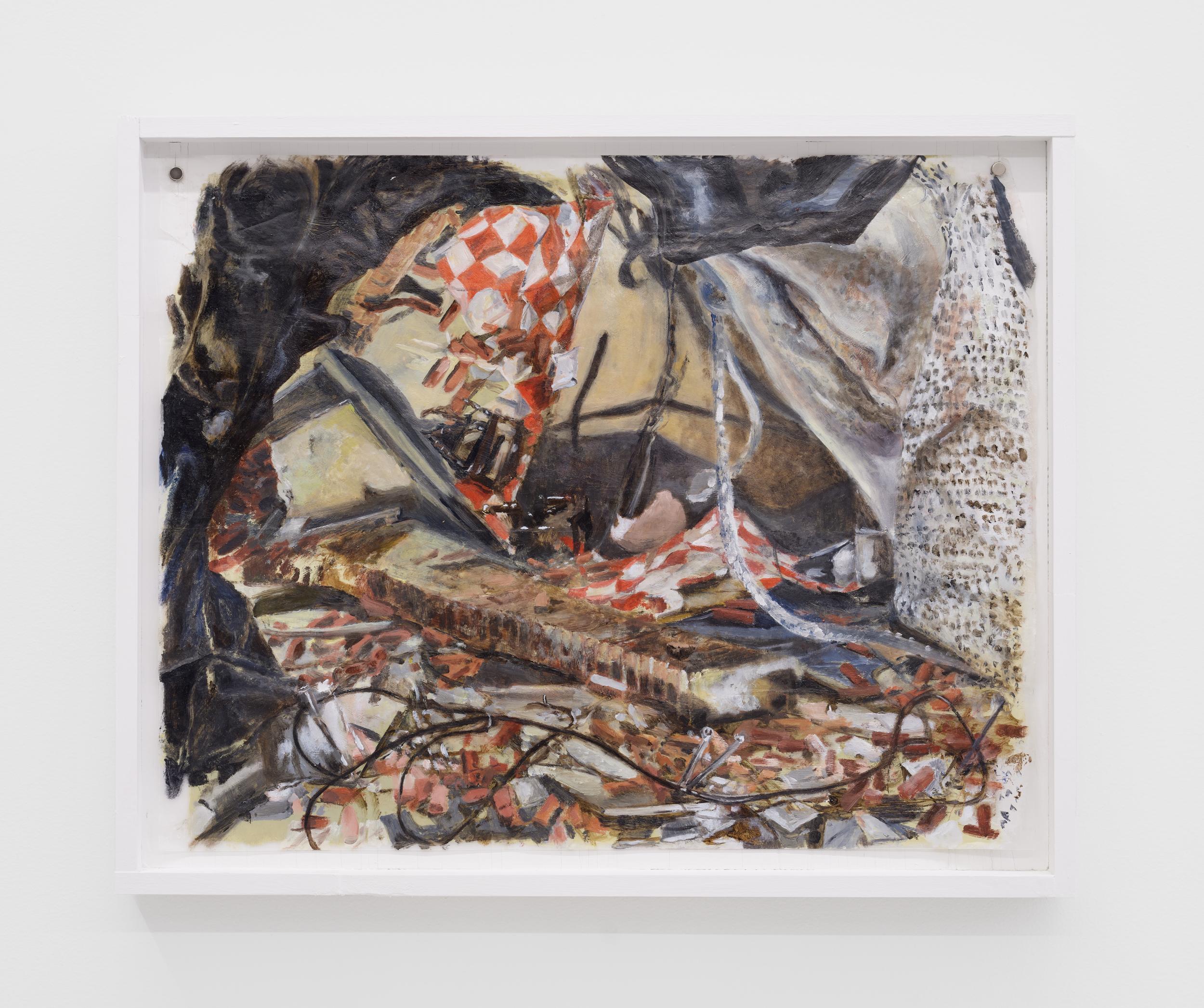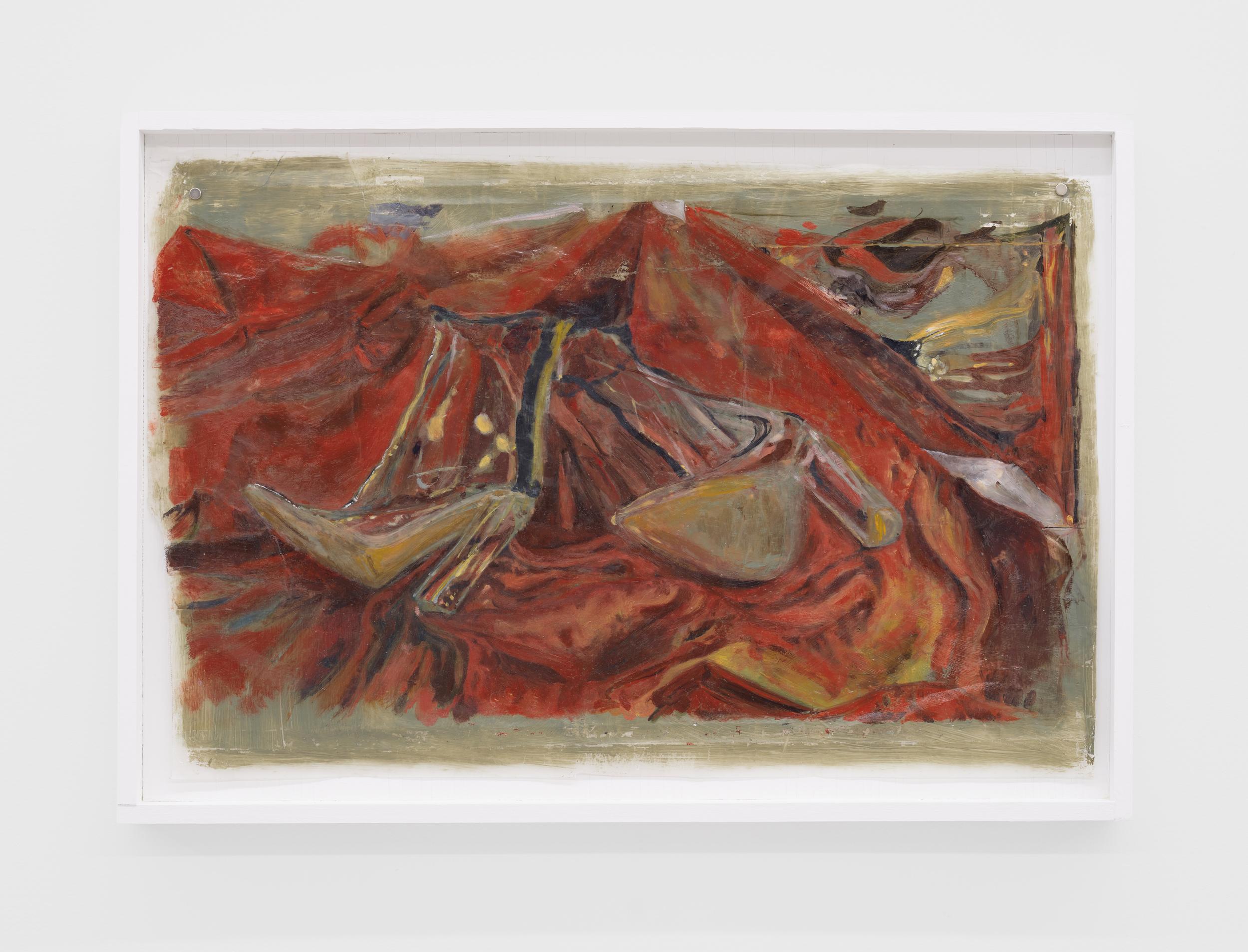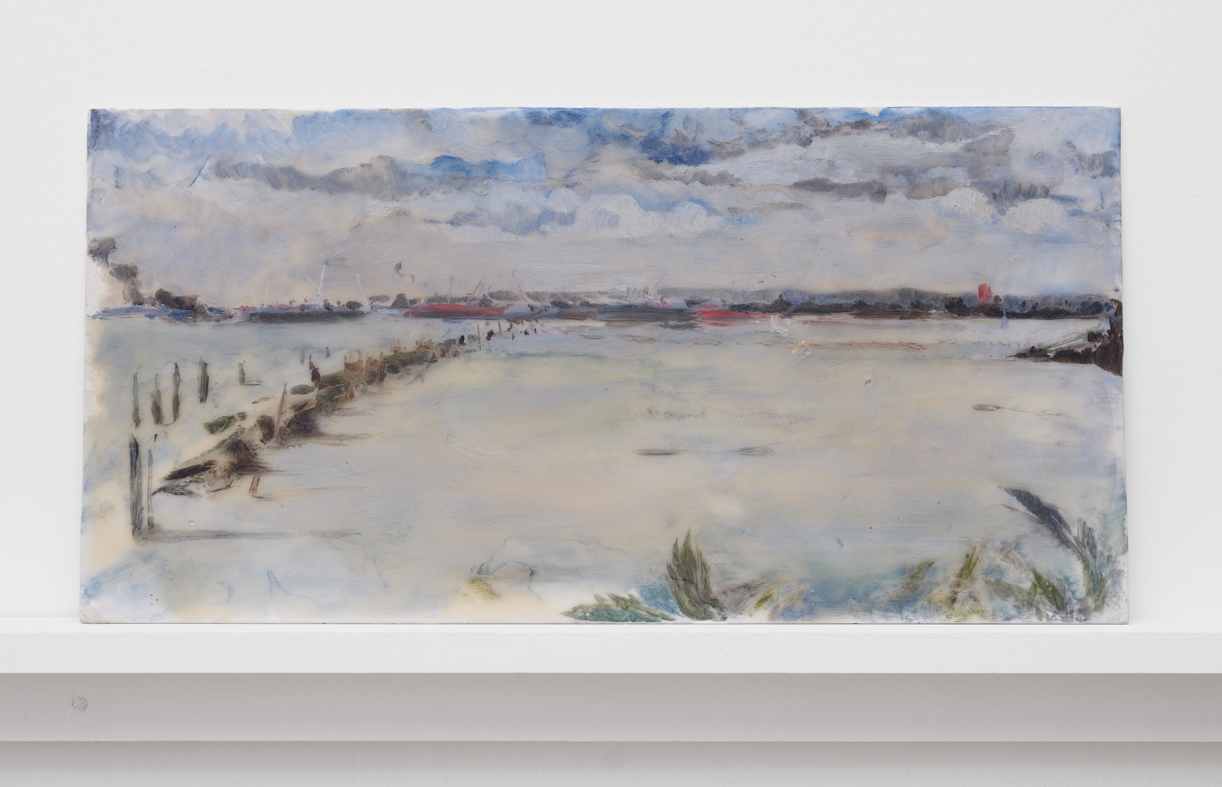 Addanki’s work is a visual essay, offering us an opportunity to read, and Planck extends this mirror into the viscerality of deeper landscape, of how an artistic practice can perhaps teach us a moment of disalienation, and critical engagement. Water soluble oil on wax paper, water soluble oil on wax paper, water soluble oil on wax paper. Cuts and etches. Handworked canvas. The monocrop here has caught fire, and in the drop perceived through the painting, you will see tears in the tent, chaos, and breathing memories of ambient red, a smog that resides in the inner soul of your lungs. In what is addressed as a Desert Study, the rug’s print struggles to shine against the sand which is also red. The door is seen to be open, not to an outside, but to a closeted interior, dried fungal spores leaking through the walls. A slippage into a New York archipelagic blue canopy for the goods from the Atlantic, ikea : fog : end points in the oceanic highway : an east after the west : floody gaze in the air. Between the bridge over the beautiful sky and the grass that grows from the sand, it is difficult to say much else. Theory has been painted. Persistence, stresses for a pause, and as Fred Moten once said in a poetry reading, “I don’t want to talk about those motherfuckers. I just need you to know that this shit is killing you too.” Did you know that we could play jazz on a shallow tide day right next to that grass under the bridge. What I describe as the grass might just be the twigs left behind, but sometimes the gift of the painting is to not know the answer. The blue breaks the measurement of the frame.