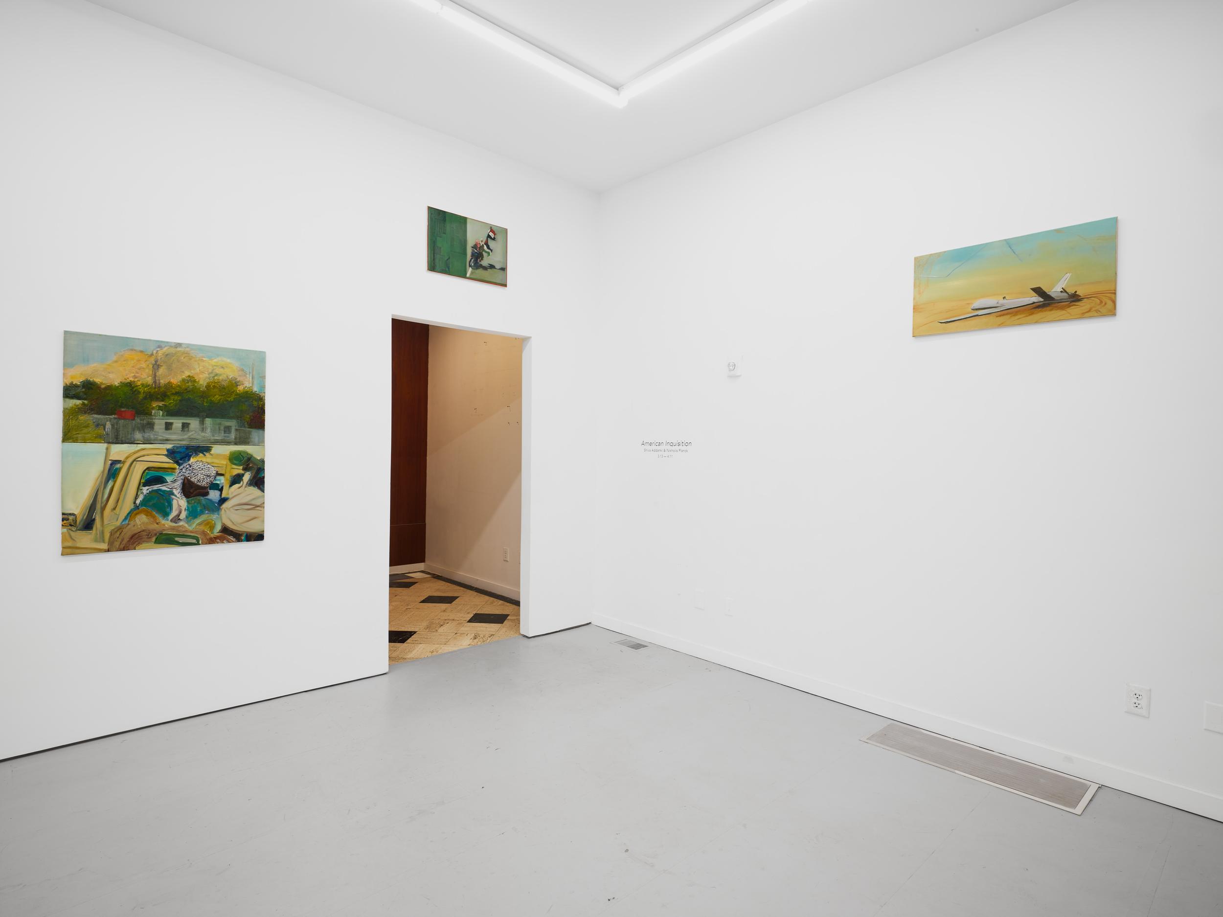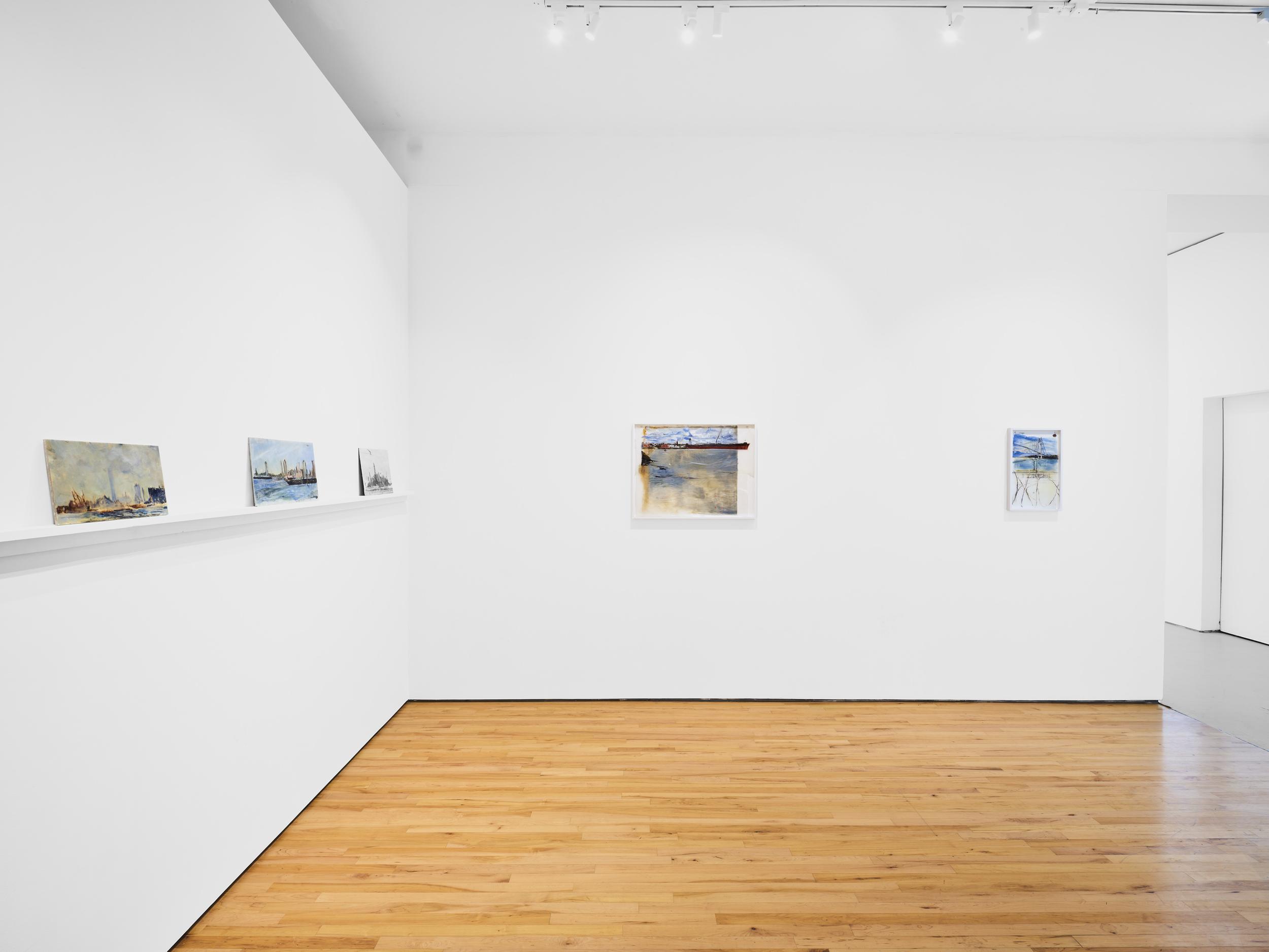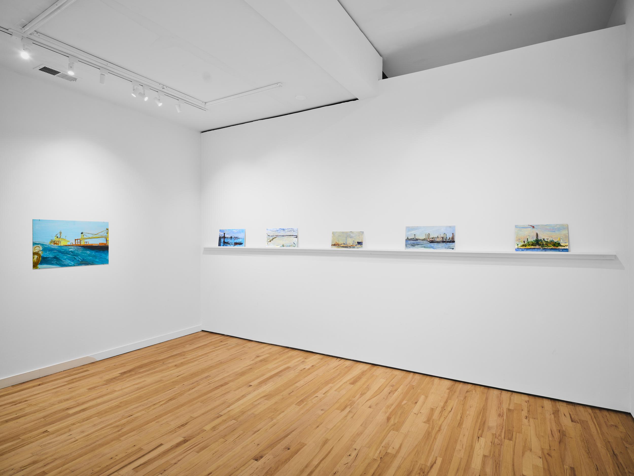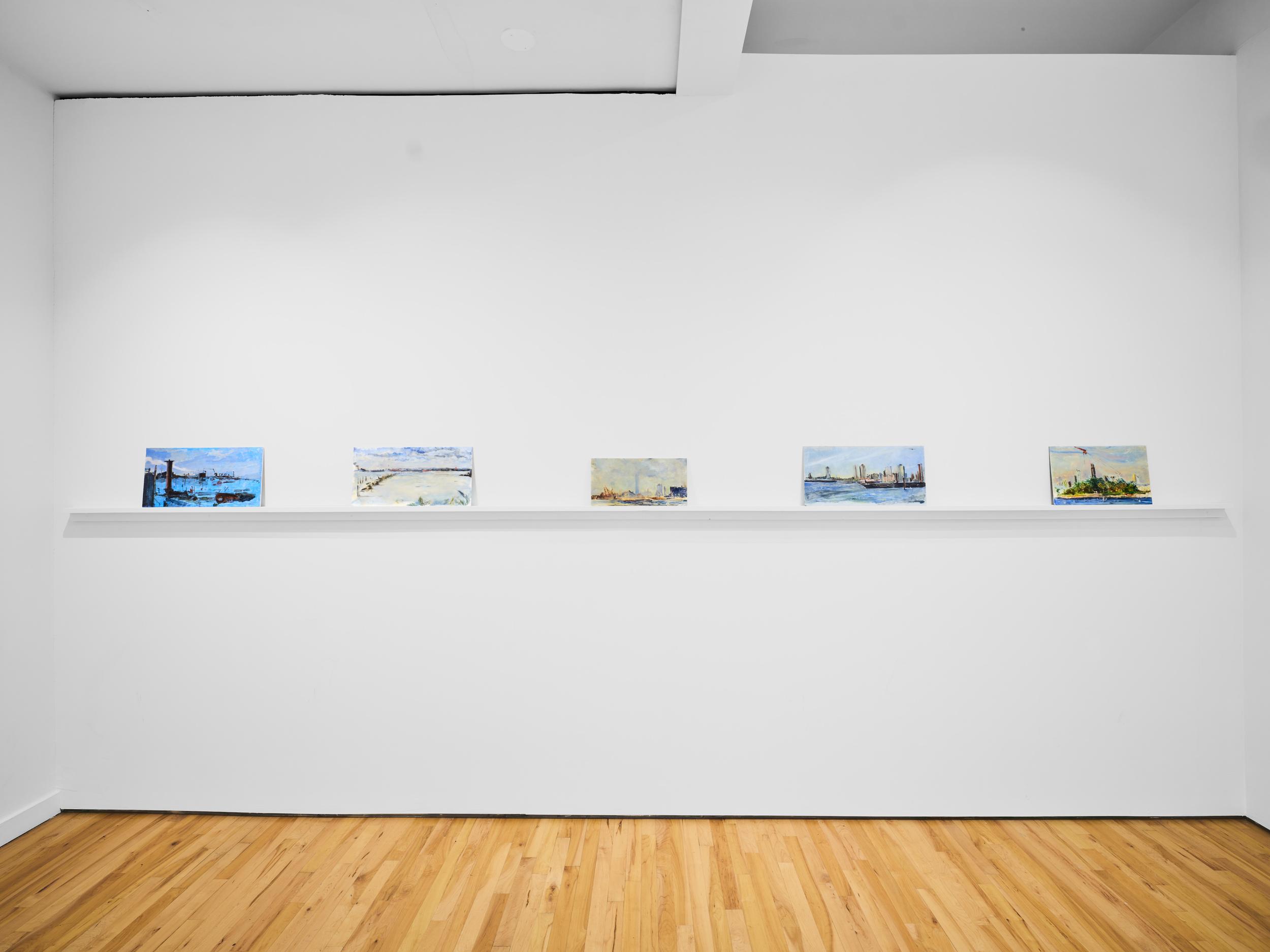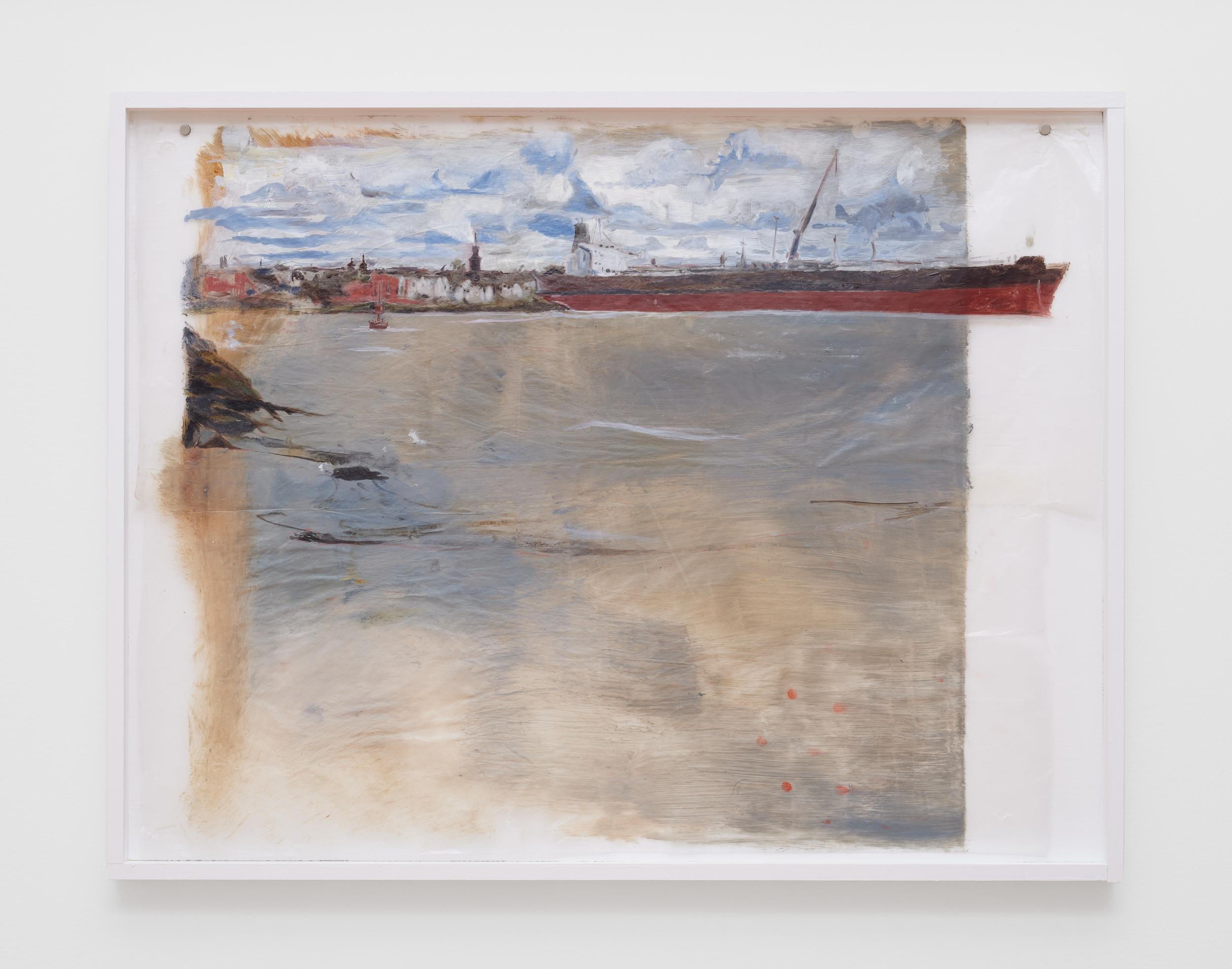 Addanki’s work is a visual essay, offering us an opportunity to read, and Planck extends this mirror into the viscerality of deeper landscape, of how an artistic practice can perhaps teach us a moment of disalienation, and critical engagement. Water soluble oil on wax paper, water soluble oil on wax paper, water soluble oil on wax paper. Cuts and etches. Handworked canvas. The monocrop here has caught fire, and in the drop perceived through the painting, you will see tears in the tent, chaos, and breathing memories of ambient red, a smog that resides in the inner soul of your lungs. In what is addressed as a Desert Study, the rug’s print struggles to shine against the sand which is also red. The door is seen to be open, not to an outside, but to a closeted interior, dried fungal spores leaking through the walls. A slippage into a New York archipelagic blue canopy for the goods from the Atlantic, ikea : fog : end points in the oceanic highway : an east after the west : floody gaze in the air. Between the bridge over the beautiful sky and the grass that grows from the sand, it is difficult to say much else. Theory has been painted. Persistence, stresses for a pause, and as Fred Moten once said in a poetry reading, “I don’t want to talk about those motherfuckers. I just need you to know that this shit is killing you too.” Did you know that we could play jazz on a shallow tide day right next to that grass under the bridge. What I describe as the grass might just be the twigs left behind, but sometimes the gift of the painting is to not know the answer. The blue breaks the measurement of the frame.