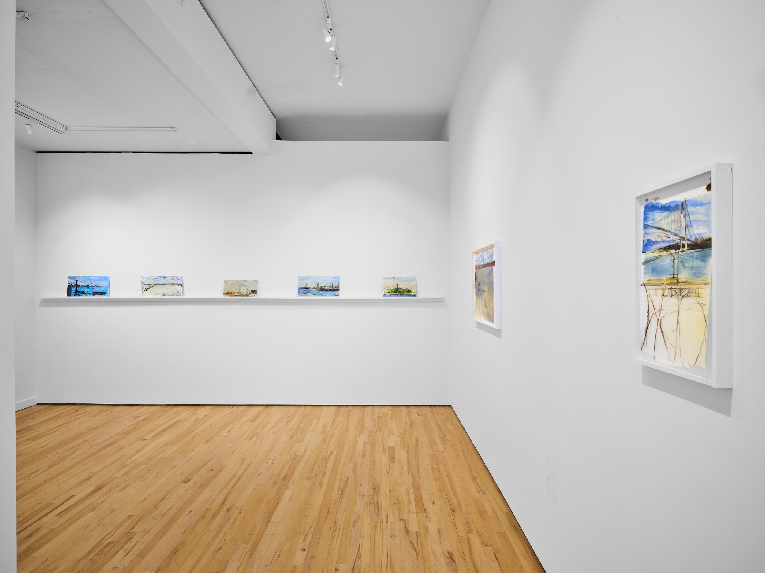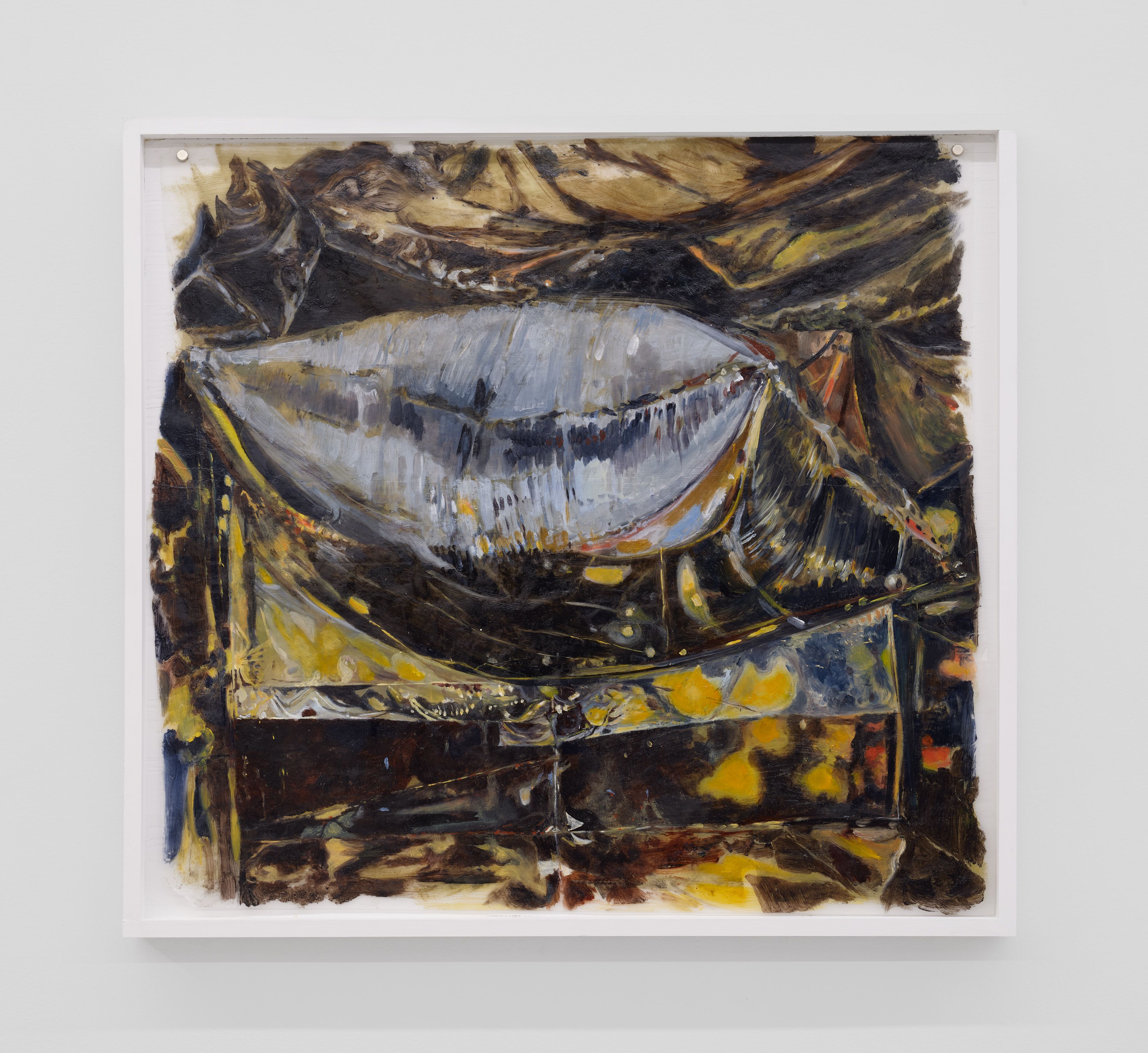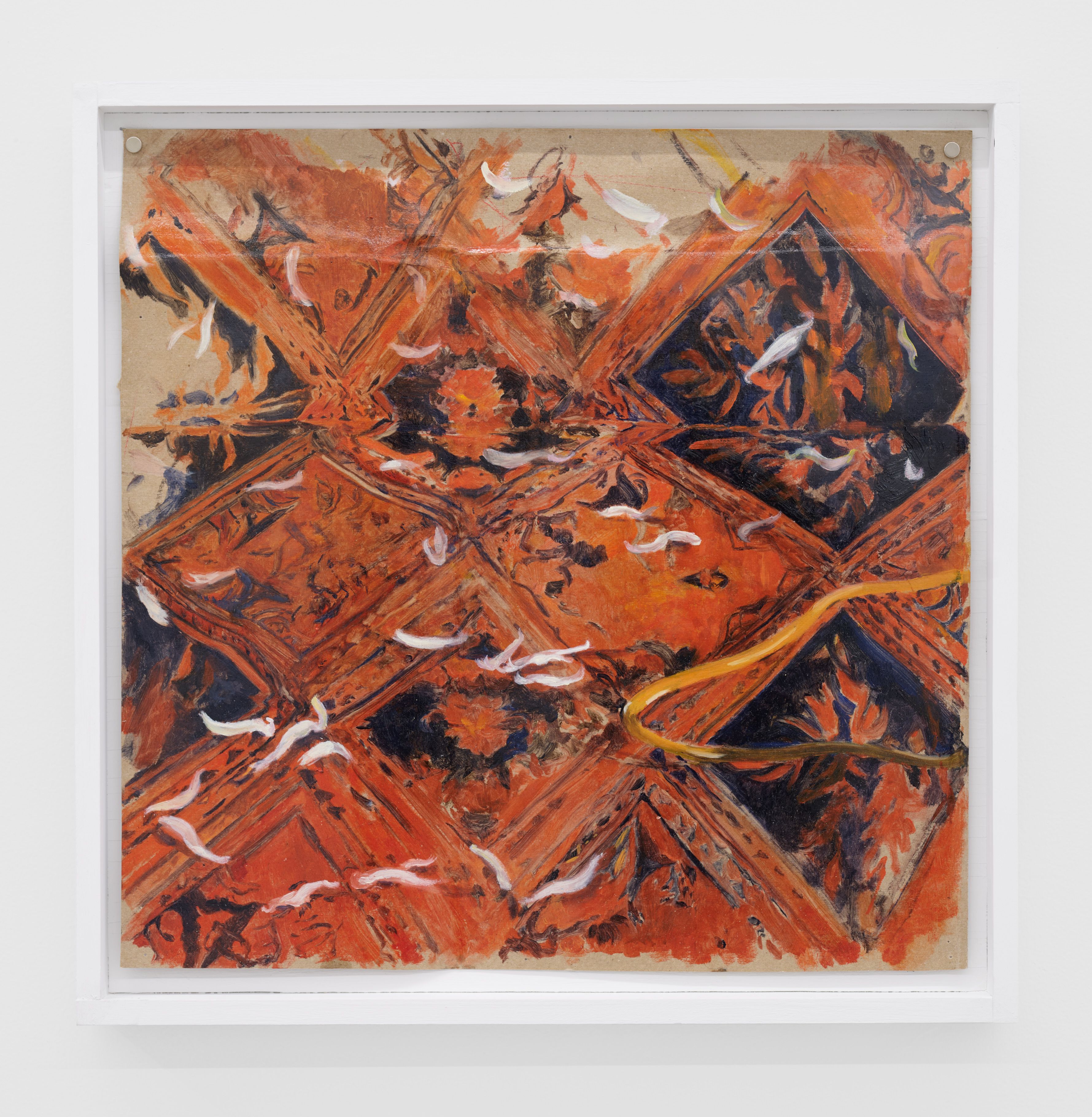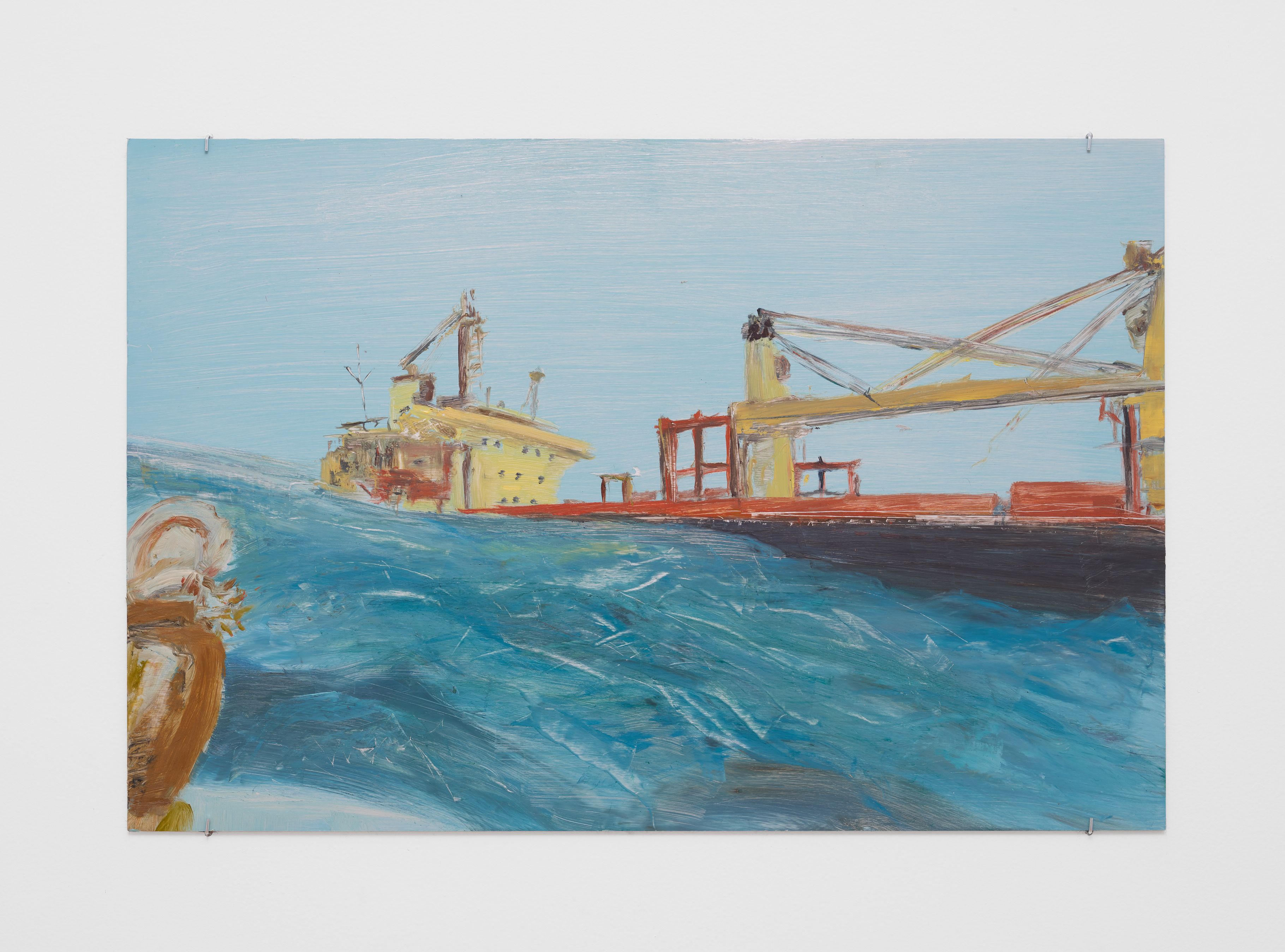 Addanki’s work is a visual essay, offering us an opportunity to read, and Planck extends this mirror into the viscerality of deeper landscape, of how an artistic practice can perhaps teach us a moment of disalienation, and critical engagement. Water soluble oil on wax paper, water soluble oil on wax paper, water soluble oil on wax paper. Cuts and etches. Handworked canvas. The monocrop here has caught fire, and in the drop perceived through the painting, you will see tears in the tent, chaos, and breathing memories of ambient red, a smog that resides in the inner soul of your lungs. In what is addressed as a Desert Study, the rug’s print struggles to shine against the sand which is also red. The door is seen to be open, not to an outside, but to a closeted interior, dried fungal spores leaking through the walls. A slippage into a New York archipelagic blue canopy for the goods from the Atlantic, ikea : fog : end points in the oceanic highway : an east after the west : floody gaze in the air. Between the bridge over the beautiful sky and the grass that grows from the sand, it is difficult to say much else. Theory has been painted. Persistence, stresses for a pause, and as Fred Moten once said in a poetry reading, “I don’t want to talk about those motherfuckers. I just need you to know that this shit is killing you too.” Did you know that we could play jazz on a shallow tide day right next to that grass under the bridge. What I describe as the grass might just be the twigs left behind, but sometimes the gift of the painting is to not know the answer. The blue breaks the measurement of the frame.