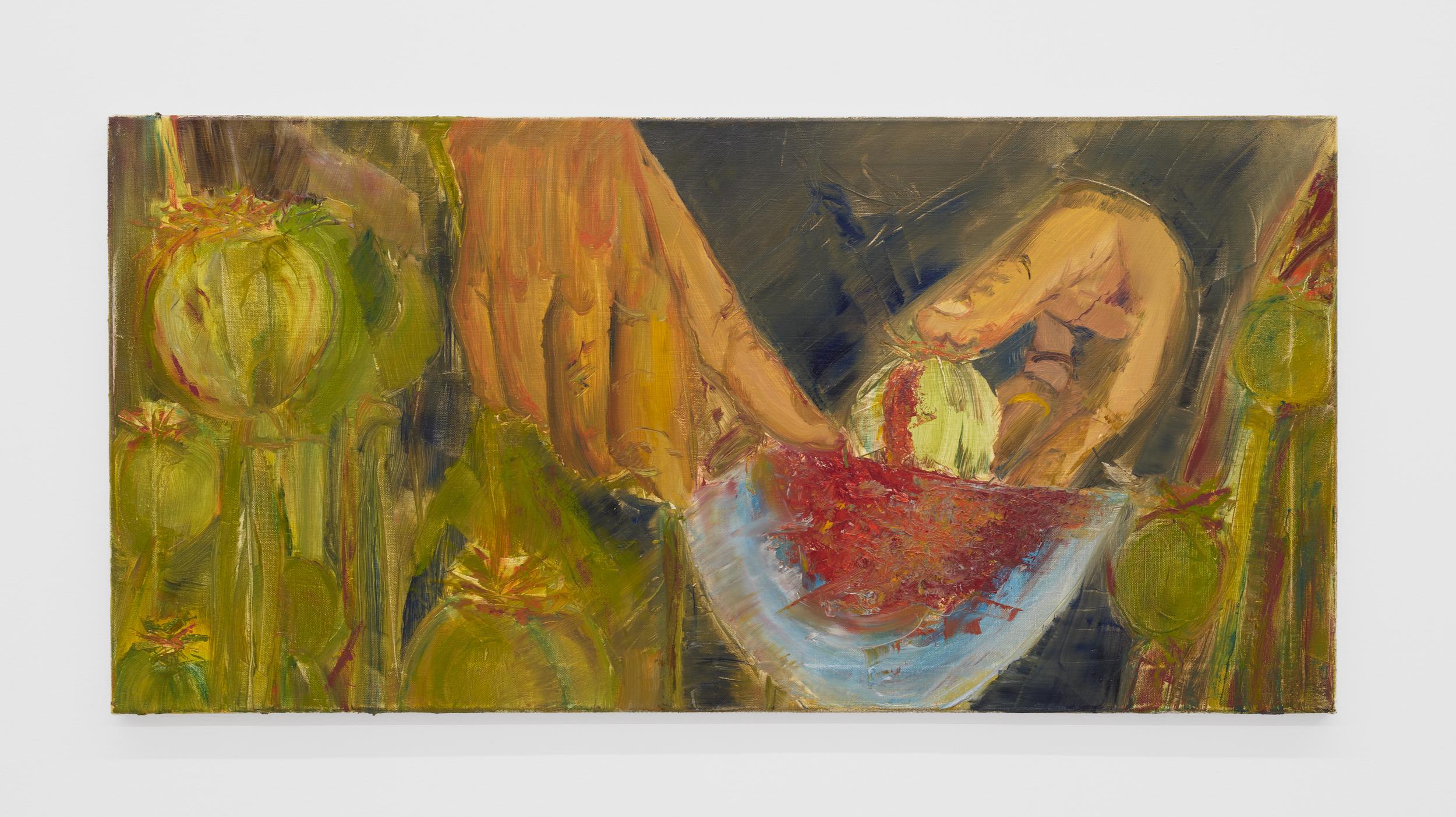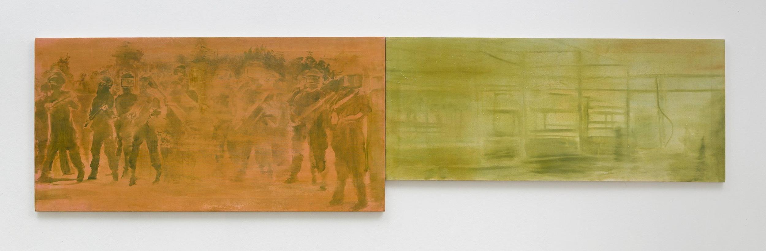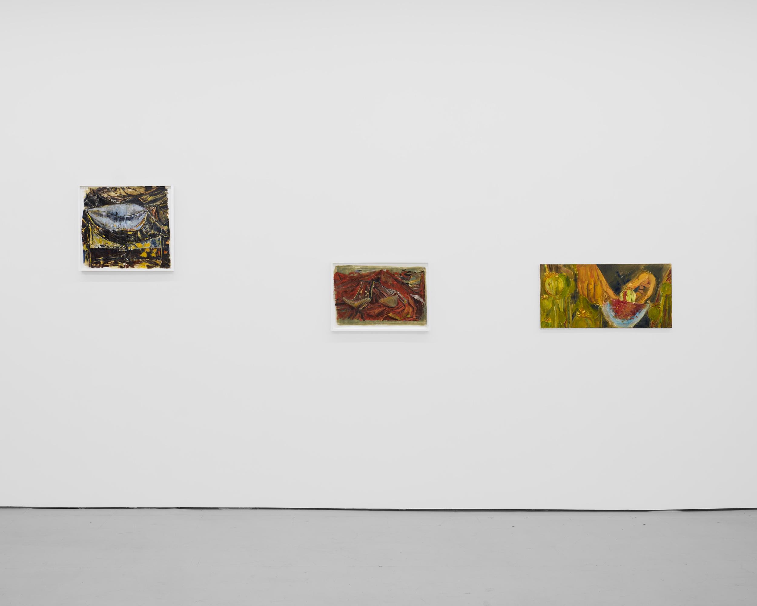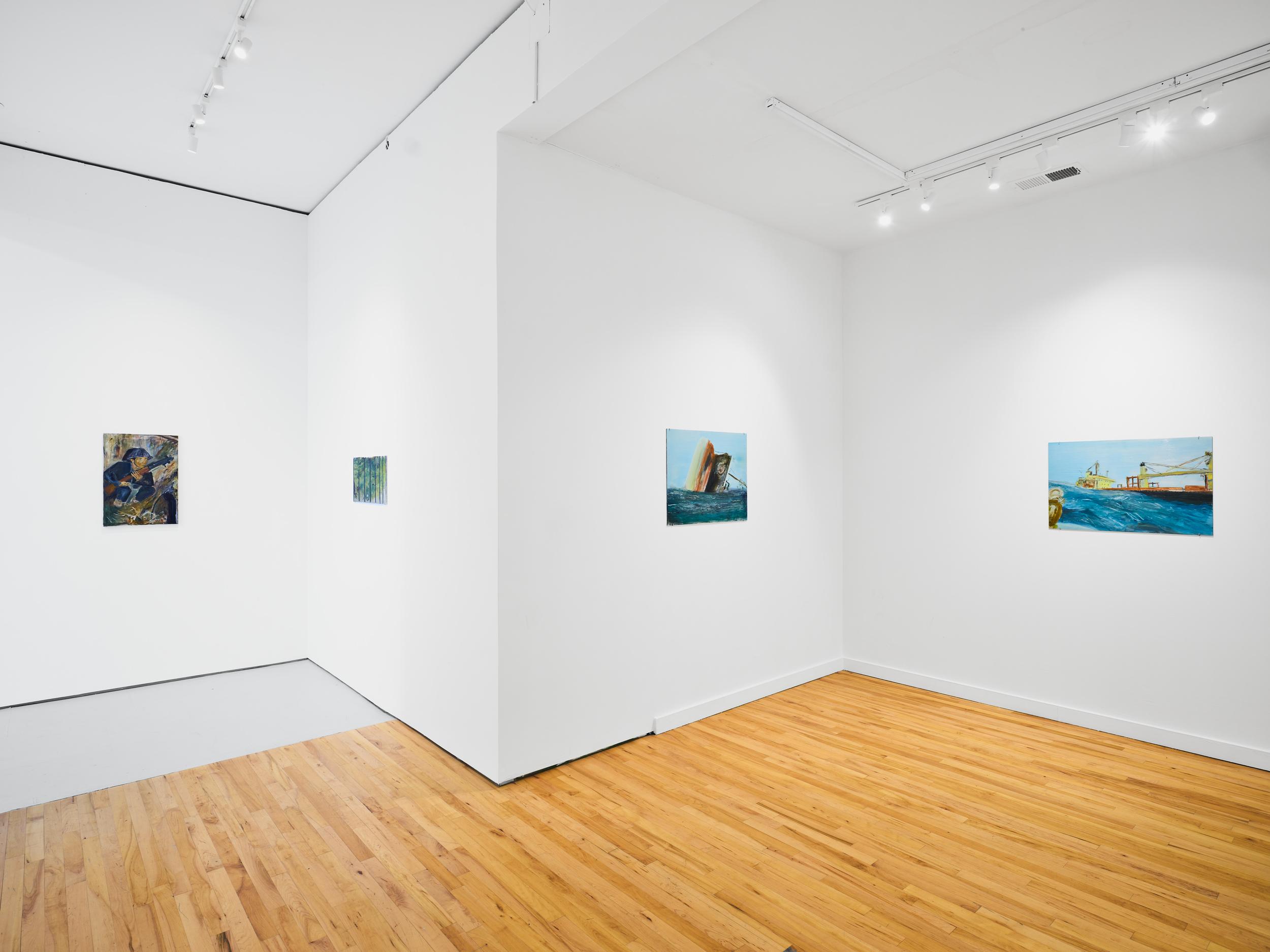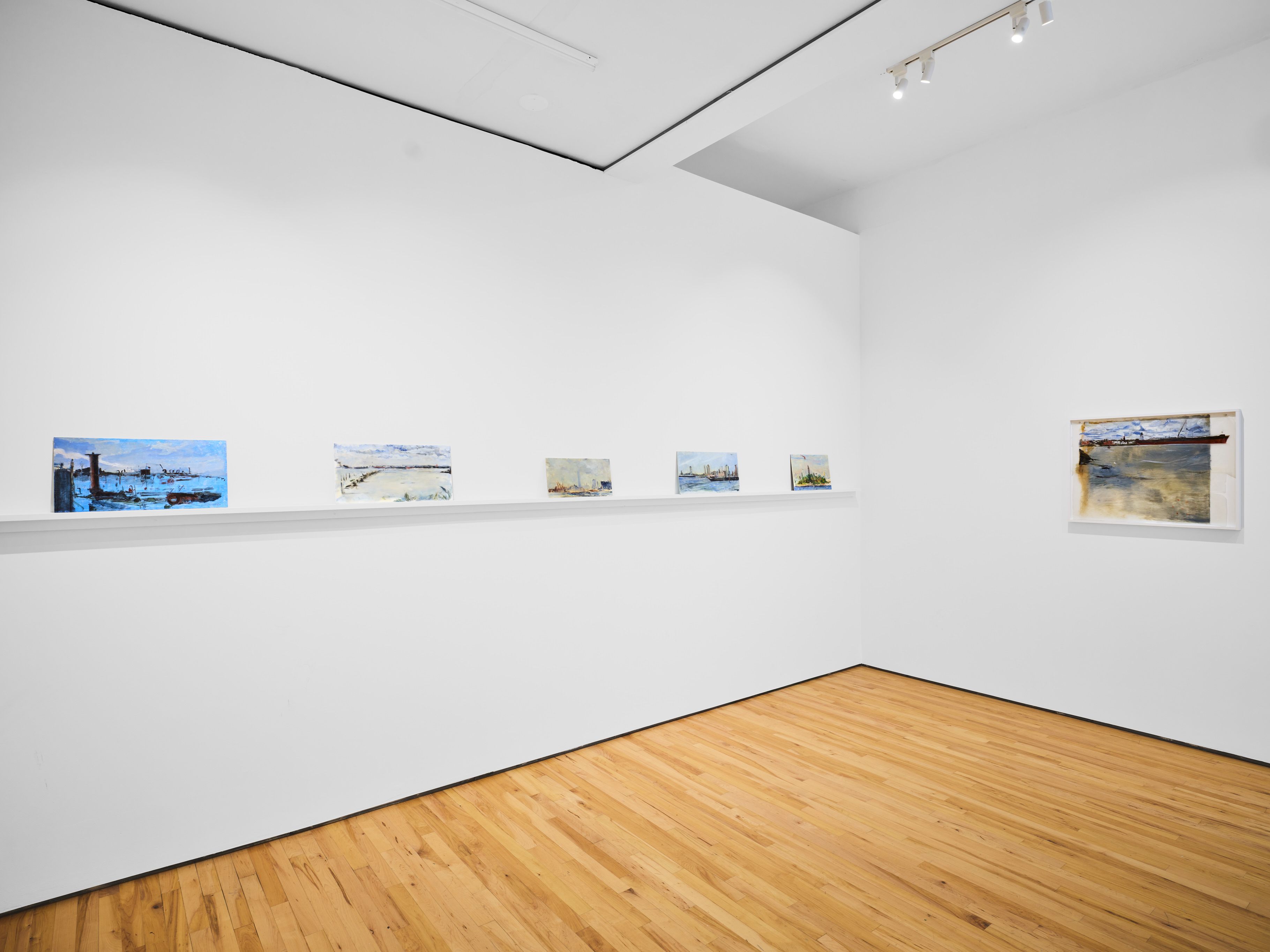 Addanki’s work is a visual essay, offering us an opportunity to read, and Planck extends this mirror into the viscerality of deeper landscape, of how an artistic practice can perhaps teach us a moment of disalienation, and critical engagement. Water soluble oil on wax paper, water soluble oil on wax paper, water soluble oil on wax paper. Cuts and etches. Handworked canvas. The monocrop here has caught fire, and in the drop perceived through the painting, you will see tears in the tent, chaos, and breathing memories of ambient red, a smog that resides in the inner soul of your lungs. In what is addressed as a Desert Study, the rug’s print struggles to shine against the sand which is also red. The door is seen to be open, not to an outside, but to a closeted interior, dried fungal spores leaking through the walls. A slippage into a New York archipelagic blue canopy for the goods from the Atlantic, ikea : fog : end points in the oceanic highway : an east after the west : floody gaze in the air. Between the bridge over the beautiful sky and the grass that grows from the sand, it is difficult to say much else. Theory has been painted. Persistence, stresses for a pause, and as Fred Moten once said in a poetry reading, “I don’t want to talk about those motherfuckers. I just need you to know that this shit is killing you too.” Did you know that we could play jazz on a shallow tide day right next to that grass under the bridge. What I describe as the grass might just be the twigs left behind, but sometimes the gift of the painting is to not know the answer. The blue breaks the measurement of the frame.