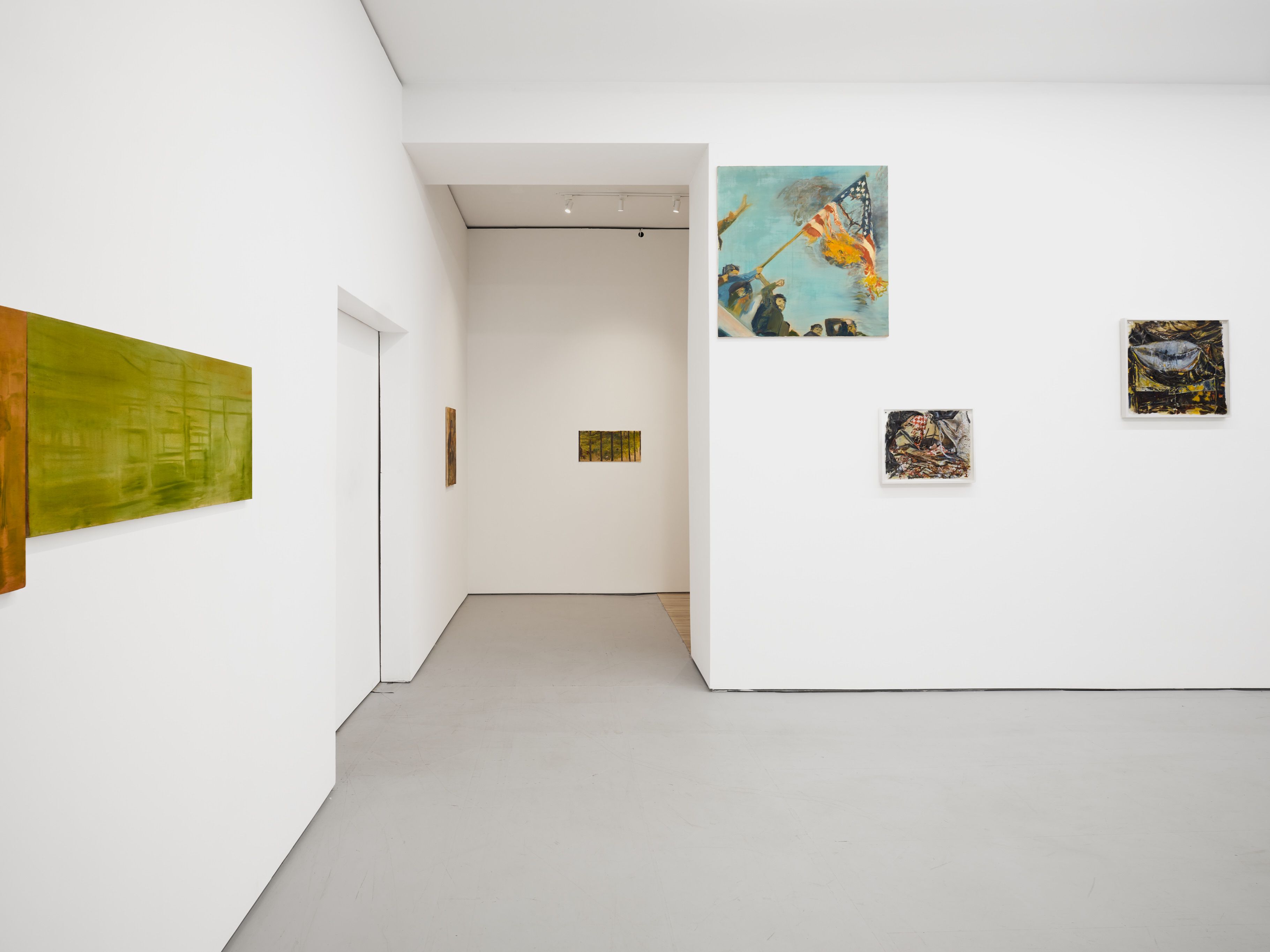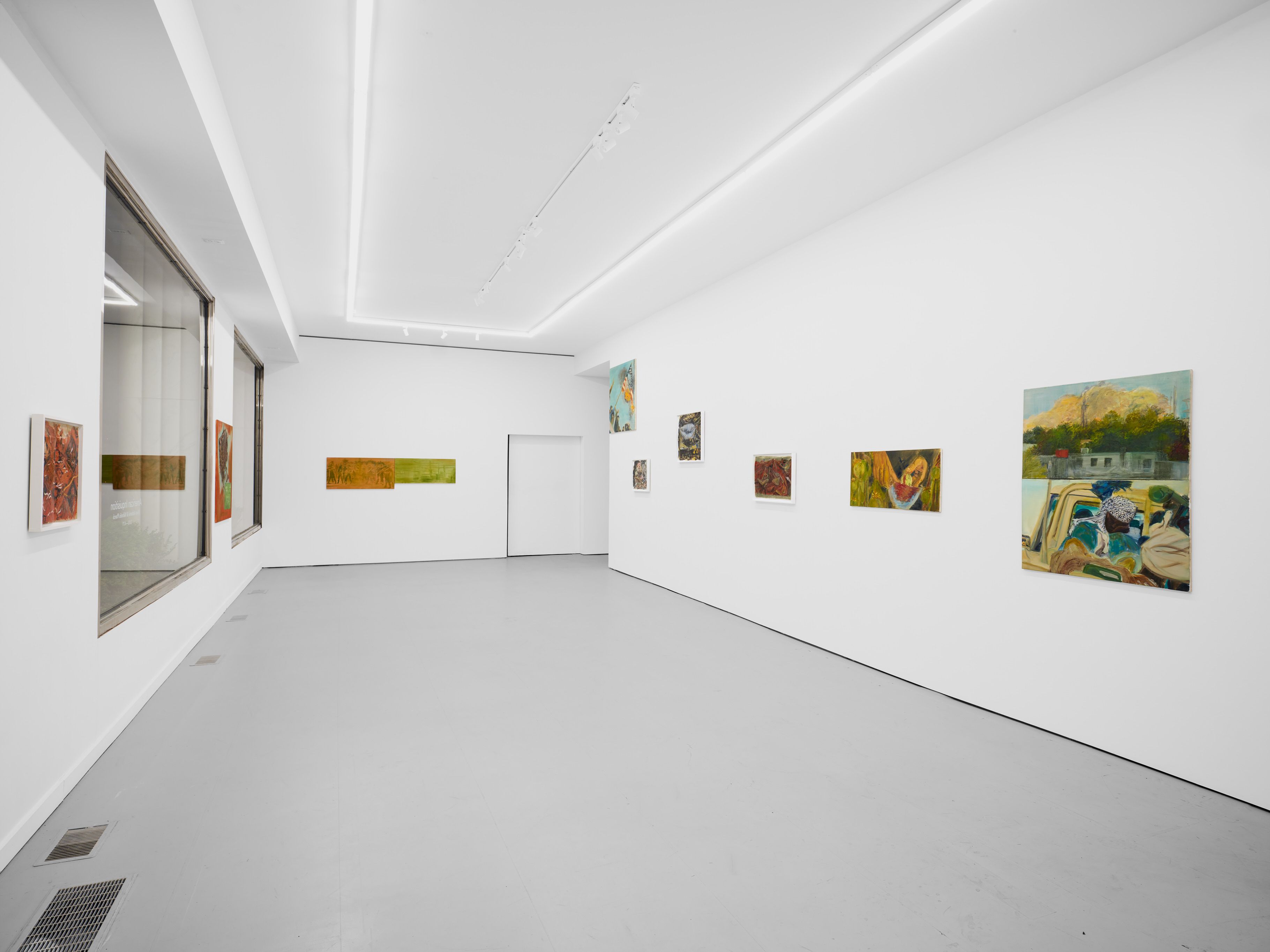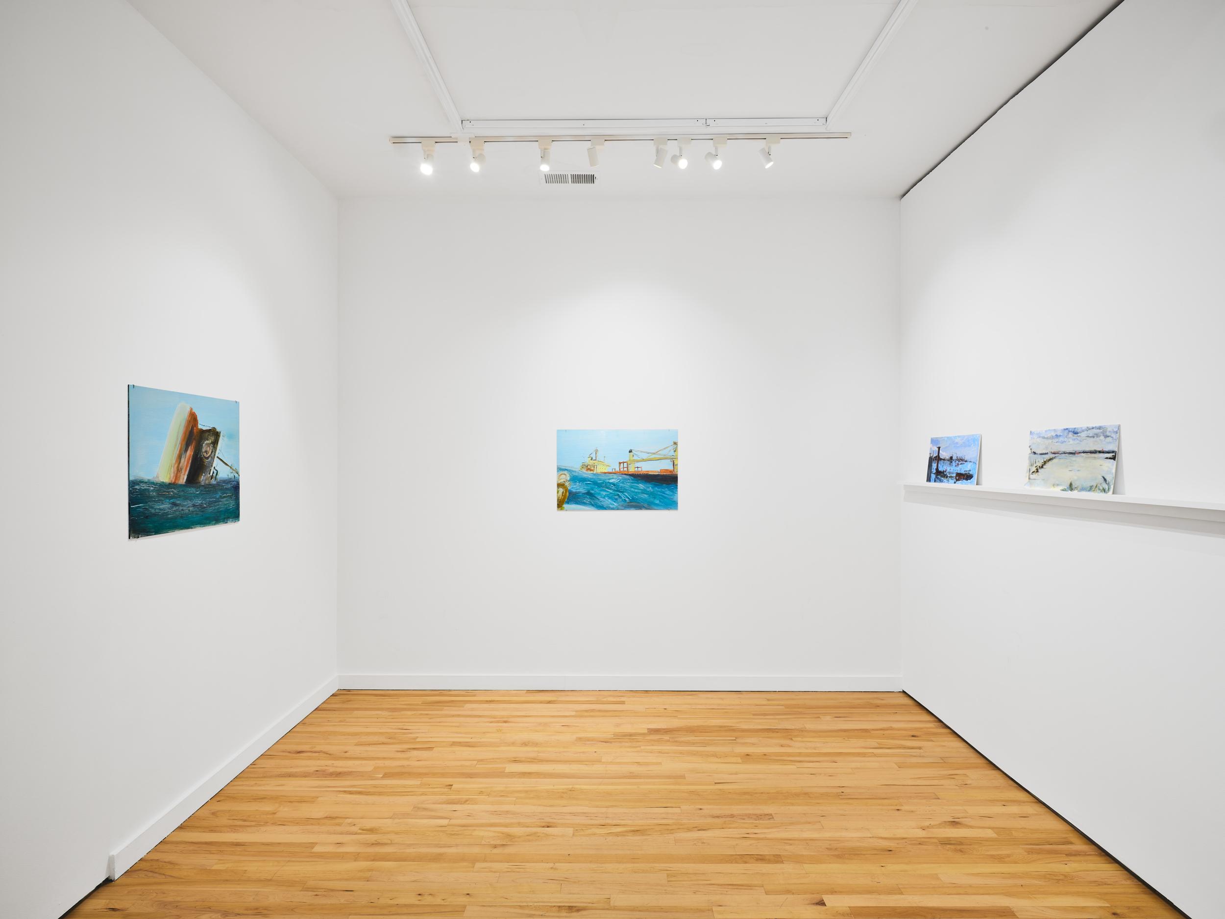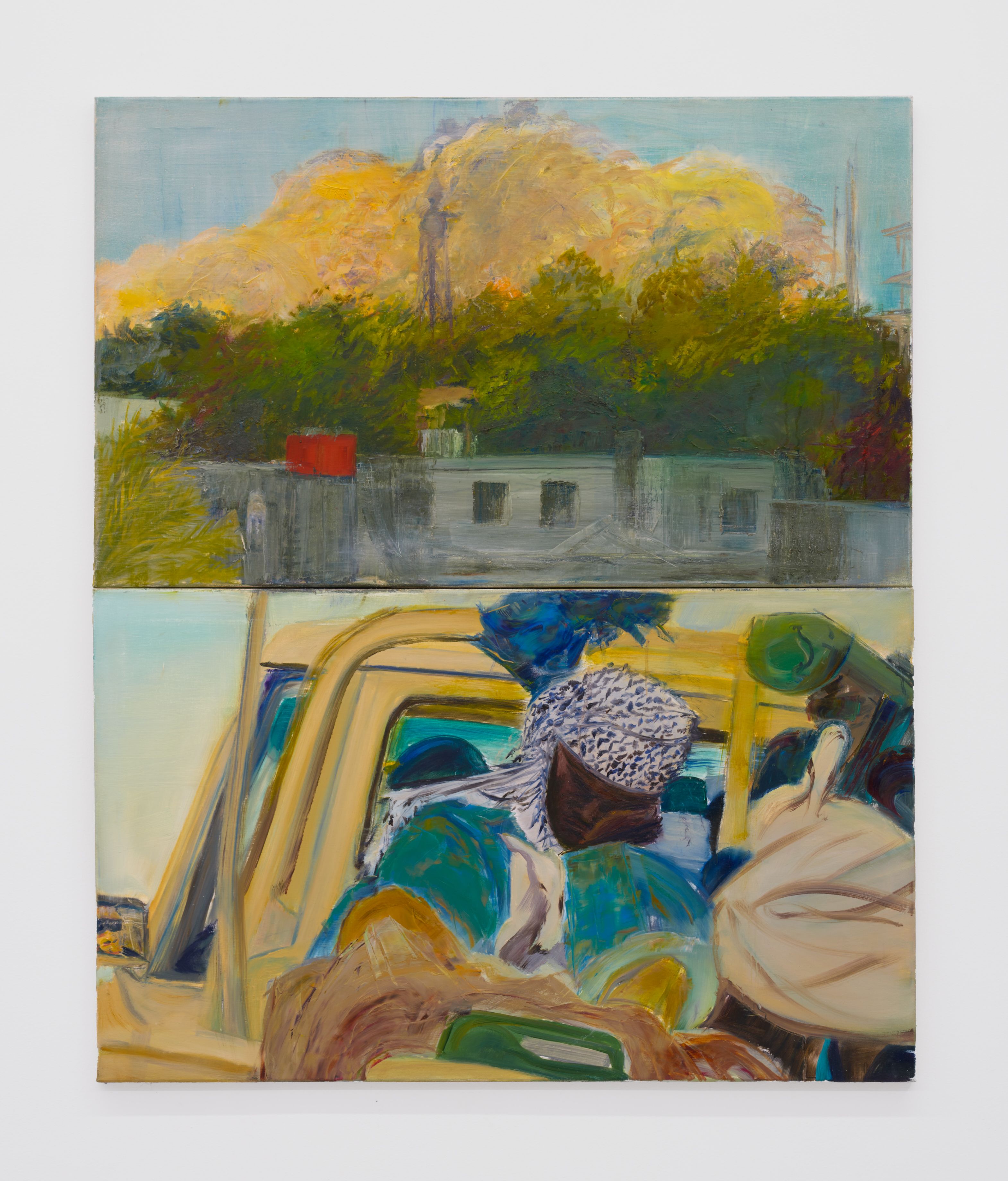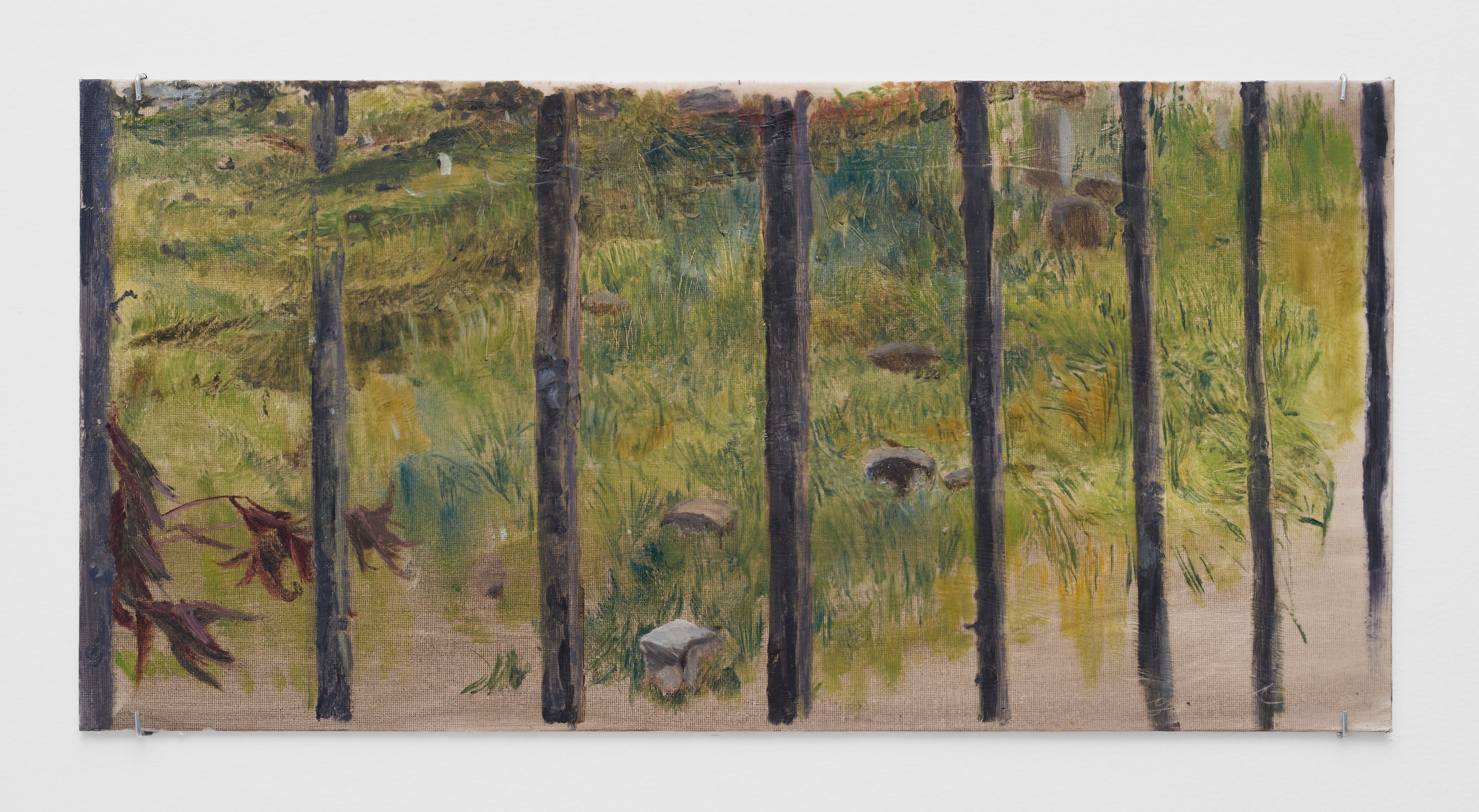 Addanki’s work is a visual essay, offering us an opportunity to read, and Planck extends this mirror into the viscerality of deeper landscape, of how an artistic practice can perhaps teach us a moment of disalienation, and critical engagement. Water soluble oil on wax paper, water soluble oil on wax paper, water soluble oil on wax paper. Cuts and etches. Handworked canvas. The monocrop here has caught fire, and in the drop perceived through the painting, you will see tears in the tent, chaos, and breathing memories of ambient red, a smog that resides in the inner soul of your lungs. In what is addressed as a Desert Study, the rug’s print struggles to shine against the sand which is also red. The door is seen to be open, not to an outside, but to a closeted interior, dried fungal spores leaking through the walls. A slippage into a New York archipelagic blue canopy for the goods from the Atlantic, ikea : fog : end points in the oceanic highway : an east after the west : floody gaze in the air. Between the bridge over the beautiful sky and the grass that grows from the sand, it is difficult to say much else. Theory has been painted. Persistence, stresses for a pause, and as Fred Moten once said in a poetry reading, “I don’t want to talk about those motherfuckers. I just need you to know that this shit is killing you too.” Did you know that we could play jazz on a shallow tide day right next to that grass under the bridge. What I describe as the grass might just be the twigs left behind, but sometimes the gift of the painting is to not know the answer. The blue breaks the measurement of the frame.