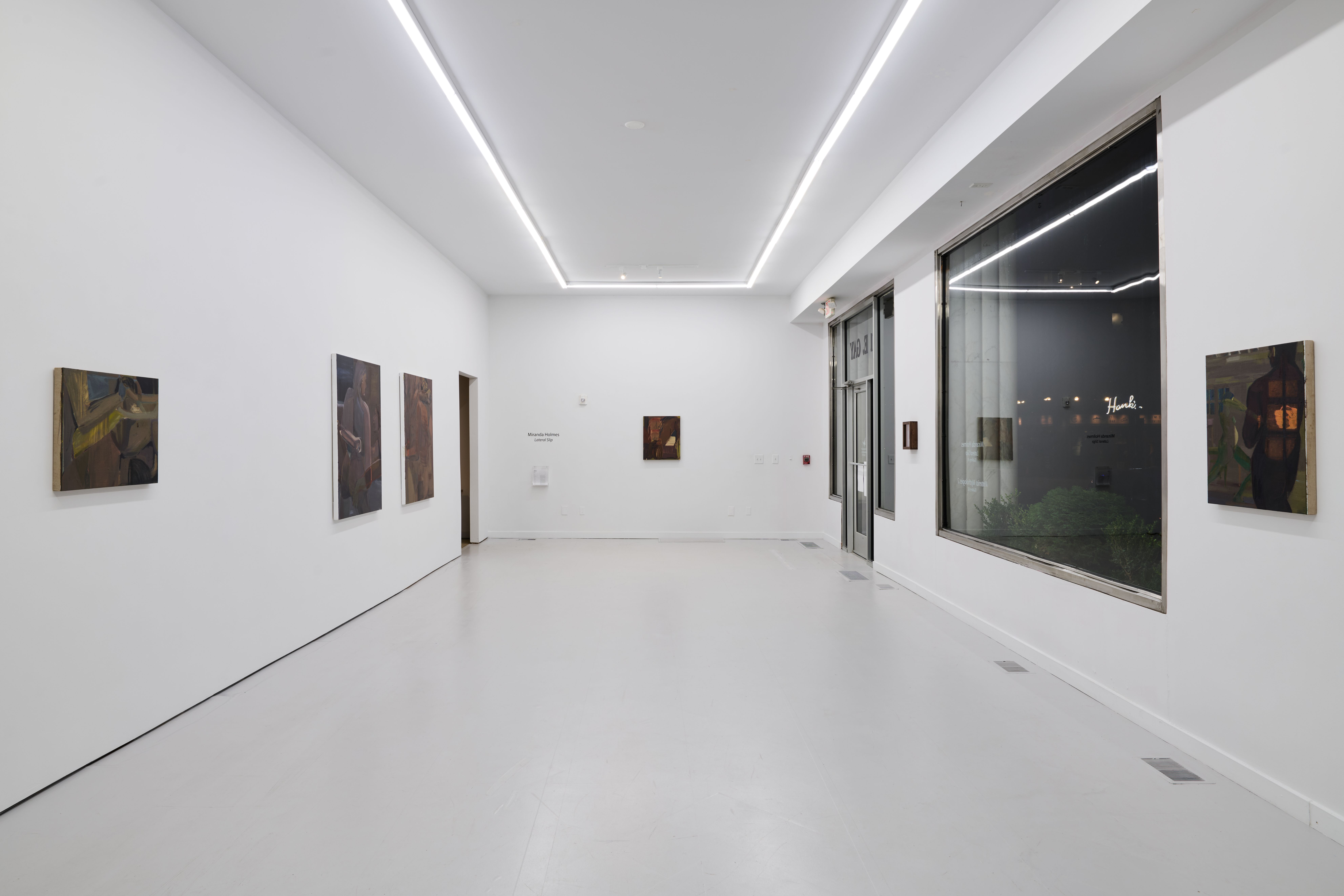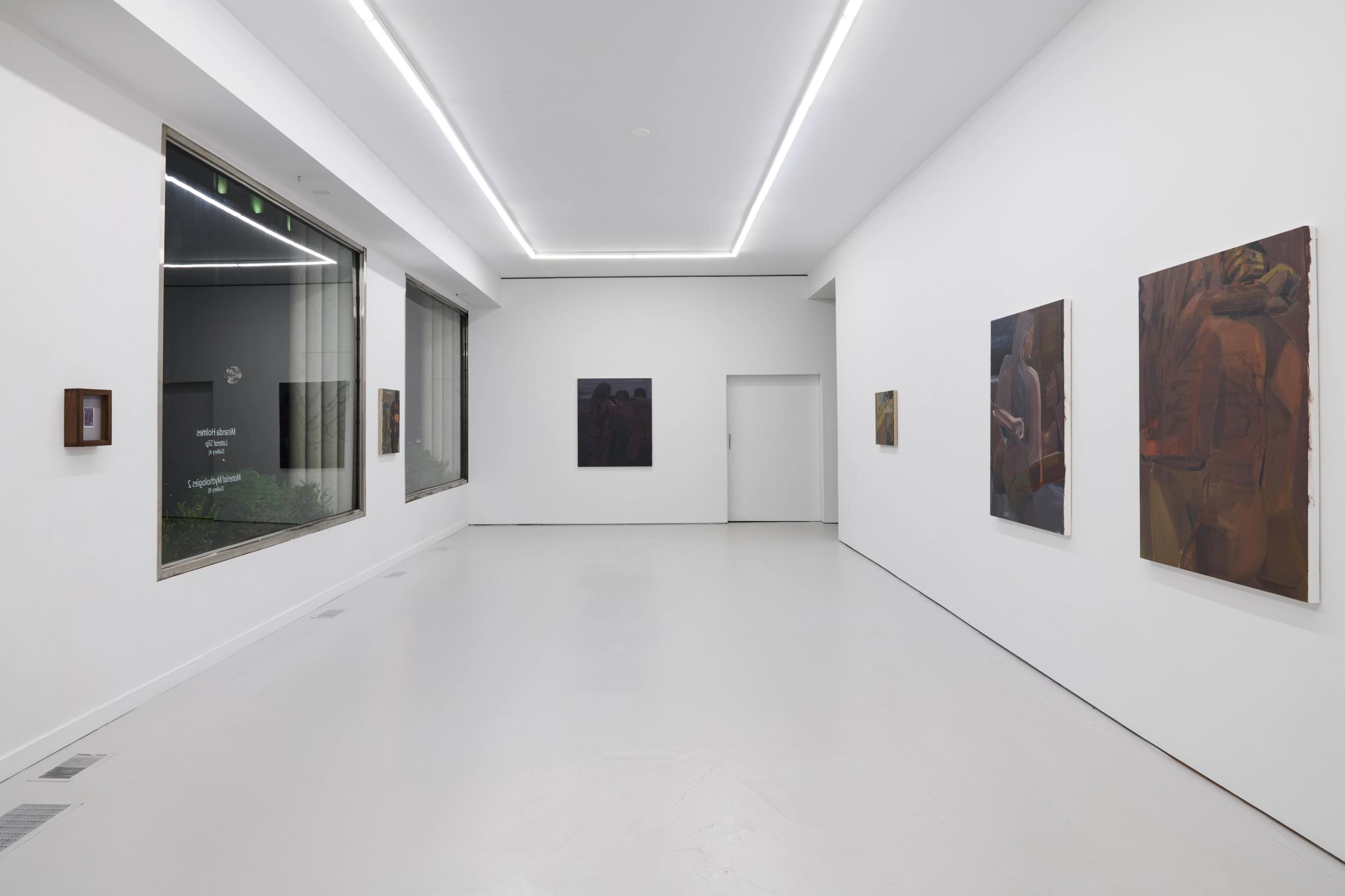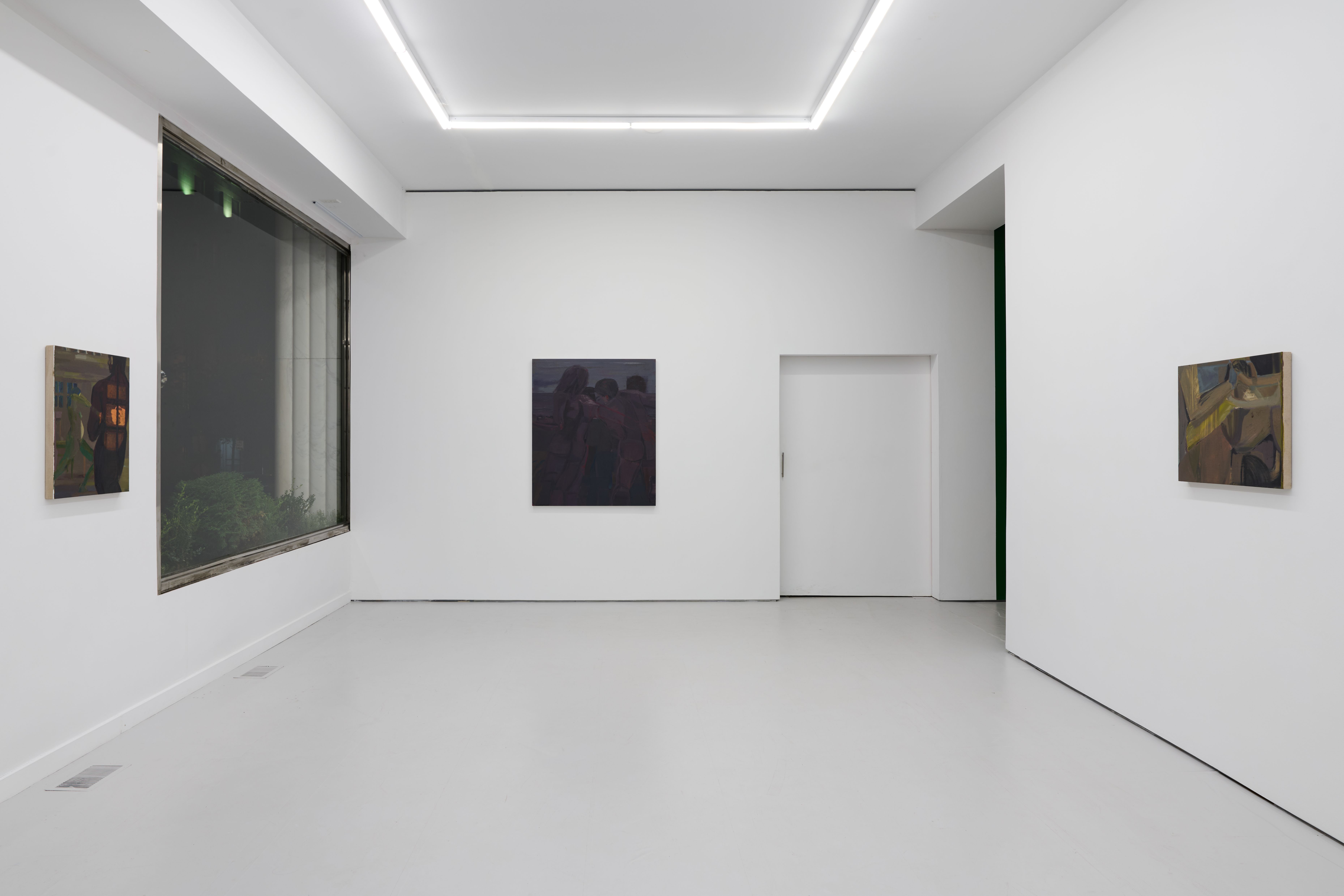 Rendered in a sunken color palette, the hazy nocturnal atmosphere of these paintings evokes the difficulty of interpreting the shared space of a relationship. Even the seemingly most straightforward depictions, such as the melting embrace of two lovers in the work, Low Heat, reflects the aporia of relationships. The ferocity of the catapult into the lover's arms almost overshadows the affection of the embrace, pointing to the fact that physical contact serves just as often a means of avoiding intimacy as establishing it. While Holmes' oeuvre is populated by one figure staring down another, the more precarious micromoment of mutual eye contact rarely takes place. In her painting, American Wavers, which travels outside the confines of the domestic interior to an equally claustrophobic political demonstration, Holmes leverages the disengaged stare of the participants for maximum eeriness, leaving the viewer to wonder whether this is a march of solidarity or a subtle display of one-upmanship.