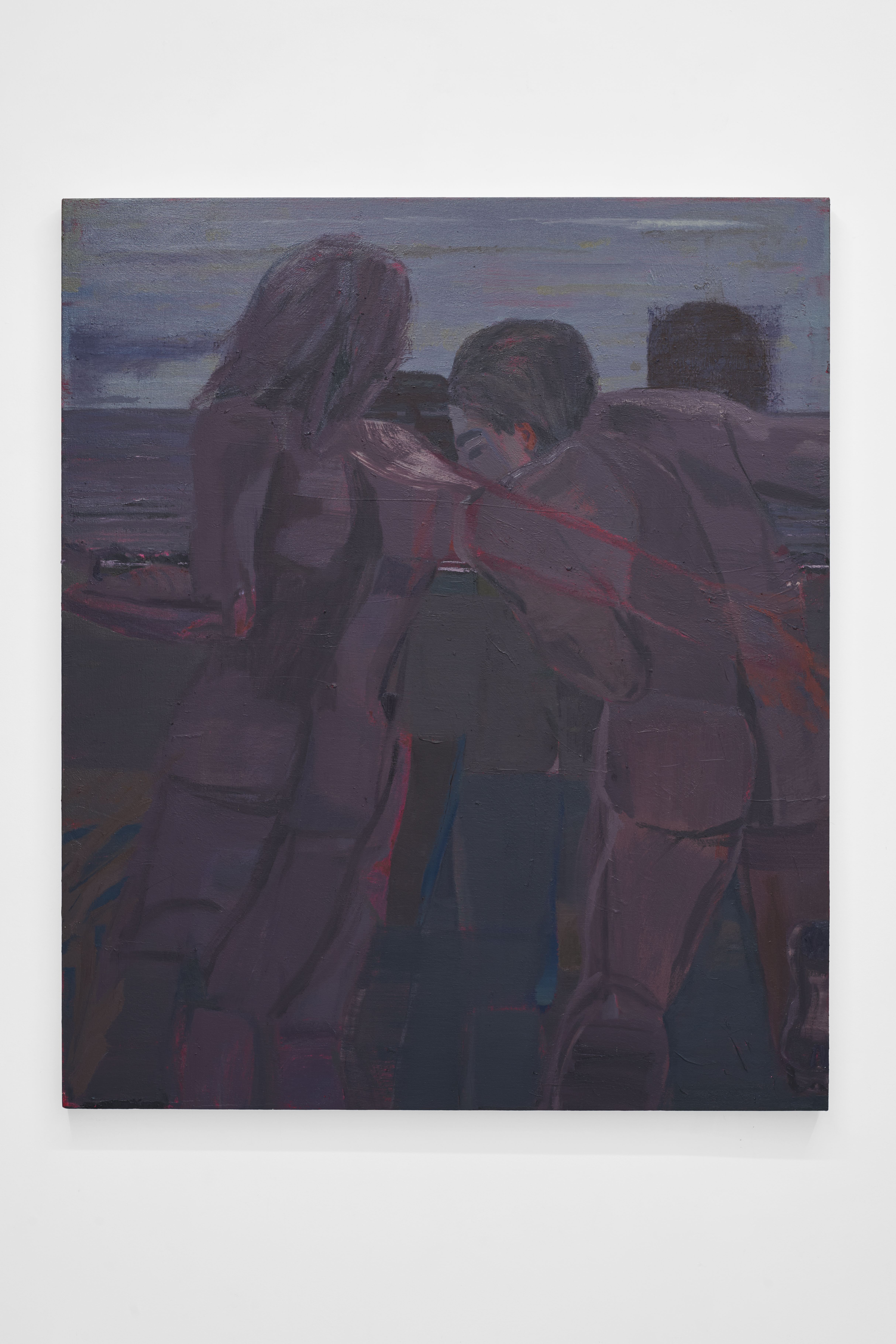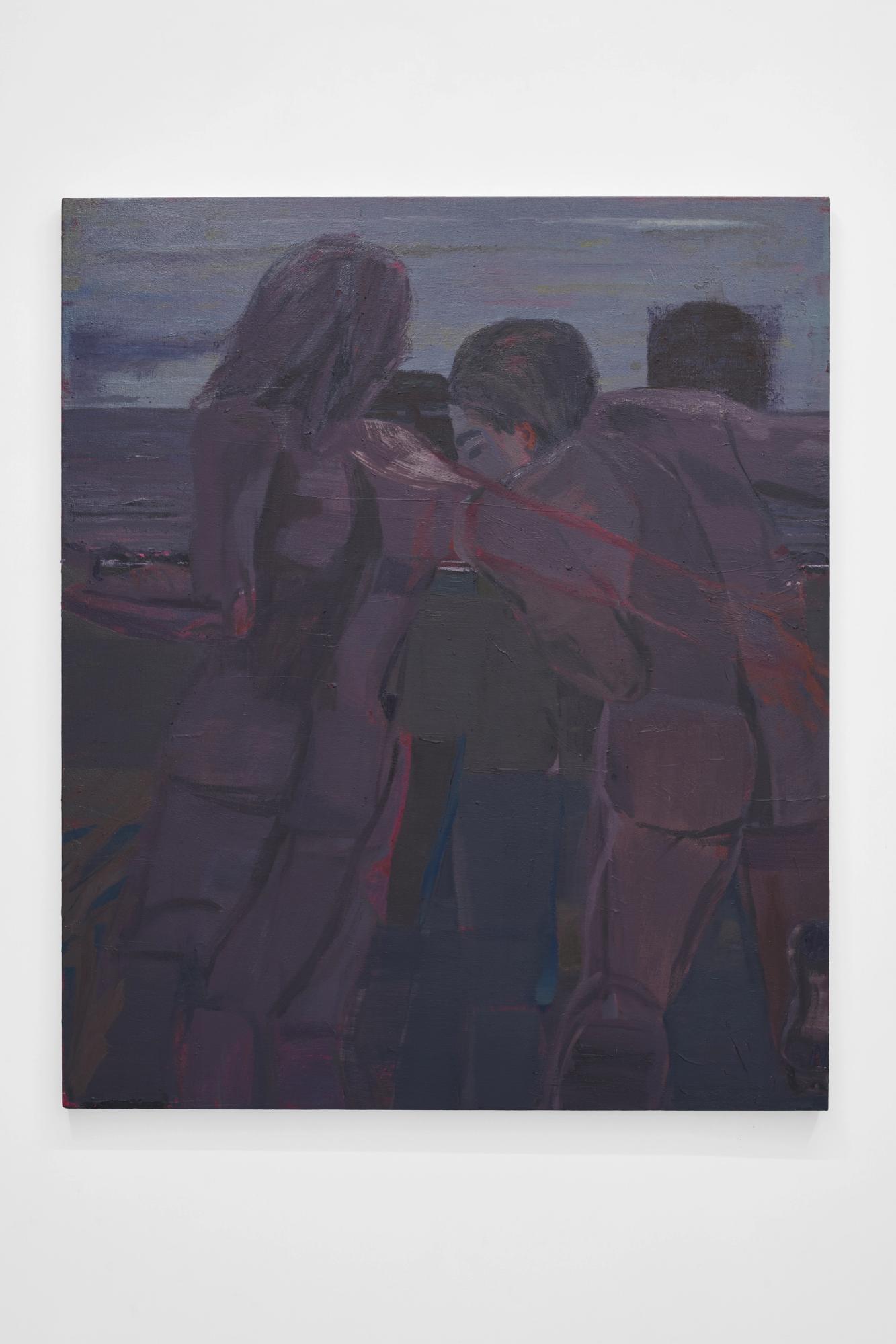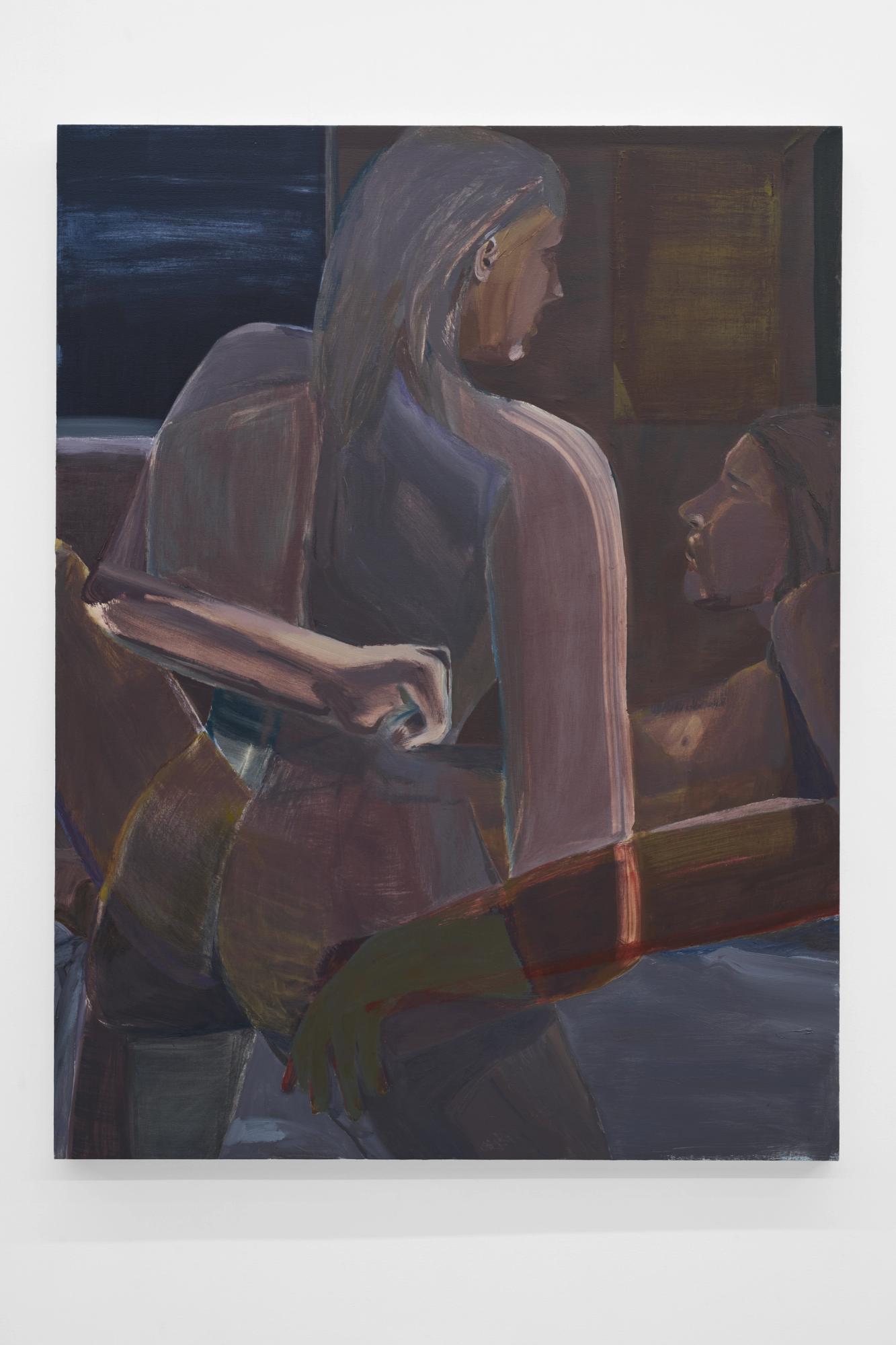In one of Holmes' twilit scenes, Hinge Point, a mauve woman tensely approaches a reclined figure with a fist clenched behind her back. What is the gesture's intent? Is it an expression of secrecy, resentment, desire? The other figure, staring into space, doesn't register the approach. Subtly attuned to interpersonal dynamics, Holmes' layered films of paint give a sense of porous spillage from one body to the next, as the scales of the encounter tip from balanced intimacy to longing desperation. This is one of Holmes' foremost talents: the ambiguous gestures of her works are capable of being interpreted backwards and forwards, once as the evocation of shared tenderness and once as the impossibility of knowing the person one loves.