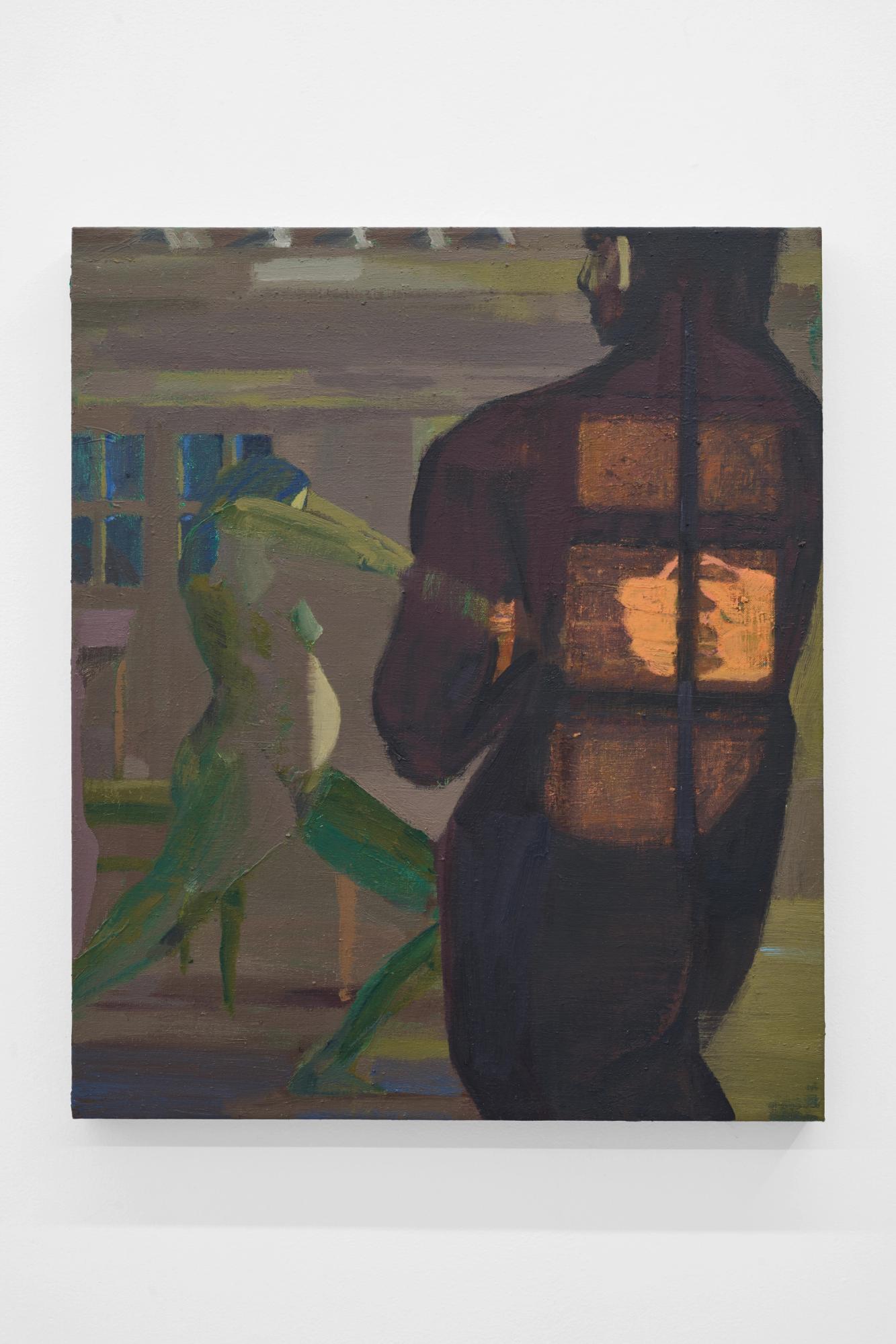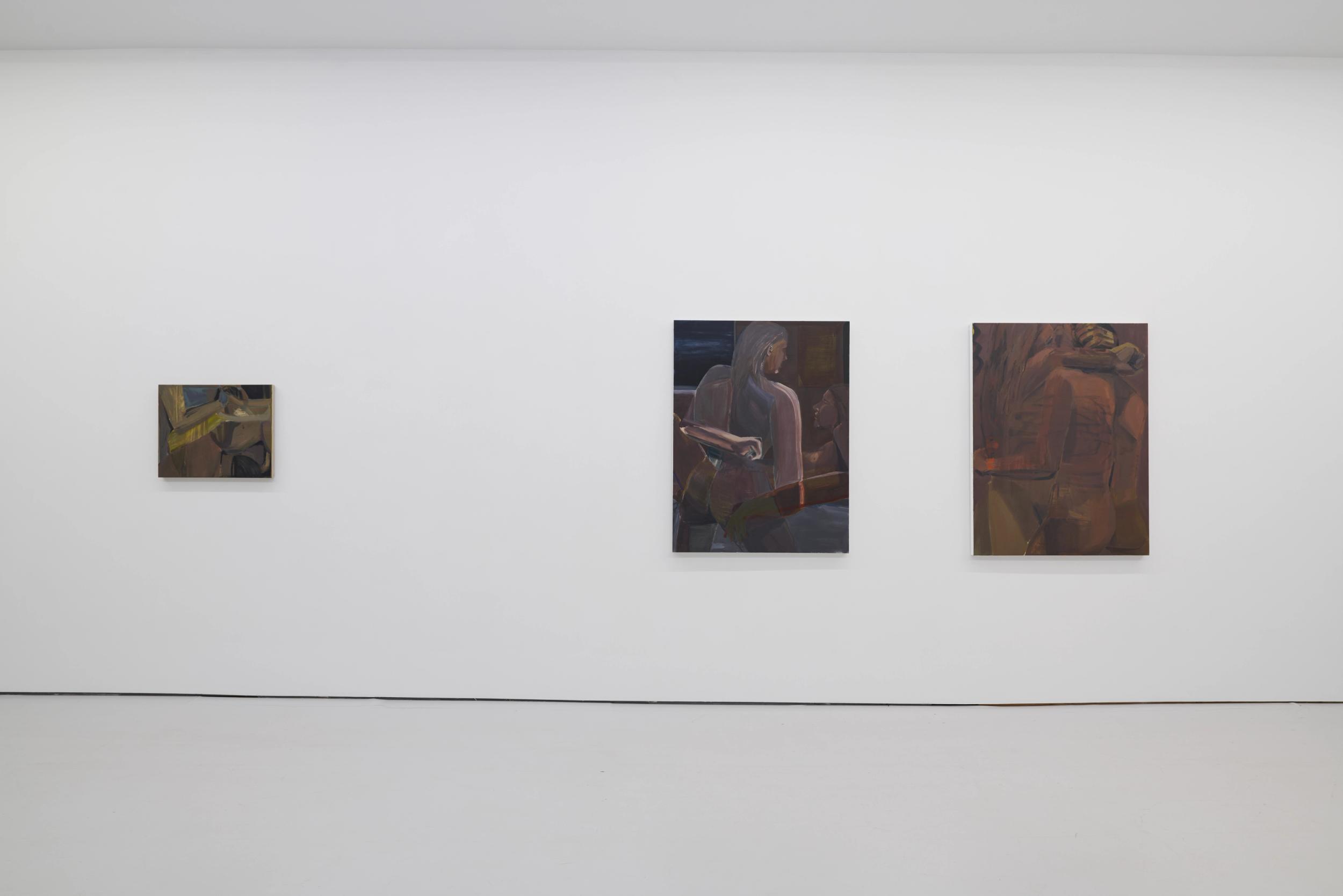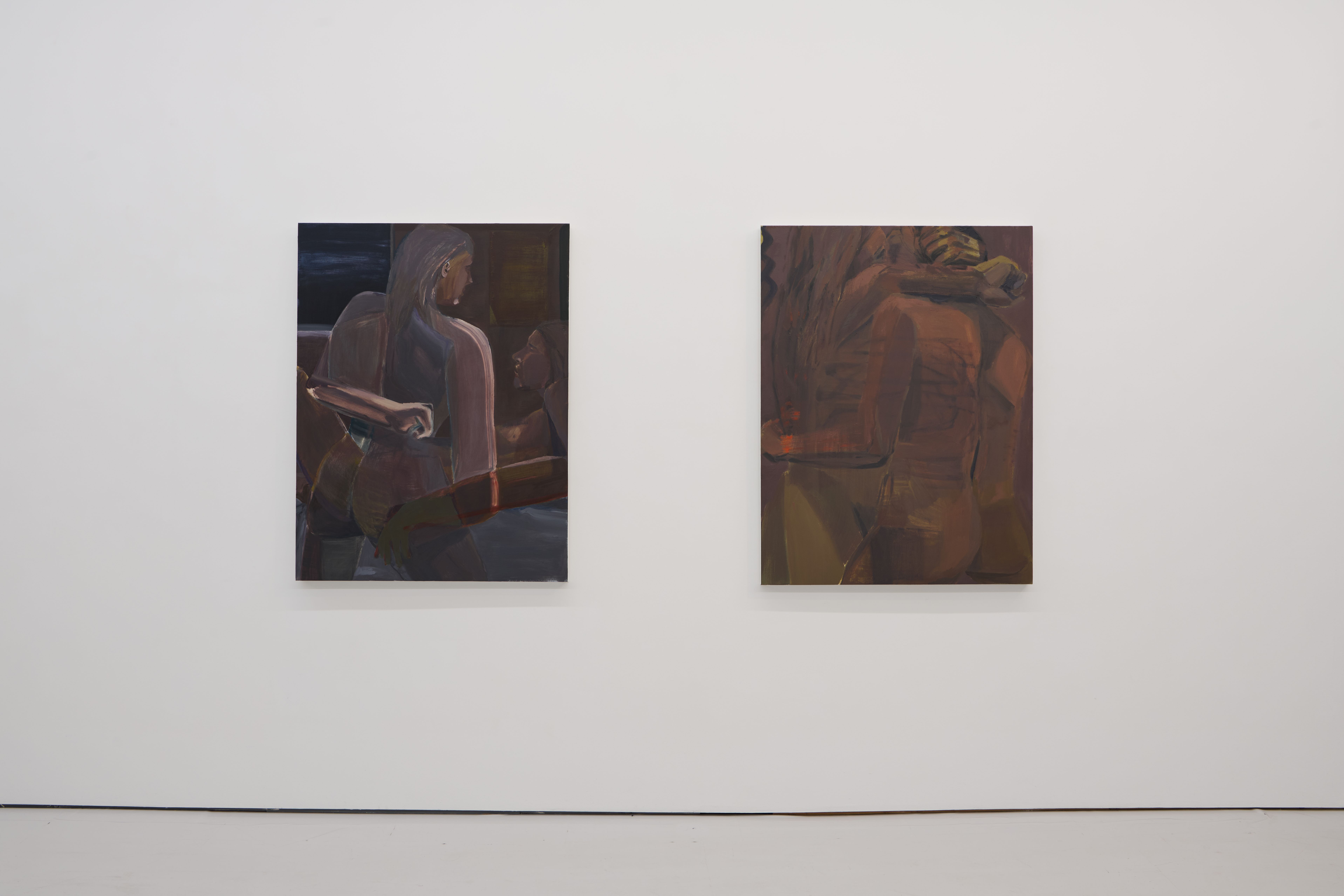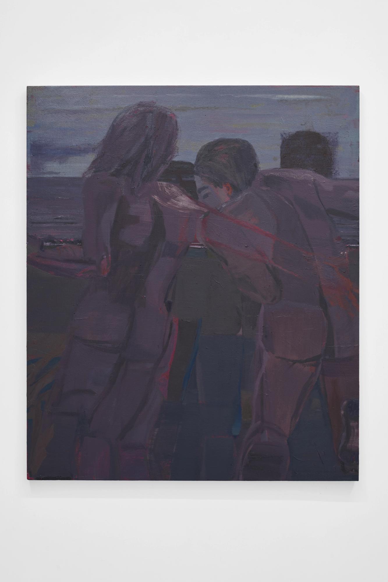 In one of Holmes' twilit scenes, Hinge Point, a mauve woman tensely approaches a reclined figure with a fist clenched behind her back. What is the gesture's intent? Is it an expression of secrecy, resentment, desire? The other figure, staring into space, doesn't register the approach. Subtly attuned to interpersonal dynamics, Holmes' layered films of paint give a sense of porous spillage from one body to the next, as the scales of the encounter tip from balanced intimacy to longing desperation. This is one of Holmes' foremost talents: the ambiguous gestures of her works are capable of being interpreted backwards and forwards, once as the evocation of shared tenderness and once as the impossibility of knowing the person one loves.