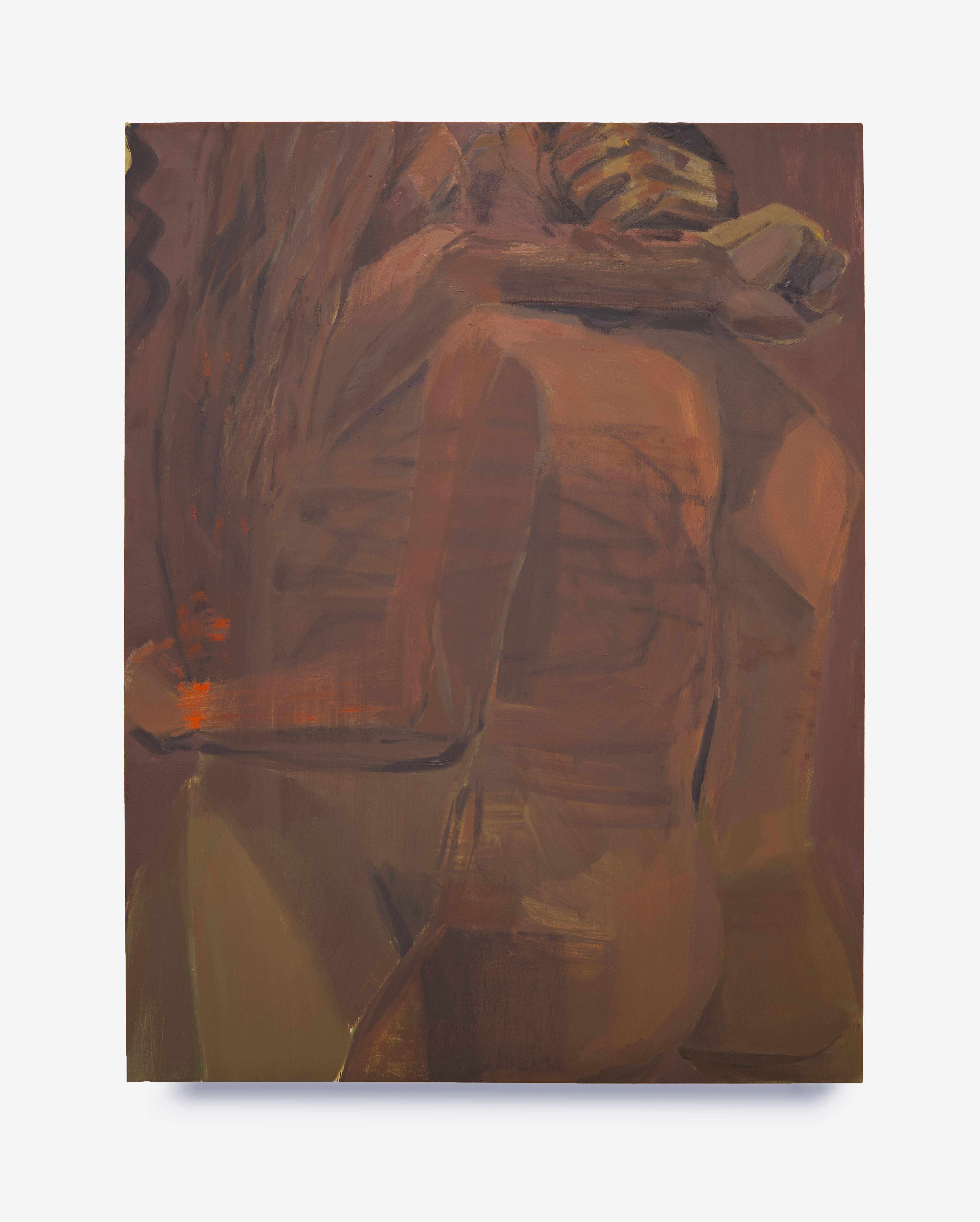 Many contemporary artists who skirt the boundary of abstract and figurative painting tend to draw a link between the libidinal substance of paint and the erotic subject matter of their works. In interviews, Holmes has expressed her fondness for Amy Sillman—another artist that uses abstraction as a strange keyhole for glimpsing sexual postures while resisting objectification of the body. For Holmes, abstraction offers a tool for honoring the privacy of intimate acts and rendering the unique language cultivated between lovers. The viewer might intuit the presence of a sexual act in an abstract painting but is not privy to the immediate reality of the lovers' experience. In this, Holmes' paintings not only test formal strategies, like mark making, to entangle bodies but also work to track the complex space within relationships where the boundaries of personhood waver and dissolve.