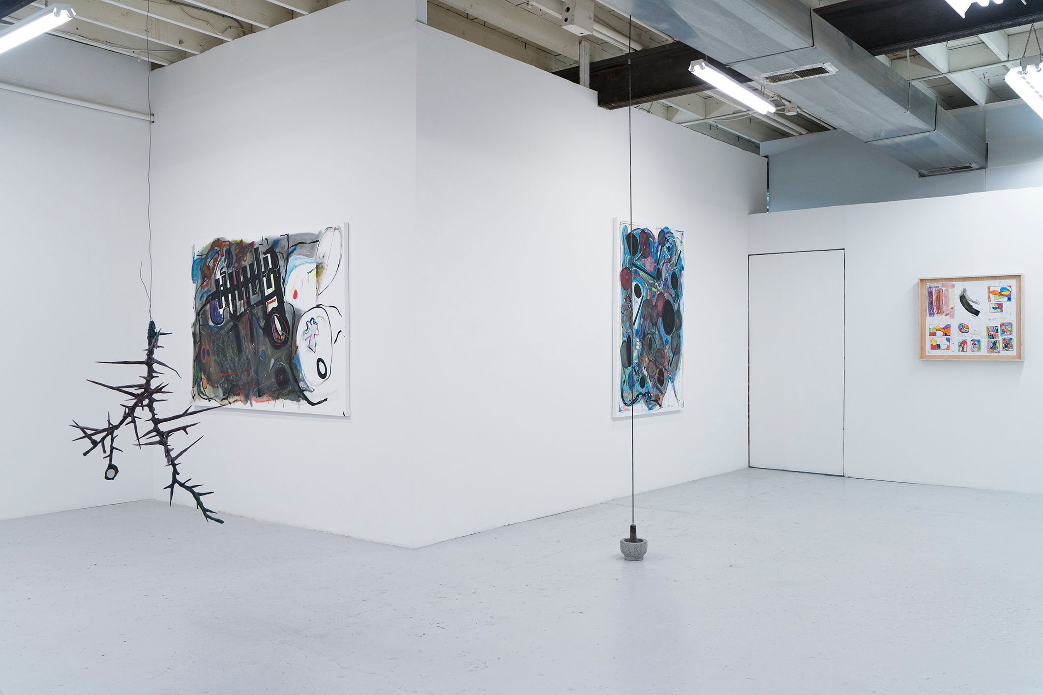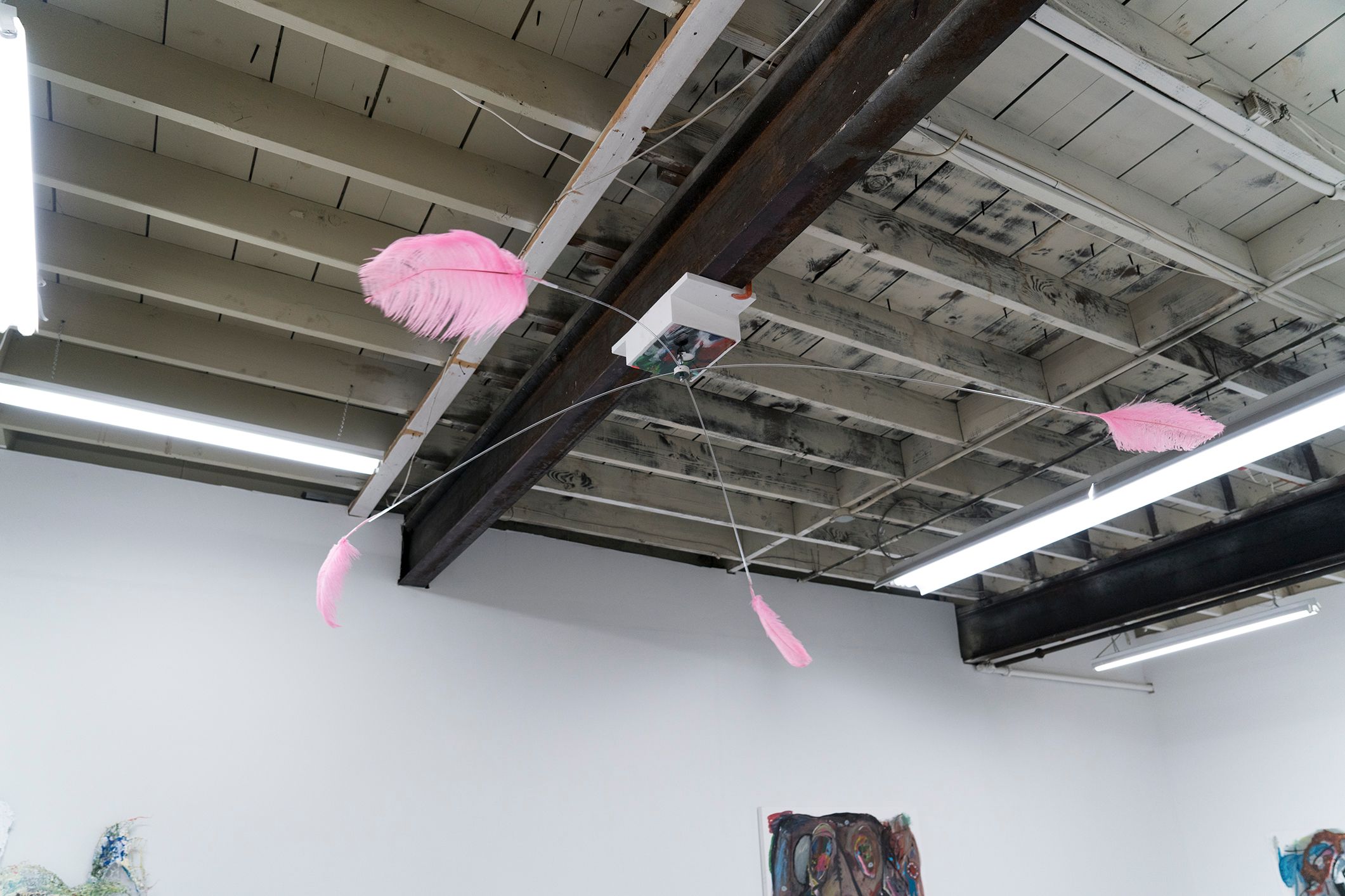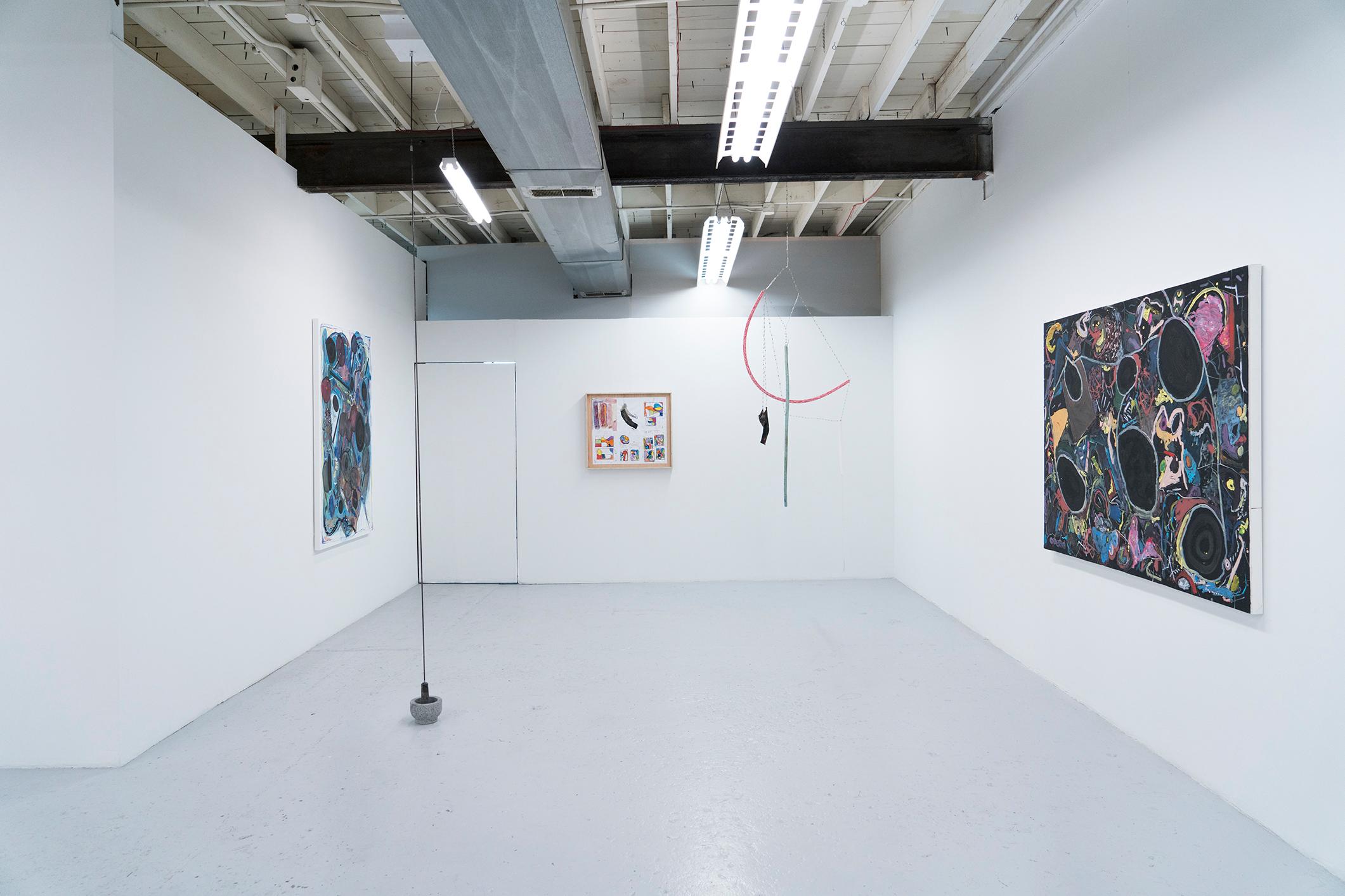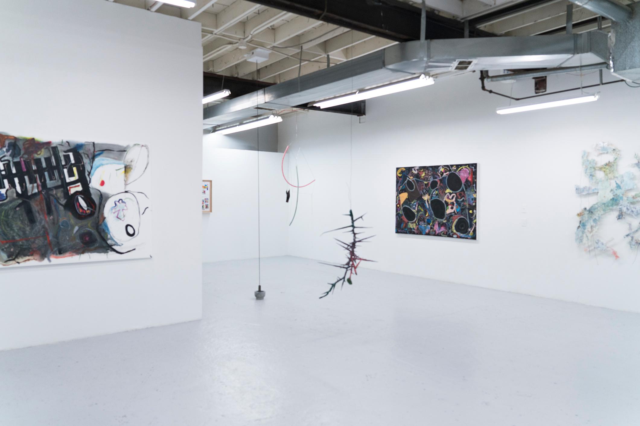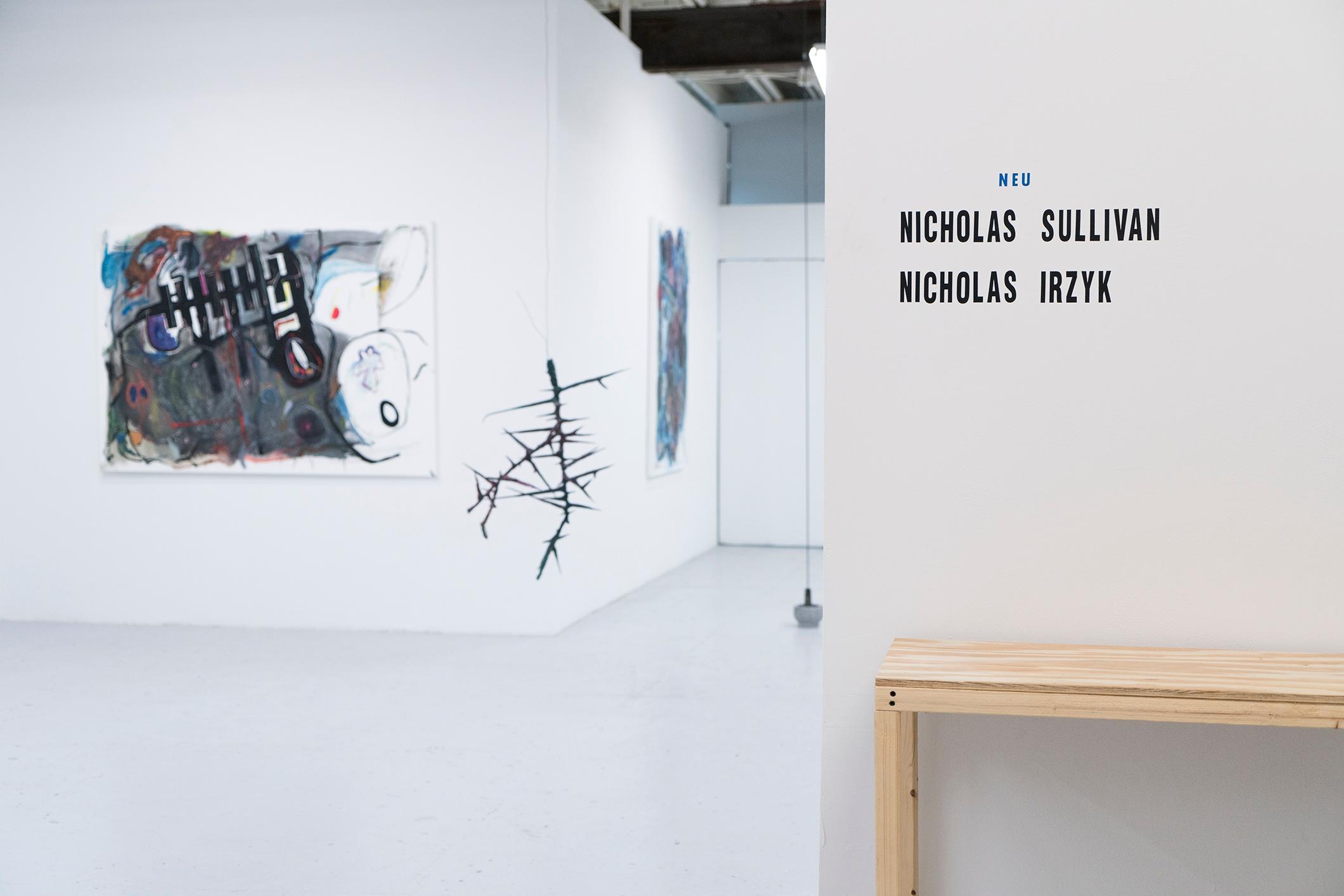 Sullivan’s sculptures and Irzyk’s paintings share a method of flattening. Sullivan’s spinning objects level out the typical sculptural experience - the objects move 360 degrees and the viewer remains fixed. Irzyk’s paintings are densely layered in thinned paint, pictorial elements develop and recede. Concerns of image v. picture v. object are contended with in both bodies of work. Sullivan’s plastic forms examine the relationship of line, both literal and graphic to surreal and cartoonish imagery while Irzyk places abstract painting against representation and re-evaluating the role of each language.