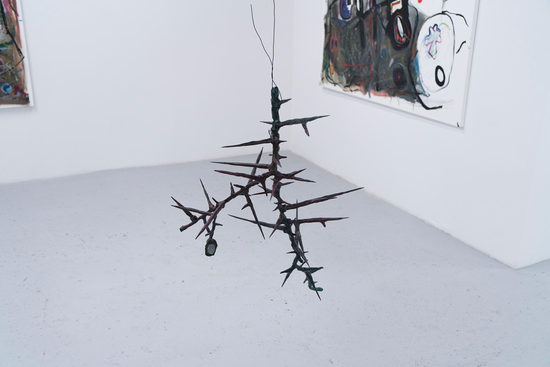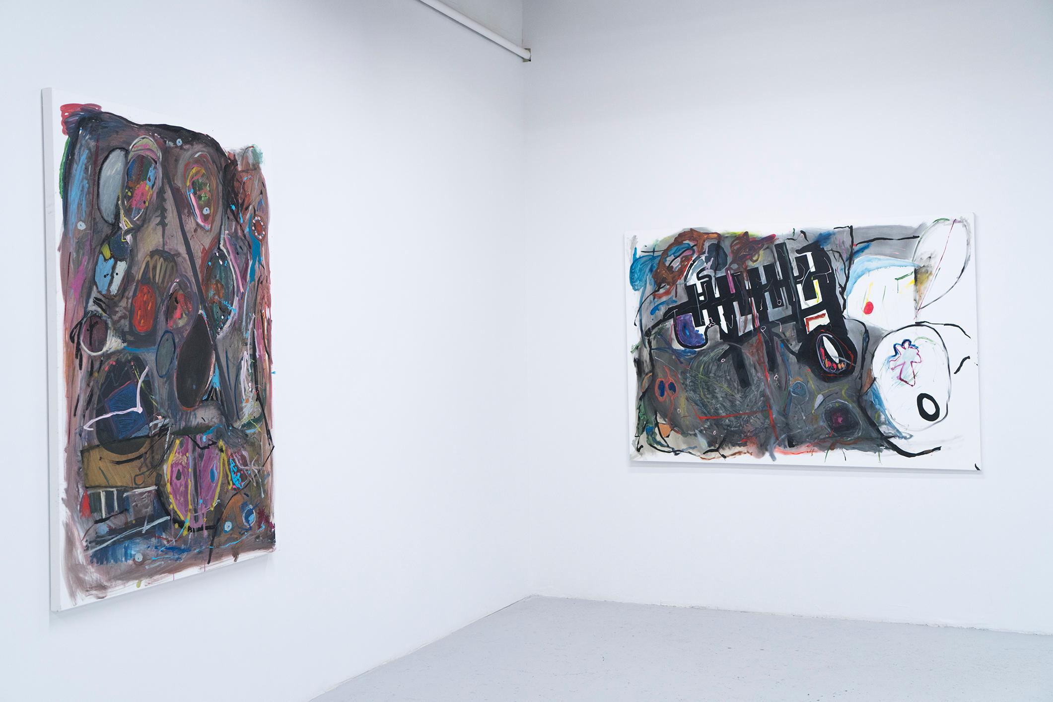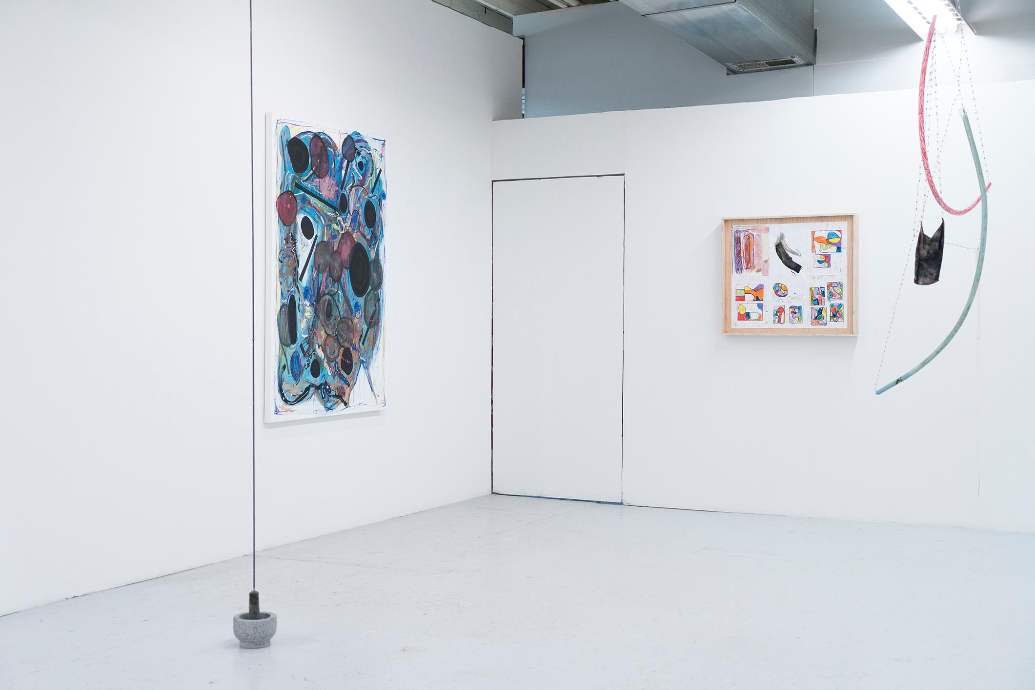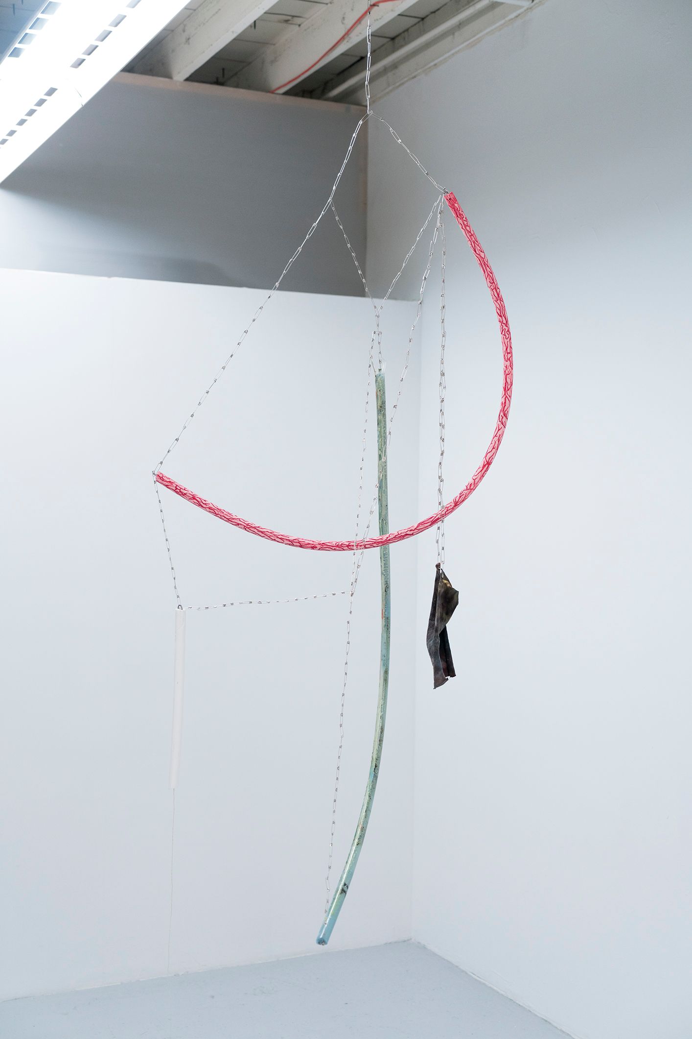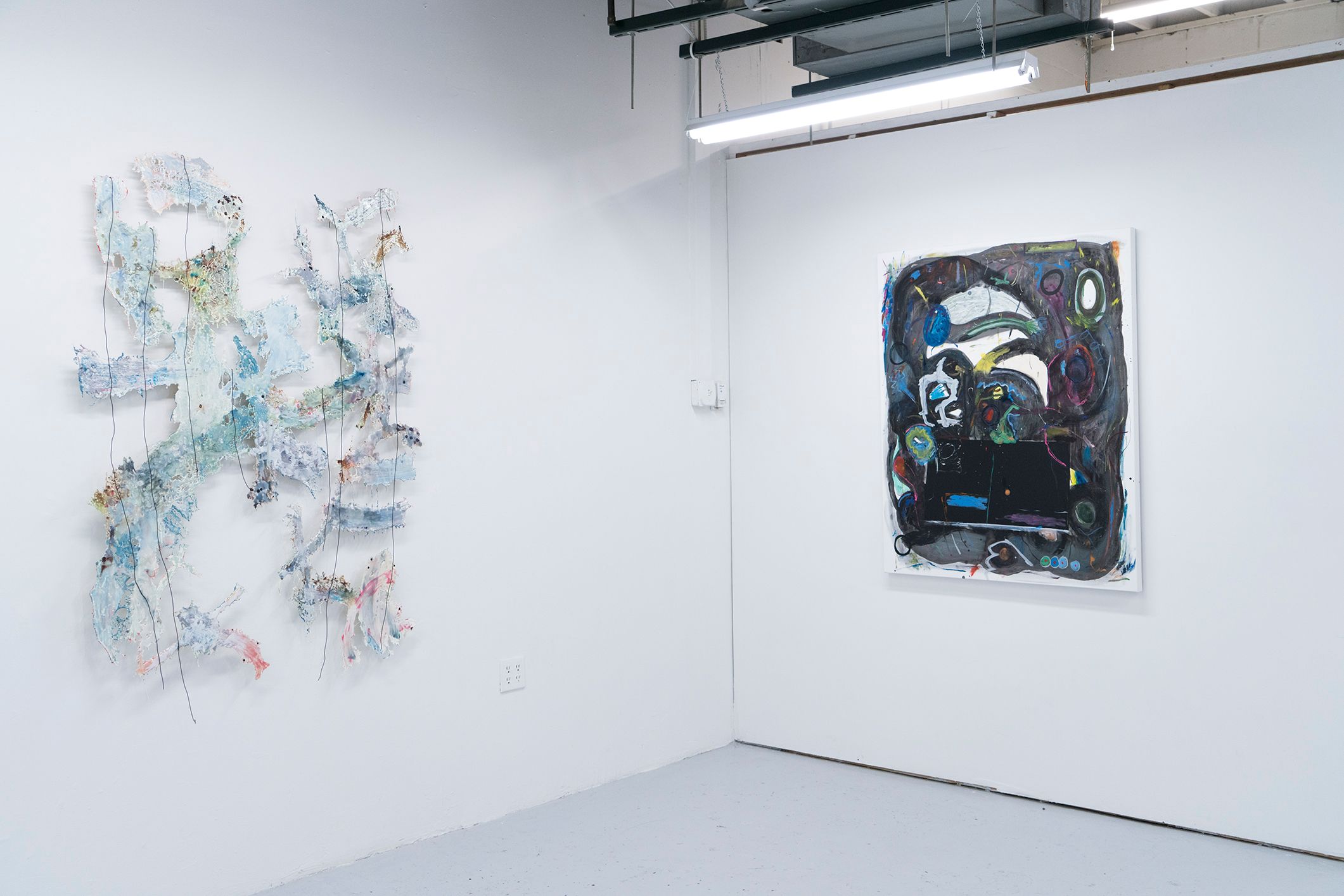 Sullivan’s sculptures and Irzyk’s paintings share a method of flattening. Sullivan’s spinning objects level out the typical sculptural experience - the objects move 360 degrees and the viewer remains fixed. Irzyk’s paintings are densely layered in thinned paint, pictorial elements develop and recede. Concerns of image v. picture v. object are contended with in both bodies of work. Sullivan’s plastic forms examine the relationship of line, both literal and graphic to surreal and cartoonish imagery while Irzyk places abstract painting against representation and re-evaluating the role of each language.