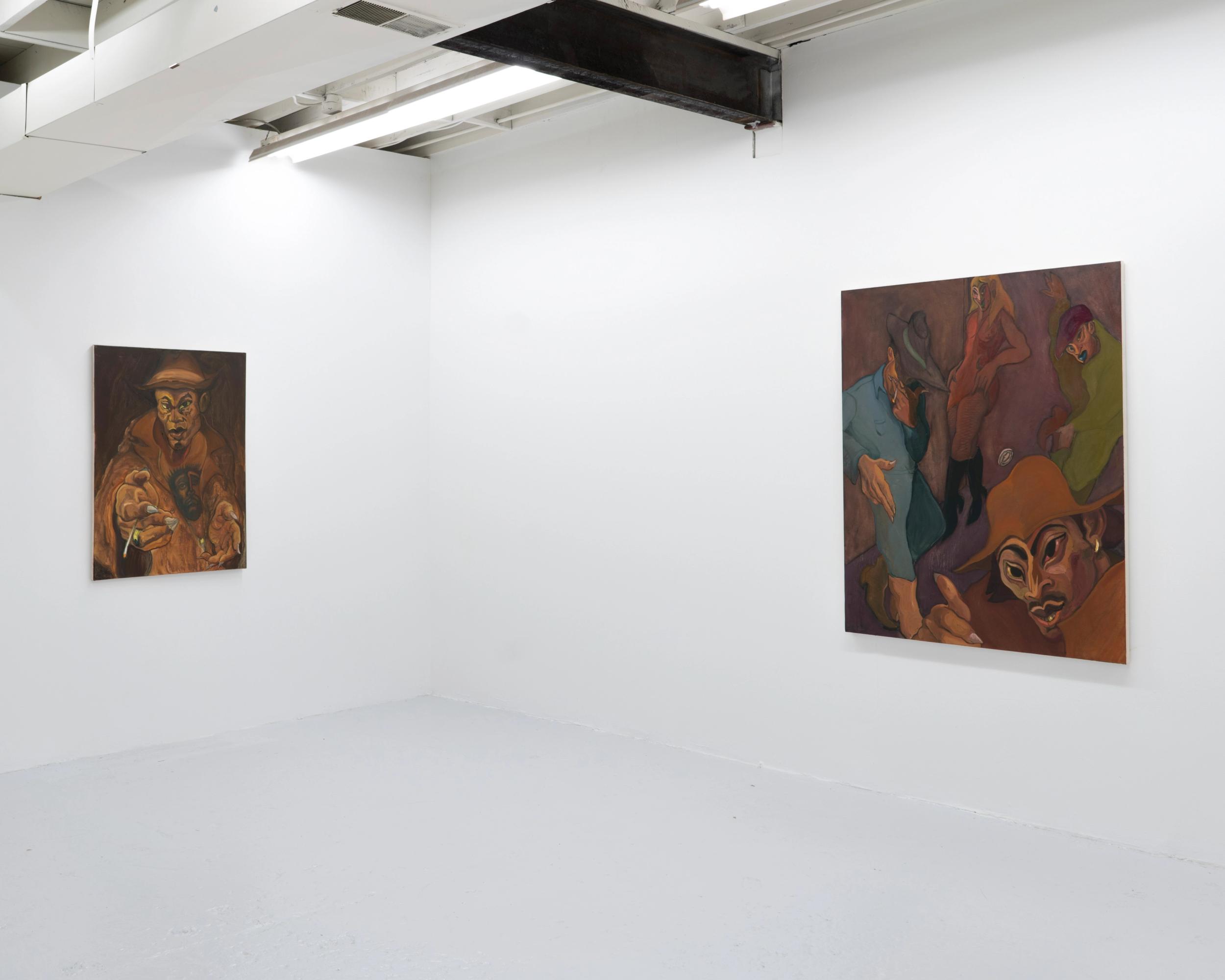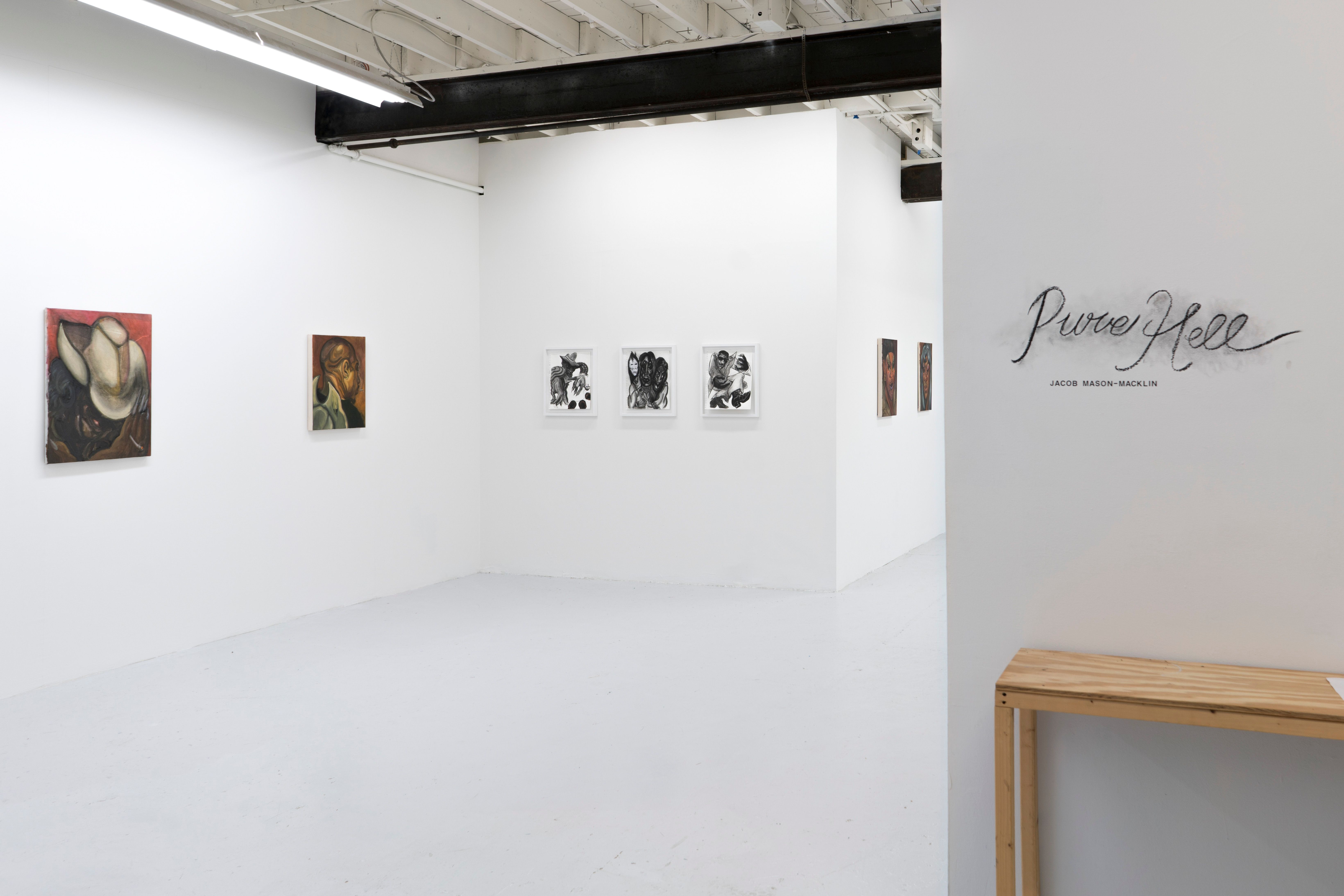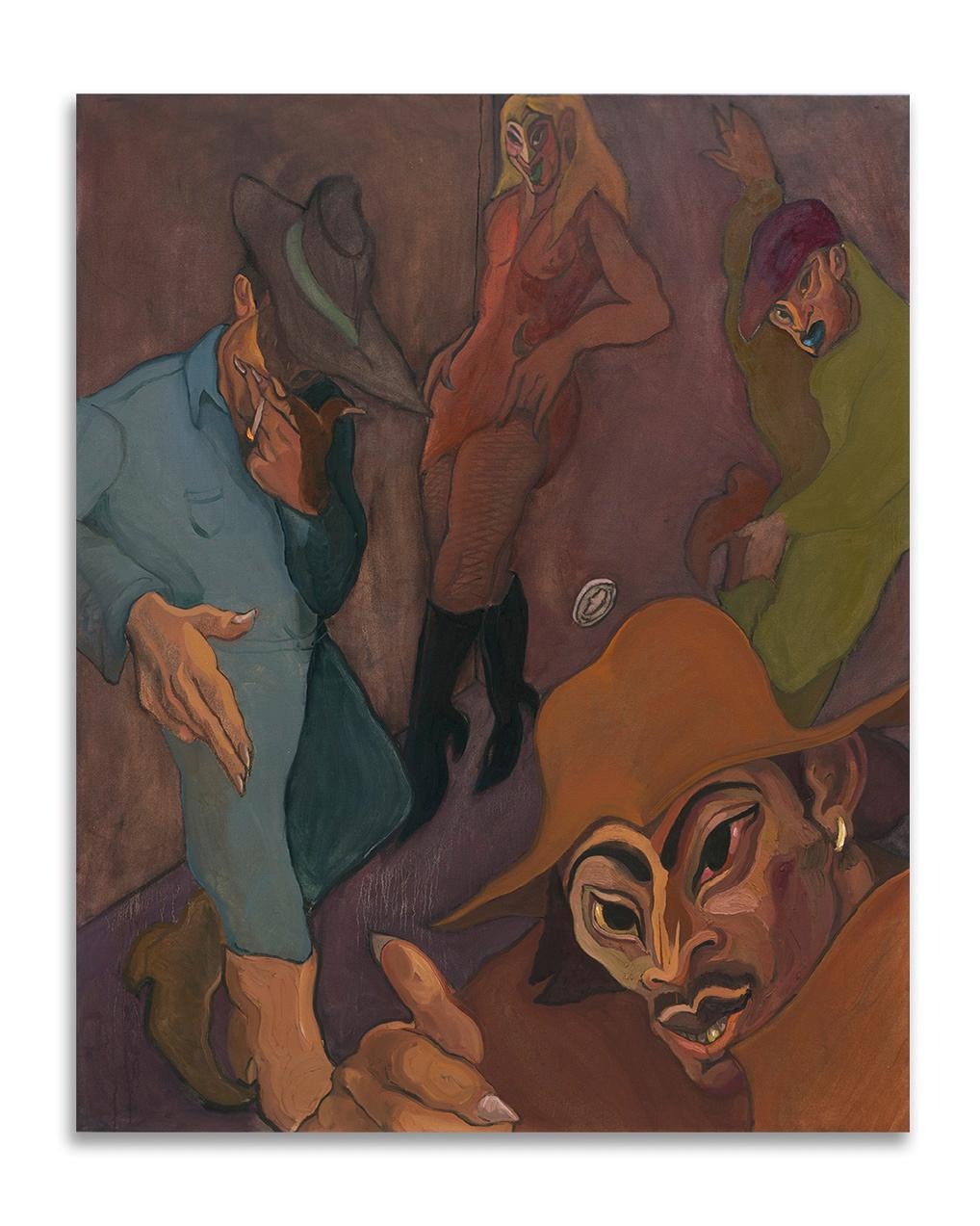 PURE HELL grows from a place of frustration and desire. Drawing influence from the growls ofRaw Power and the howls ofSoul Brother No. 1, spirited portraits of Street-Stompers twist N’ shout looking for a release. InsidePURE HELL the figures are off the dog collar with a bone to pick. Flesh transforms into masks adorned with war paint and threads are razor sharp. The Night-Prowlers are dressed to kill. Paint runs like an out-of-tune solo; a last-ditch frenzy caked on like cheap make-up. Brushstrokes animate the monkey on the back and record the unscratchable itch. UnderneathPURE HELLis an urge to unleash. The house has burned down and what’s lying beneath the ash is waiting around the corner.