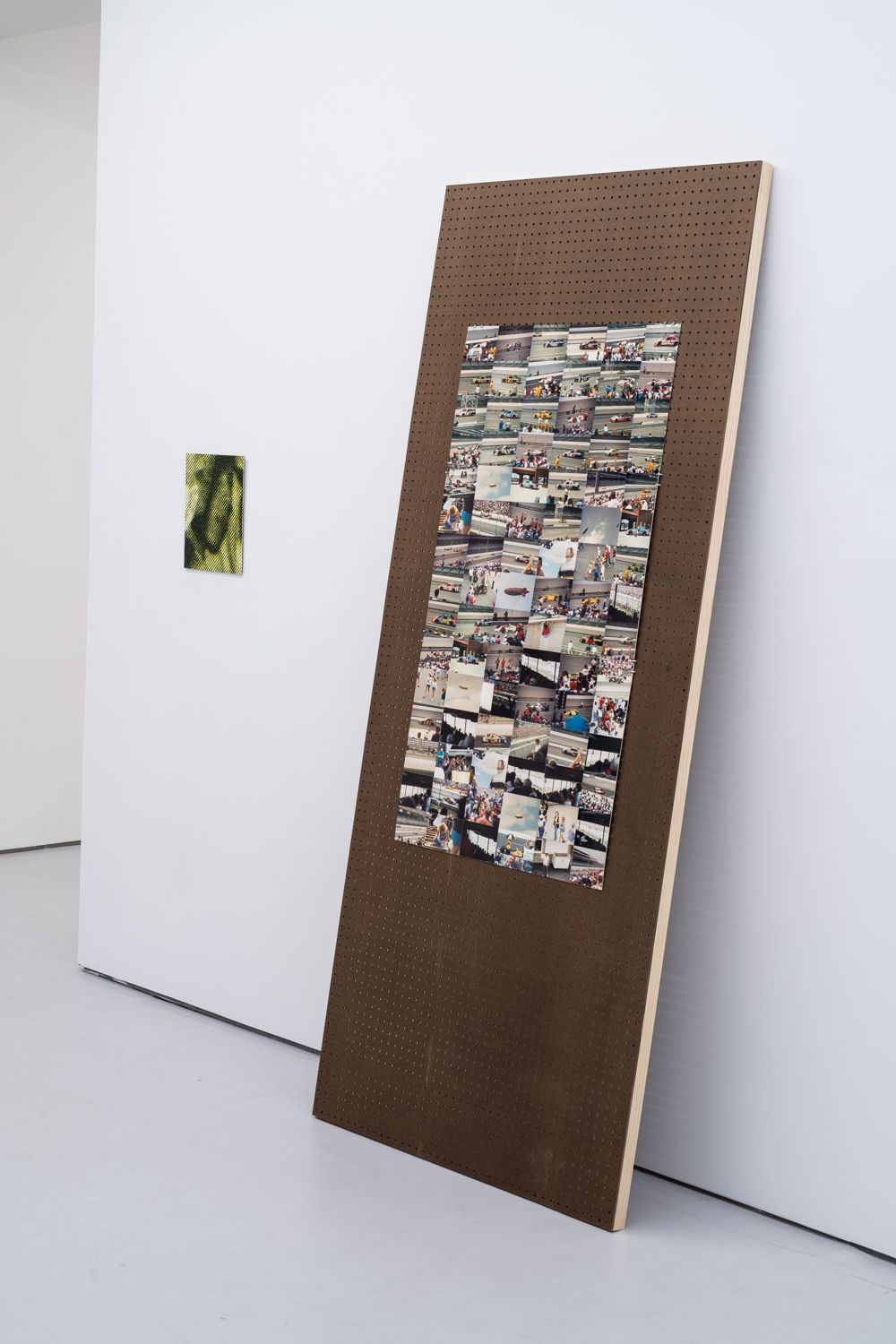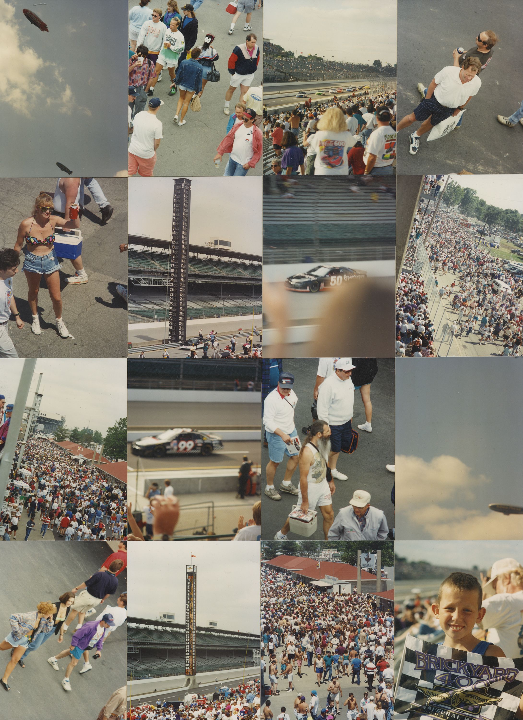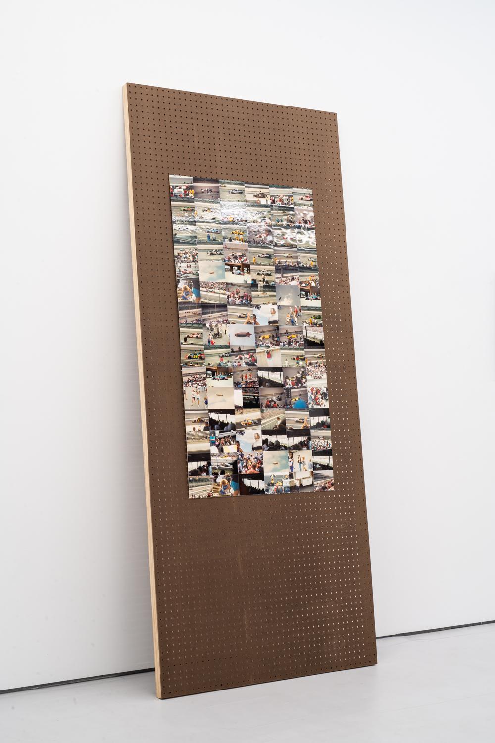 Lewandowski’s inclusion of drugstore photo prints from the Brickyard 400 NASCAR races, taken by his uncle in the mid-90s, serves as a conceptual anchor to his childhood while juxtaposing masculine imagery with the potential for alternative narratives. This symbolic gesture underscores the fluidity of identity and the multiplicity of experiences within the context of Indiana's cultural landscape while rooting the narrative in the artist’s specific lifetime. The tiled images distill the male gaze Lewandowski was surrounded by in his youth, the same that saturates many corners of the Midwest to this day: at once removed and fascinated by both competitive driver and captivated woman. Displayed on pegboard alongside traditionally masculine ephemera, the installation recalls garage walls – the space conventionally relegated to men within the suburban home – further accentuating the subconscious tension of being simultaneously detached and entwined.