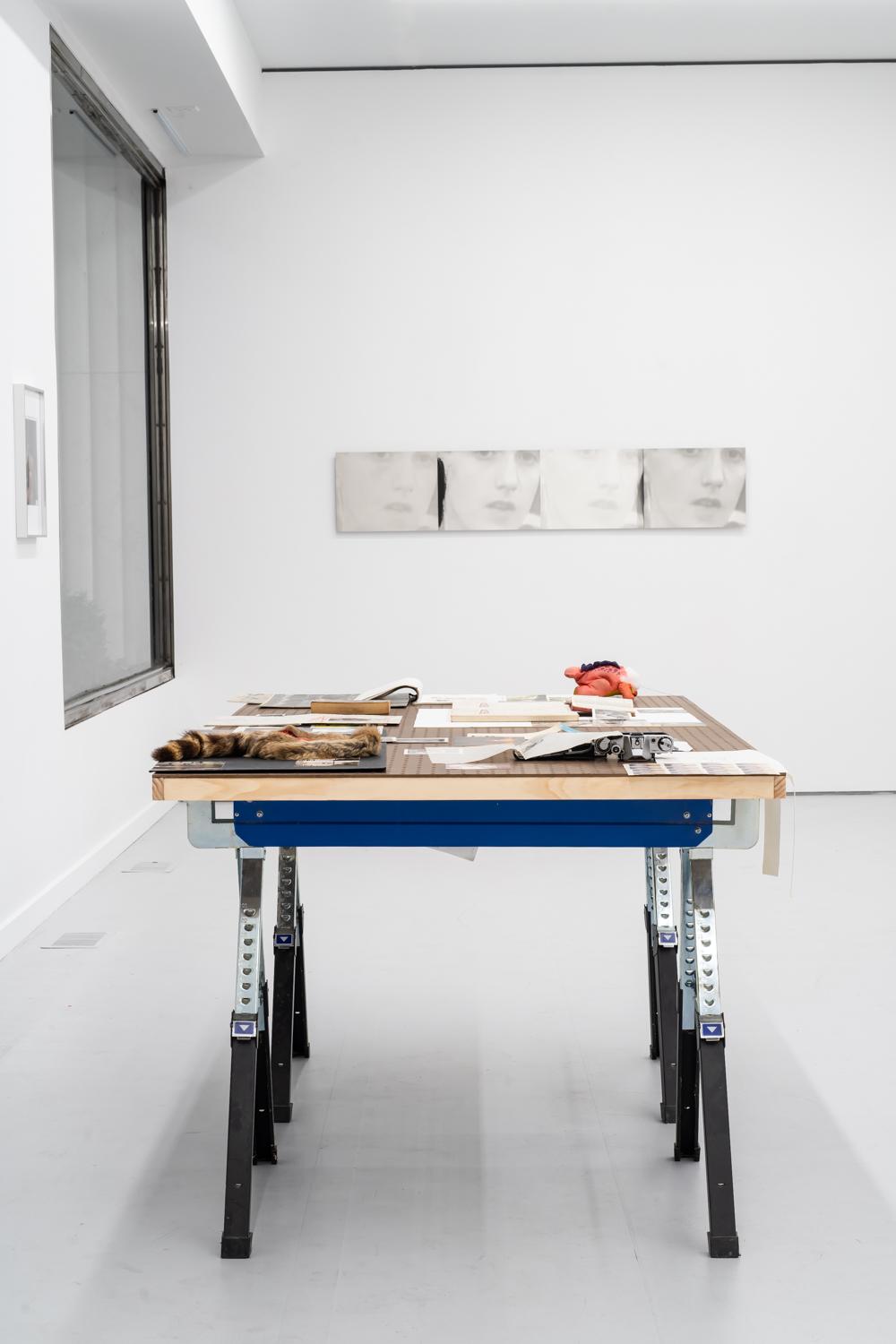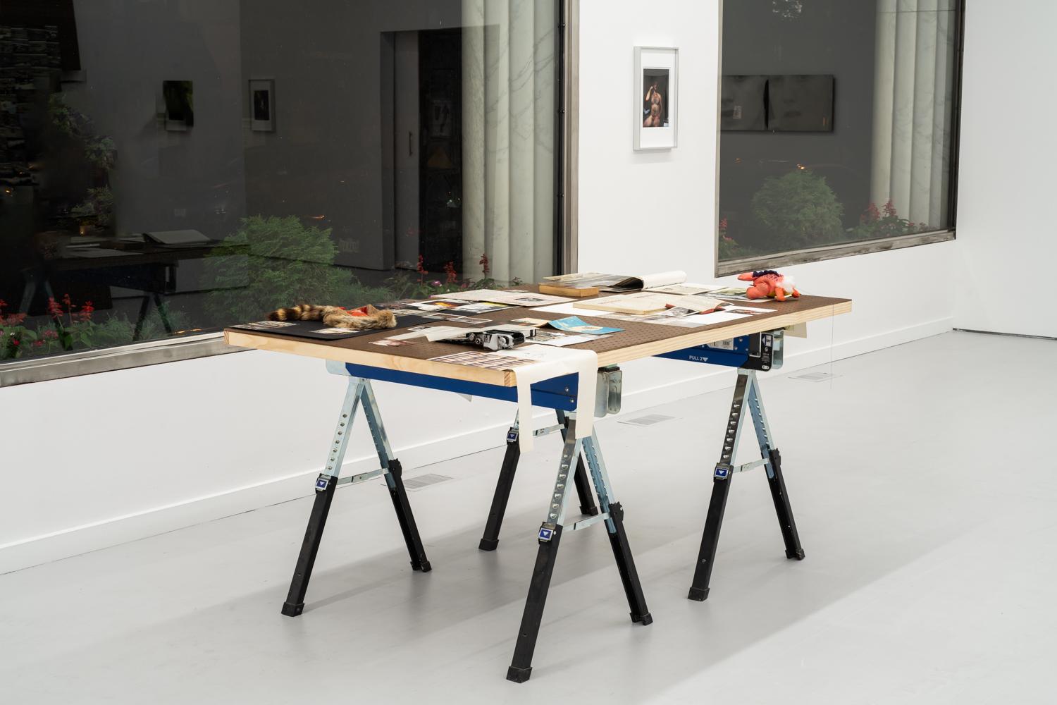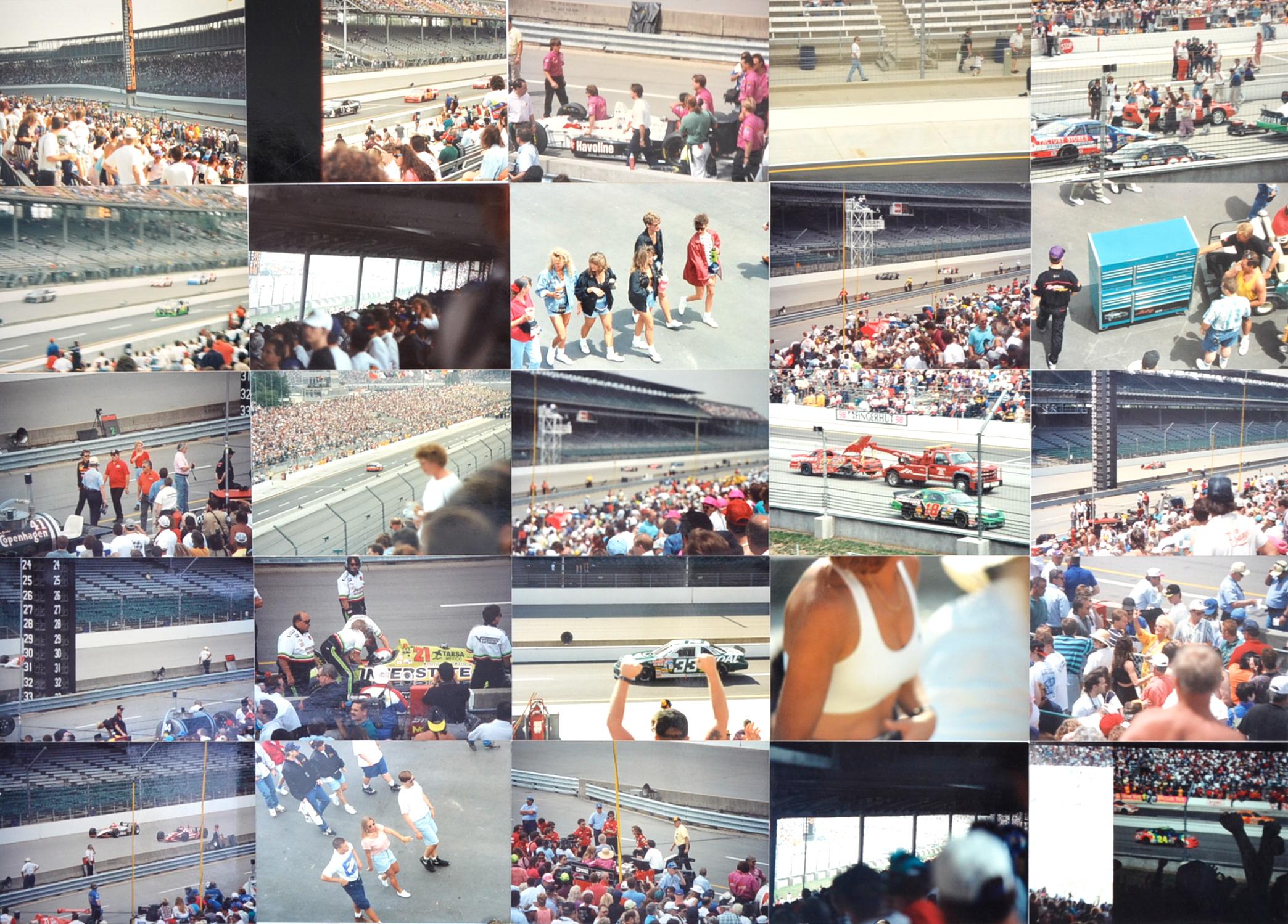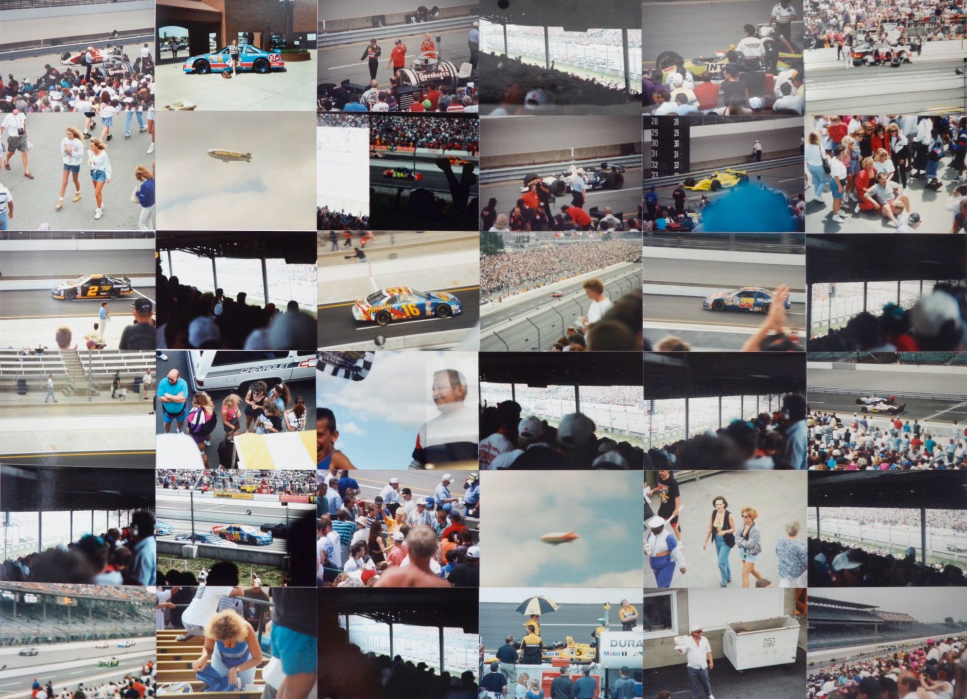 Lewandowski’s inclusion of drugstore photo prints from the Brickyard 400 NASCAR races, taken by his uncle in the mid-90s, serves as a conceptual anchor to his childhood while juxtaposing masculine imagery with the potential for alternative narratives. This symbolic gesture underscores the fluidity of identity and the multiplicity of experiences within the context of Indiana's cultural landscape while rooting the narrative in the artist’s specific lifetime. The tiled images distill the male gaze Lewandowski was surrounded by in his youth, the same that saturates many corners of the Midwest to this day: at once removed and fascinated by both competitive driver and captivated woman. Displayed on pegboard alongside traditionally masculine ephemera, the installation recalls garage walls – the space conventionally relegated to men within the suburban home – further accentuating the subconscious tension of being simultaneously detached and entwined.