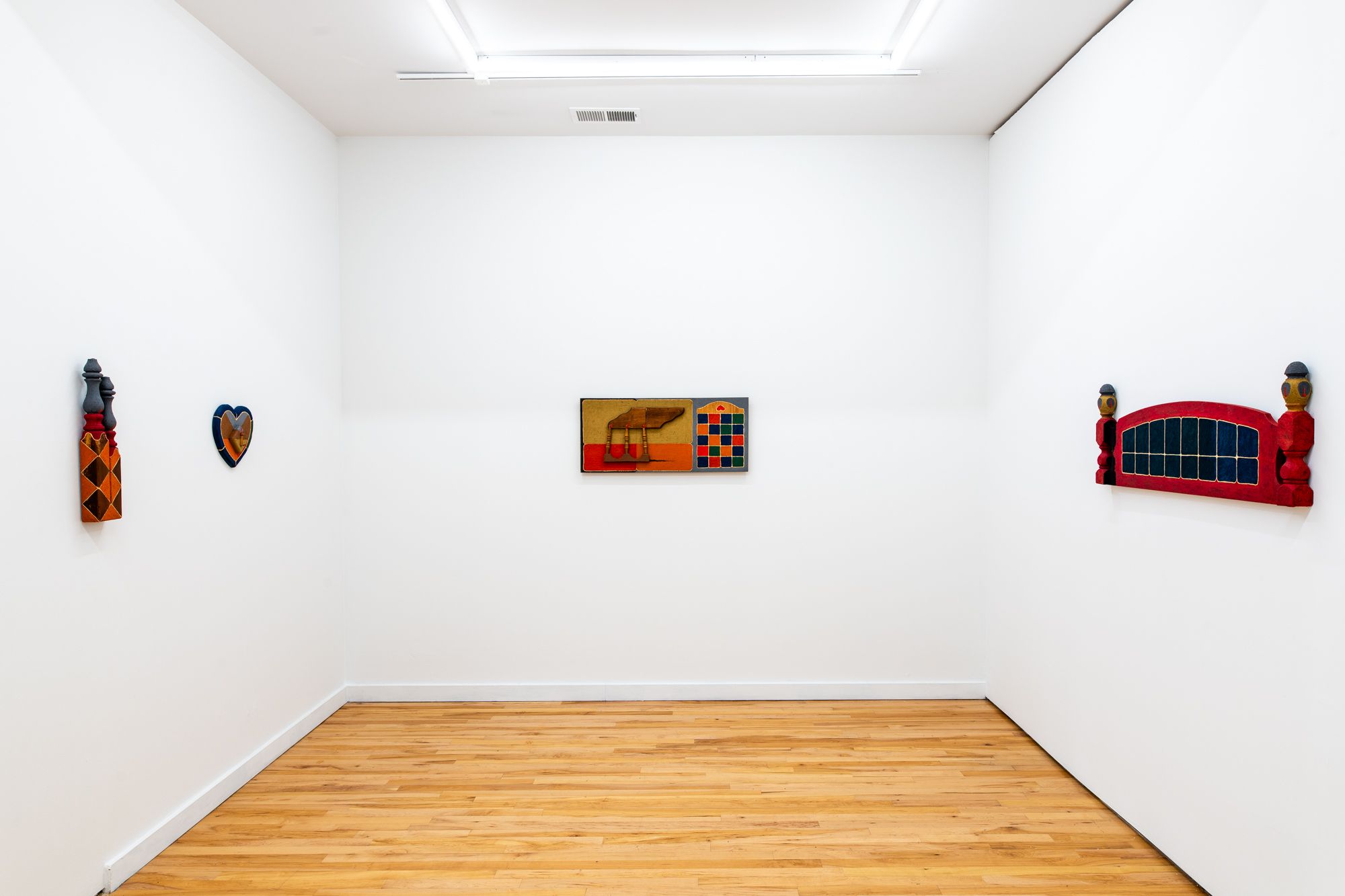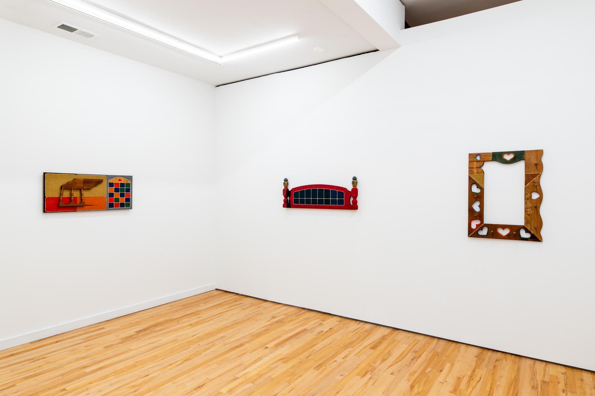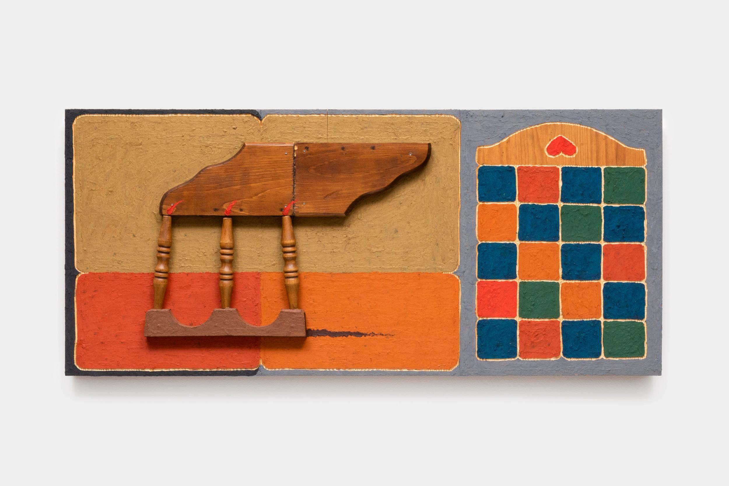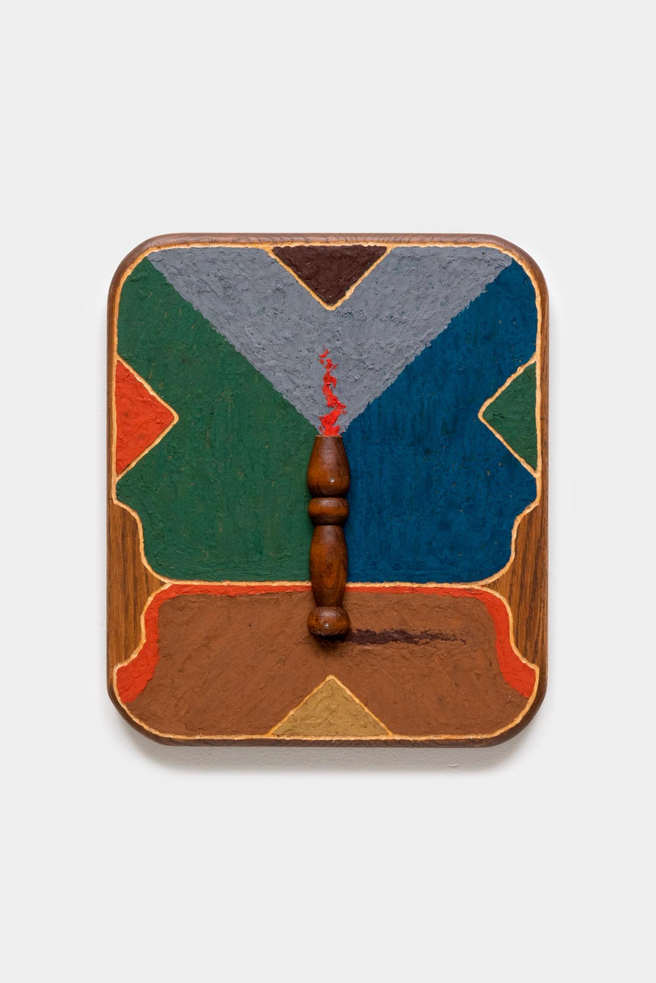 Flattened and recontextualized, his pieces become wall-bound works, existing in a space that tethers itself between outsider art and an instinctual, almost naive approach to making. The materials—crayons, discarded furniture, makeshift assemblages—echo a resourcefulness both genuine and urgent, as if each piece carries the residue of an era where nothing was wasted, only repurposed.