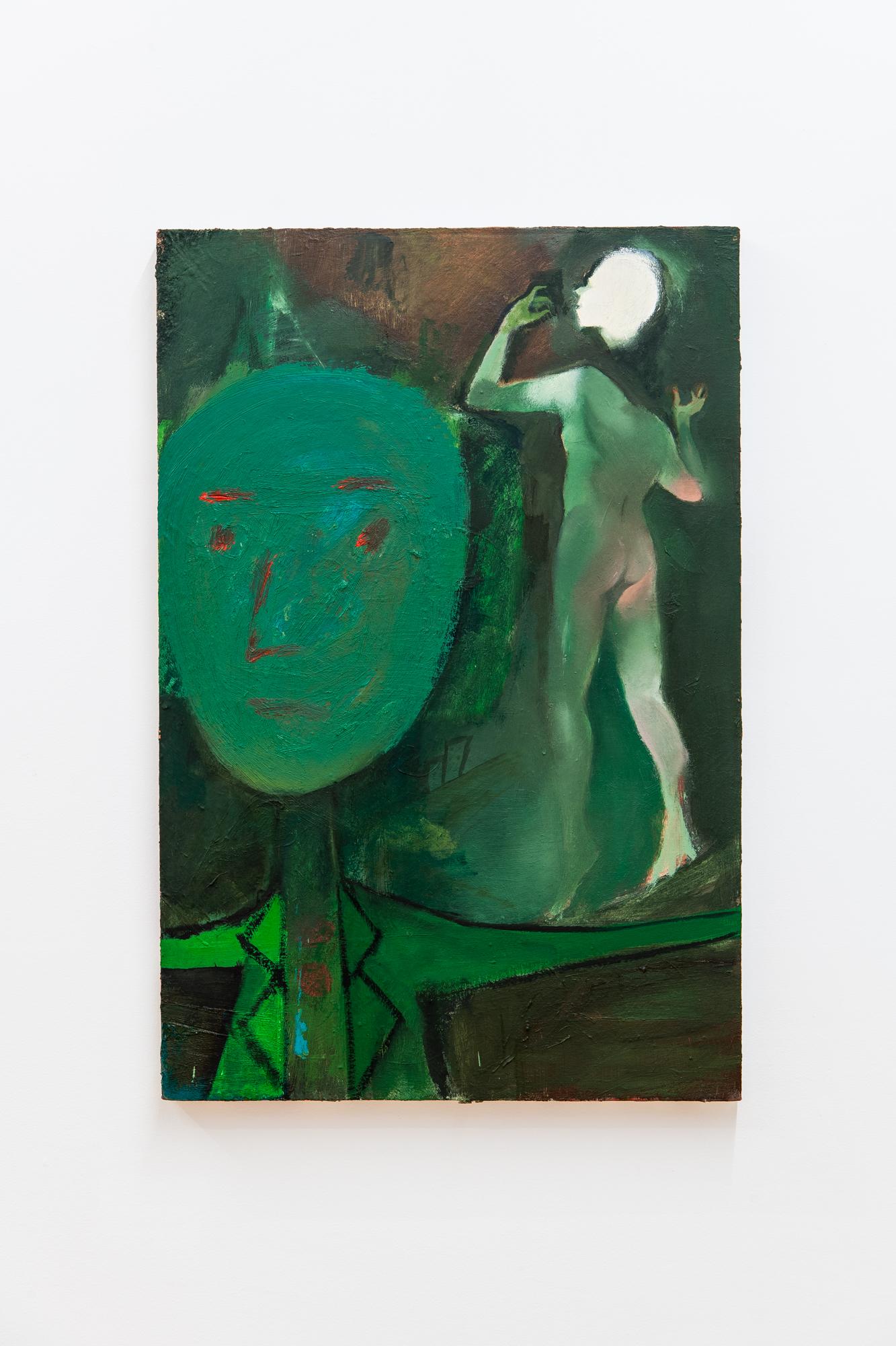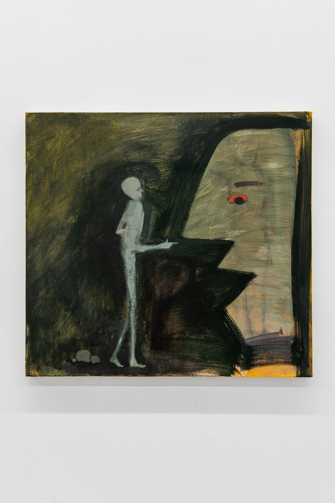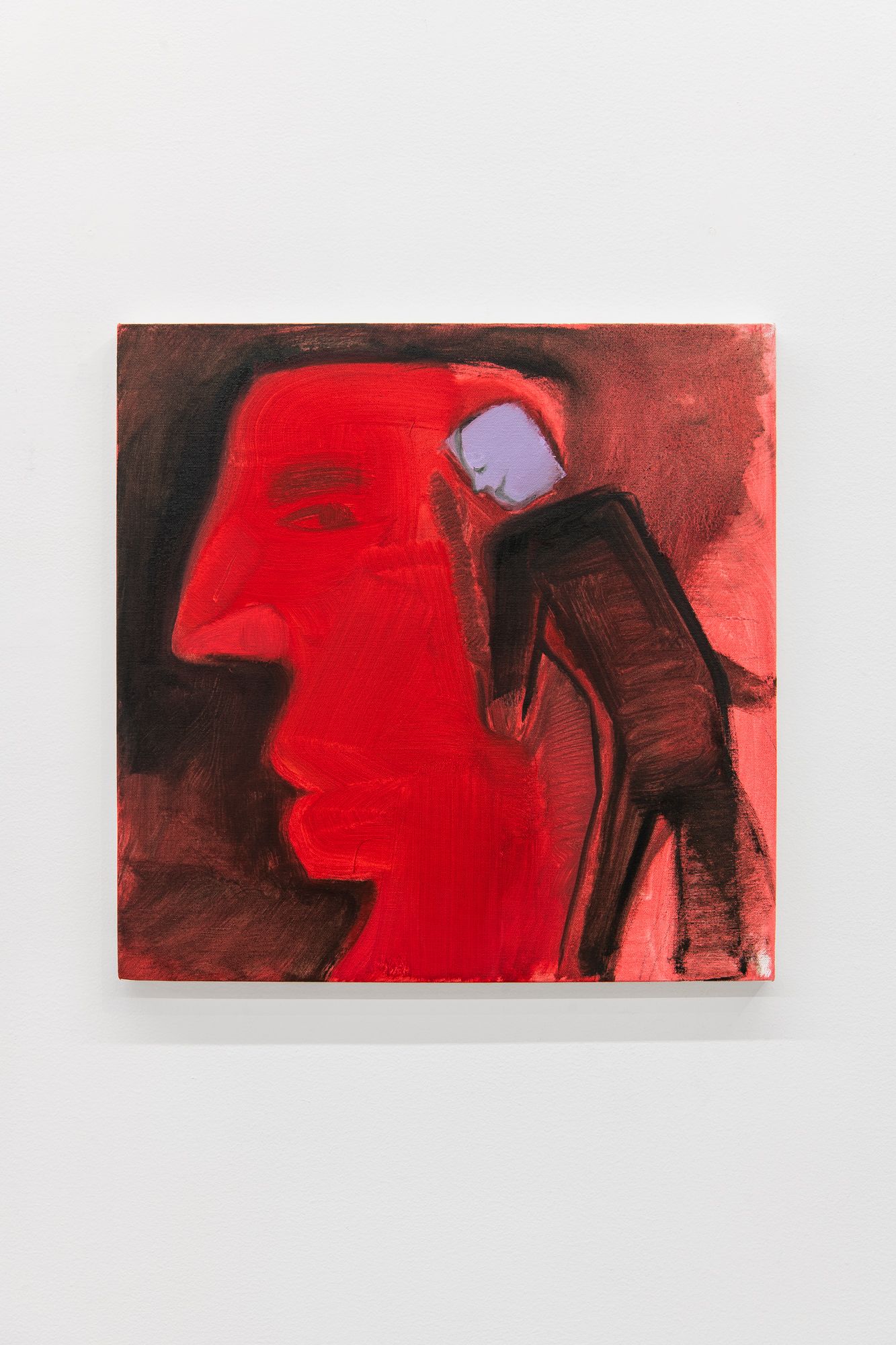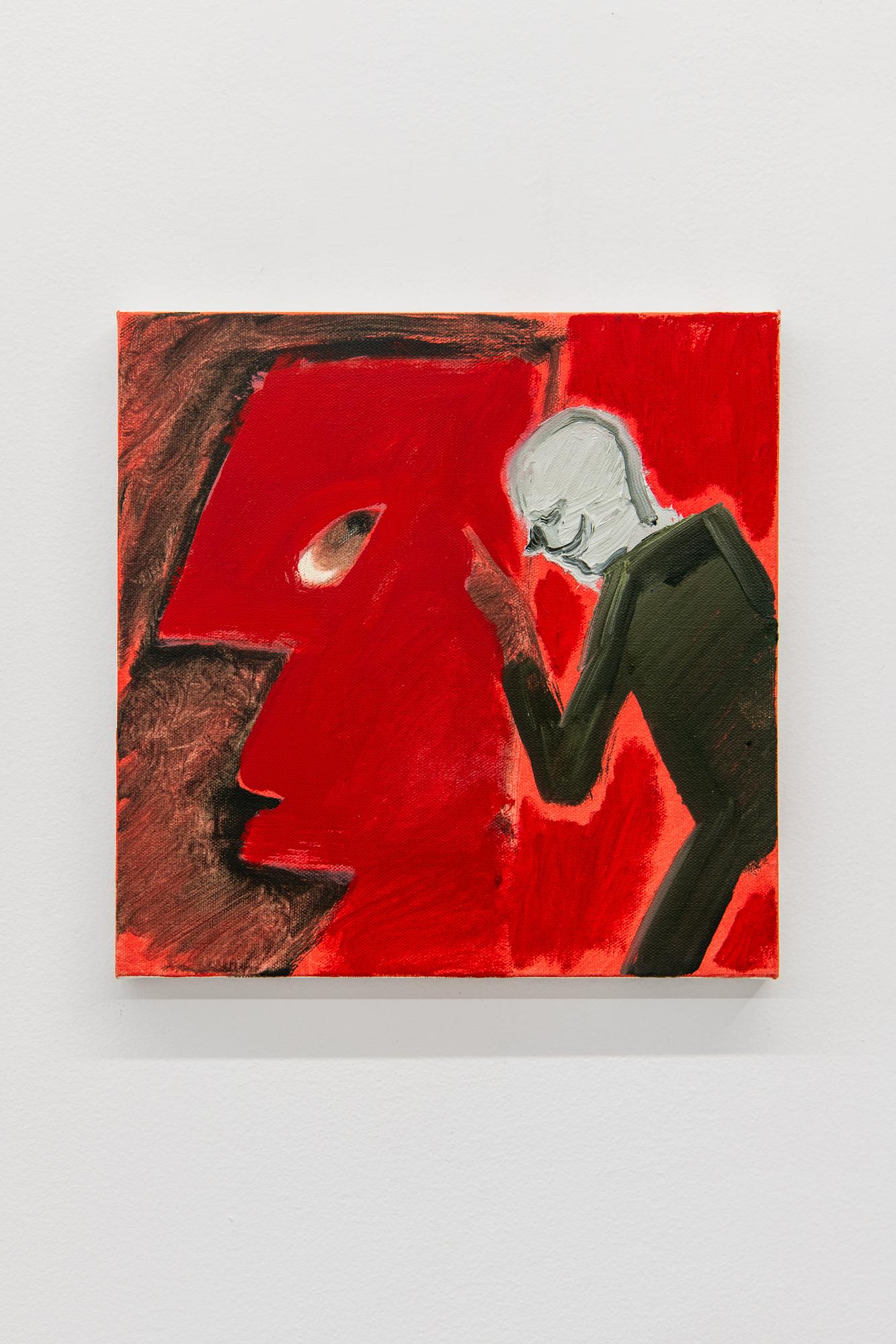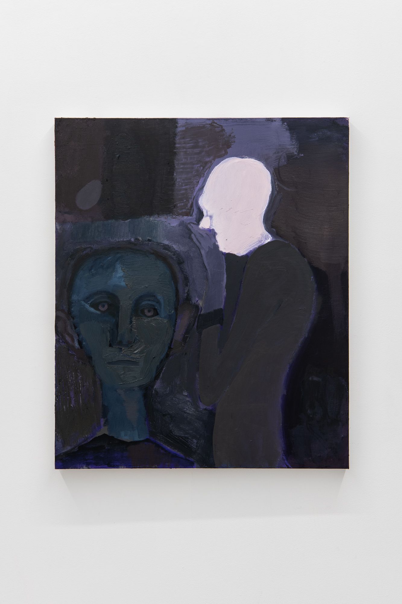 For these new paintings, Hoza abandons the security of autobiography to chart ulterior territory, becoming a narrator of unknown intent. Sinisterly inventive faces marred by harsh angles of thick paint grin off the surfaces with an aggression and urgency absent from previously heartfelt scenes. A once pervasive comforting glow is now compartmentalized, offering only moments of reprieve in the anxiety of obsessively honed brushwork. Hoza’s figural counterparts steadily buzz with an underlying drone of doubt, conflating personal grievances with the burden of participating in an overabundant history. Interactions are dictated by the paradigm of contrasting sizes and gestures of each character. Across several works, figures point flatly in opposition to the amorphous faces peering at them from behind. Perhaps beckoning to an unseen force lying outside the confines of the canvas or asserting themselves to expel their fearfully large companions, each of these narratives becomes intently subjective and associative.
