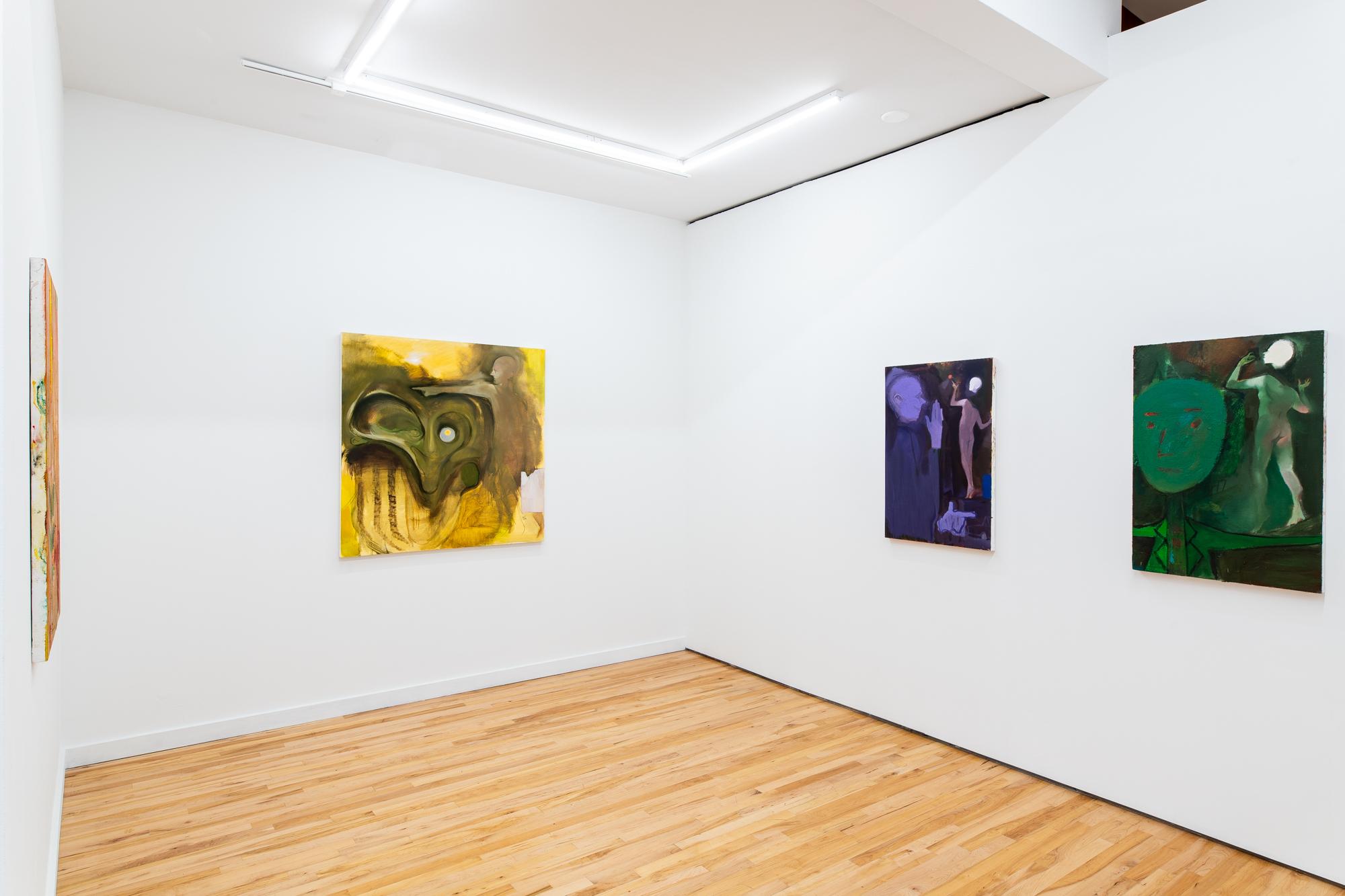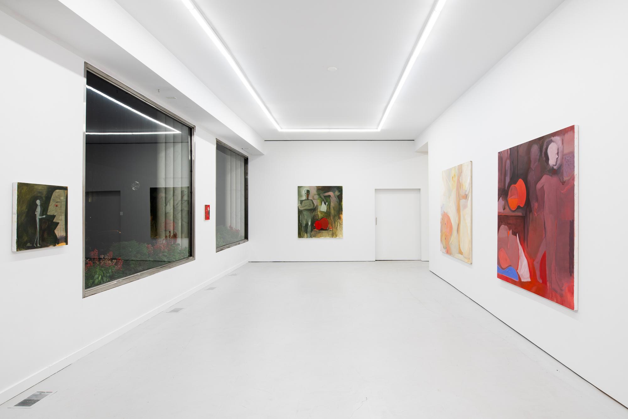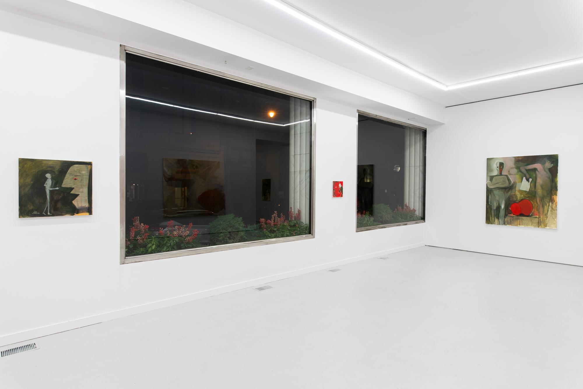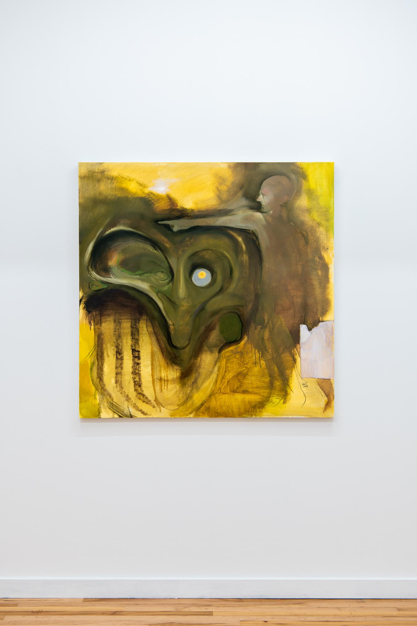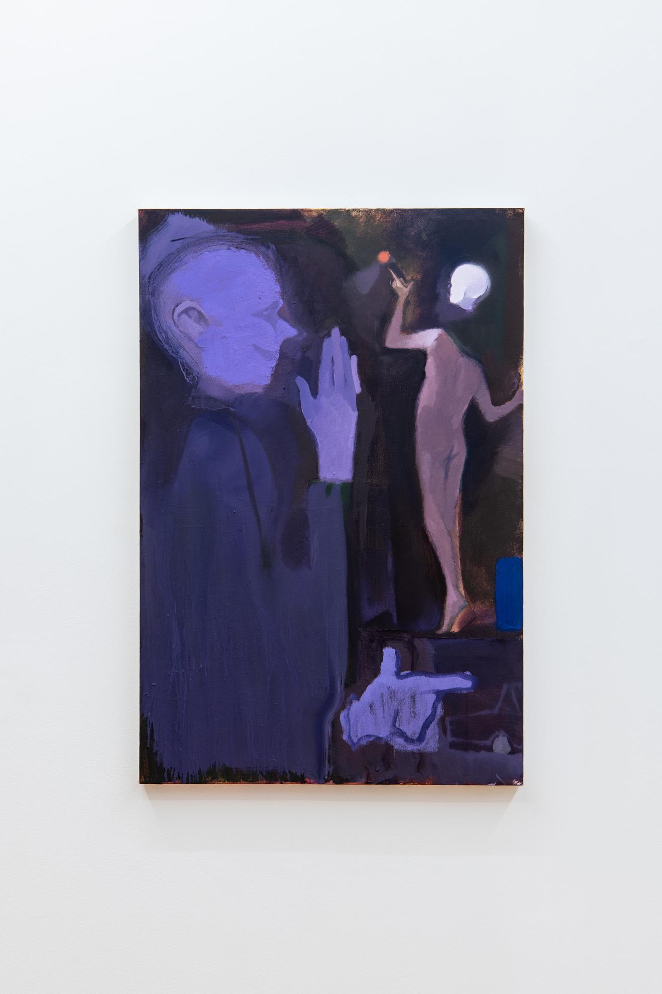 For these new paintings, Hoza abandons the security of autobiography to chart ulterior territory, becoming a narrator of unknown intent. Sinisterly inventive faces marred by harsh angles of thick paint grin off the surfaces with an aggression and urgency absent from previously heartfelt scenes. A once pervasive comforting glow is now compartmentalized, offering only moments of reprieve in the anxiety of obsessively honed brushwork. Hoza’s figural counterparts steadily buzz with an underlying drone of doubt, conflating personal grievances with the burden of participating in an overabundant history. Interactions are dictated by the paradigm of contrasting sizes and gestures of each character. Across several works, figures point flatly in opposition to the amorphous faces peering at them from behind. Perhaps beckoning to an unseen force lying outside the confines of the canvas or asserting themselves to expel their fearfully large companions, each of these narratives becomes intently subjective and associative.