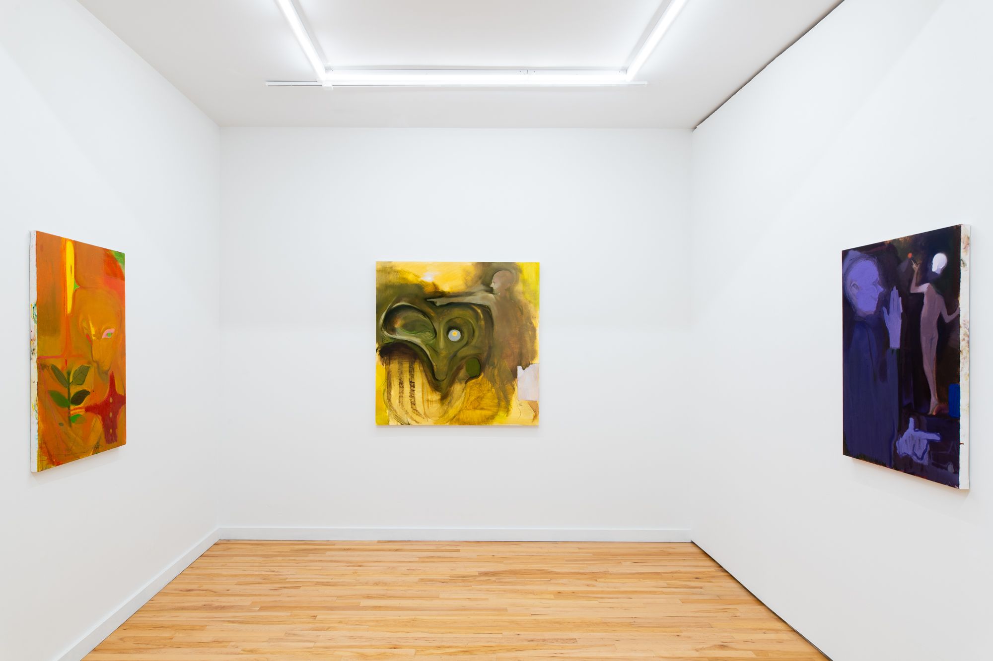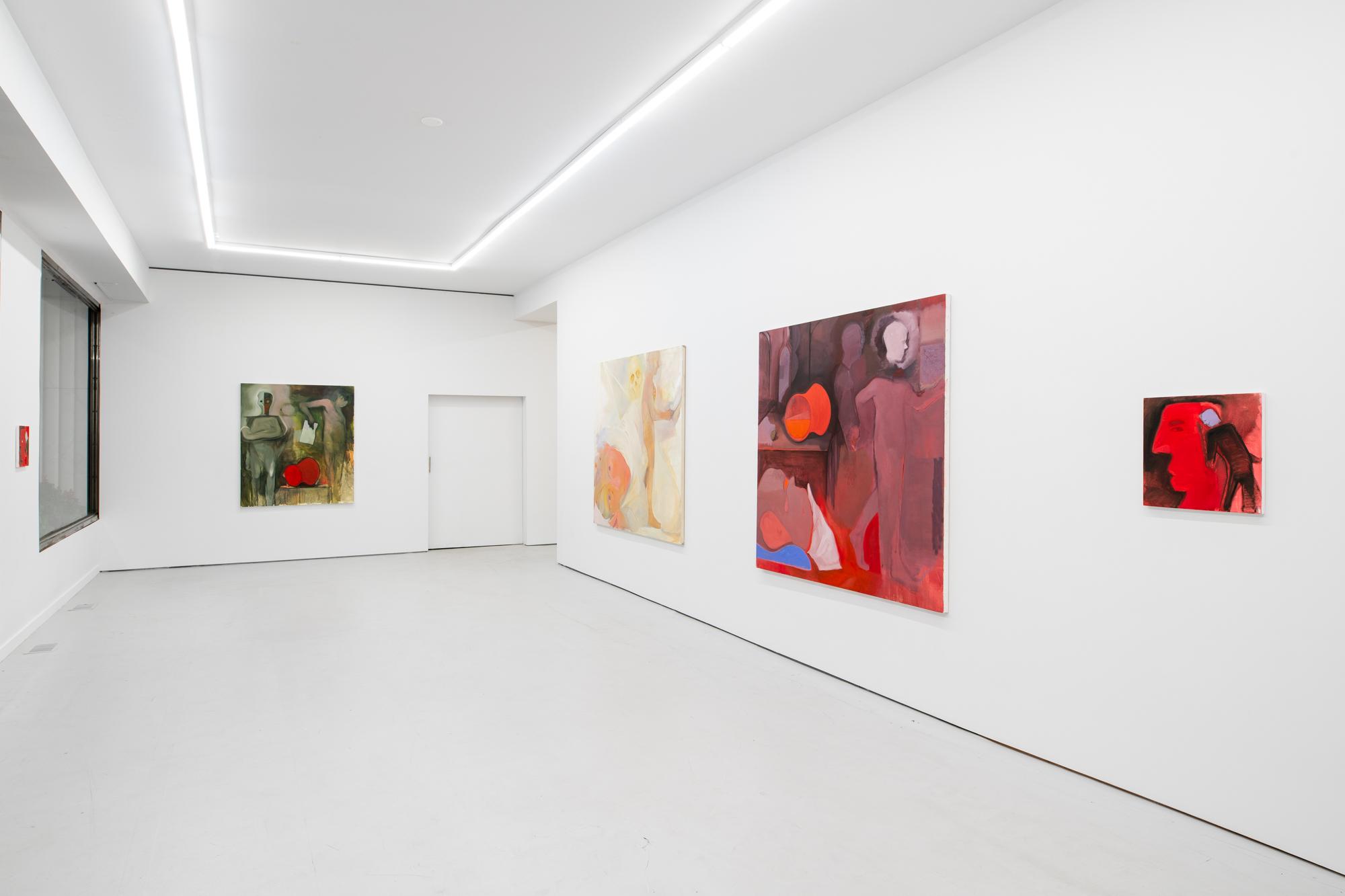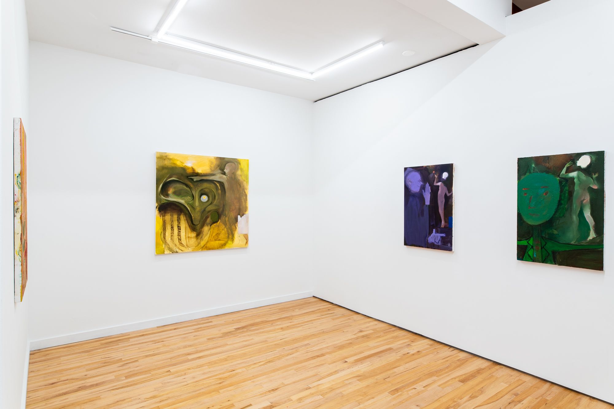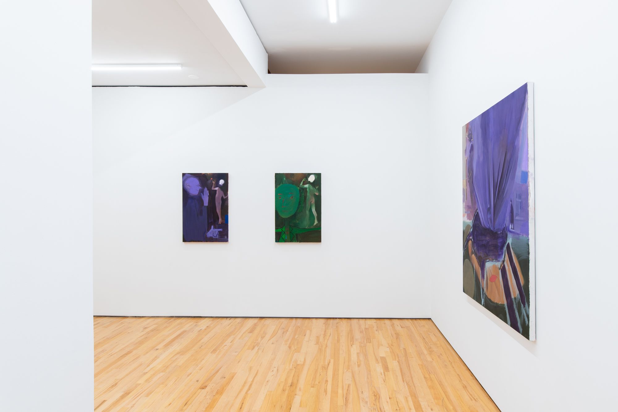 For these new paintings, Hoza abandons the security of autobiography to chart ulterior territory, becoming a narrator of unknown intent. Sinisterly inventive faces marred by harsh angles of thick paint grin off the surfaces with an aggression and urgency absent from previously heartfelt scenes. A once pervasive comforting glow is now compartmentalized, offering only moments of reprieve in the anxiety of obsessively honed brushwork. Hoza’s figural counterparts steadily buzz with an underlying drone of doubt, conflating personal grievances with the burden of participating in an overabundant history. Interactions are dictated by the paradigm of contrasting sizes and gestures of each character. Across several works, figures point flatly in opposition to the amorphous faces peering at them from behind. Perhaps beckoning to an unseen force lying outside the confines of the canvas or asserting themselves to expel their fearfully large companions, each of these narratives becomes intently subjective and associative.