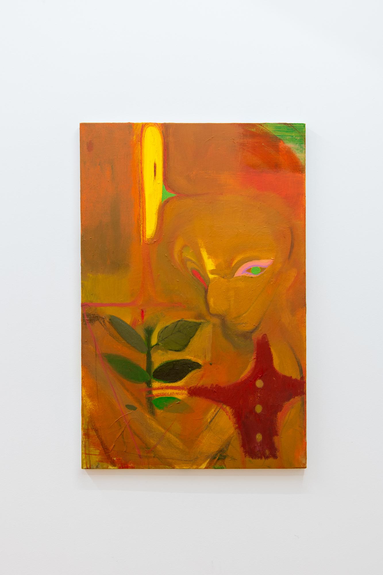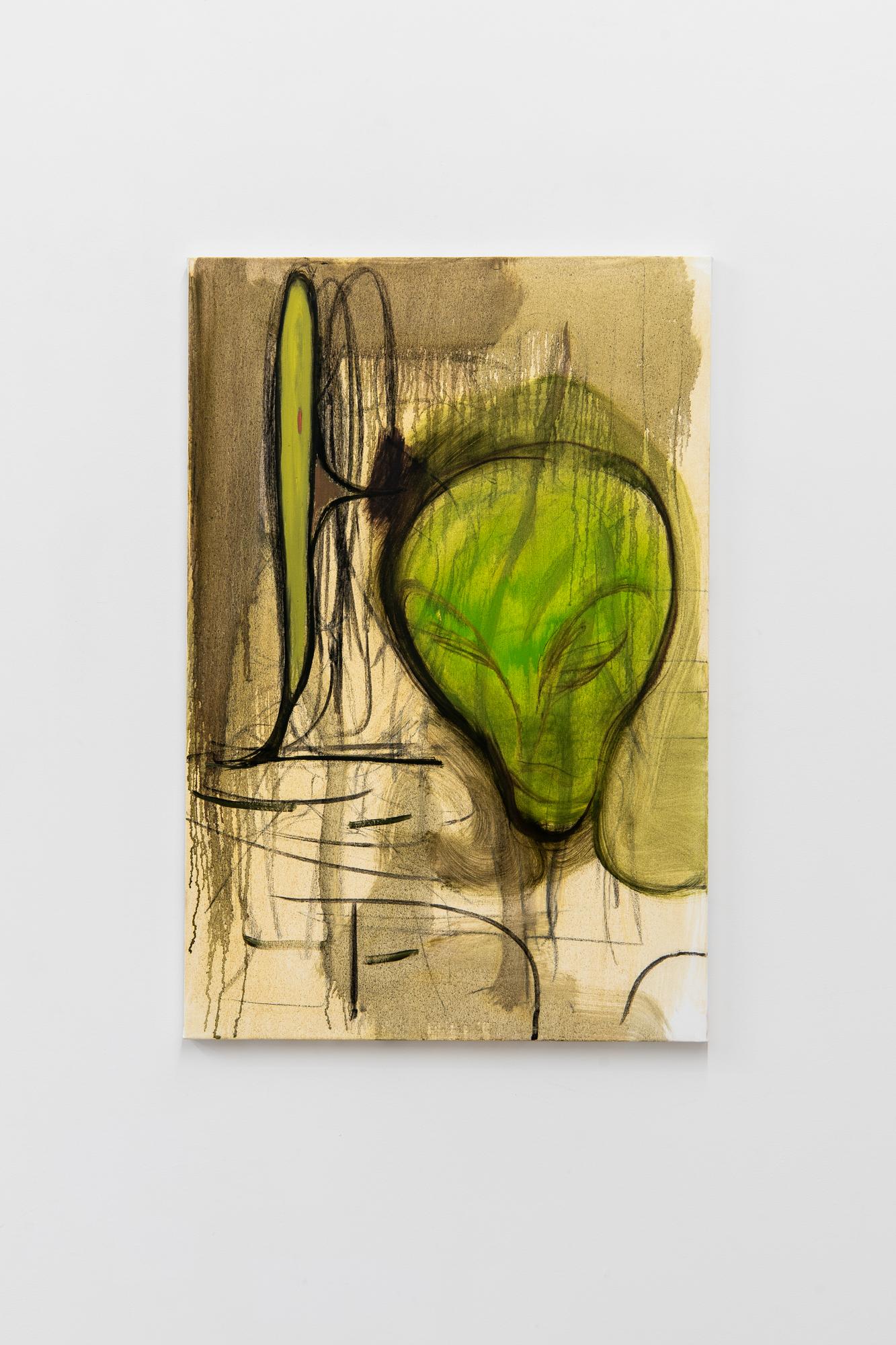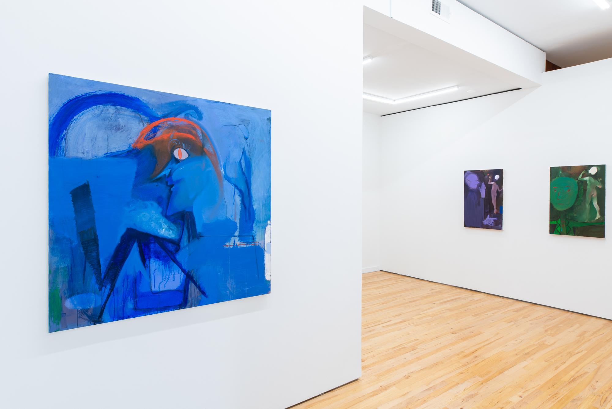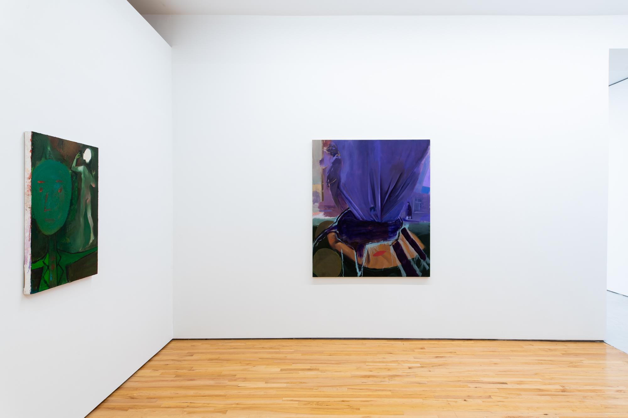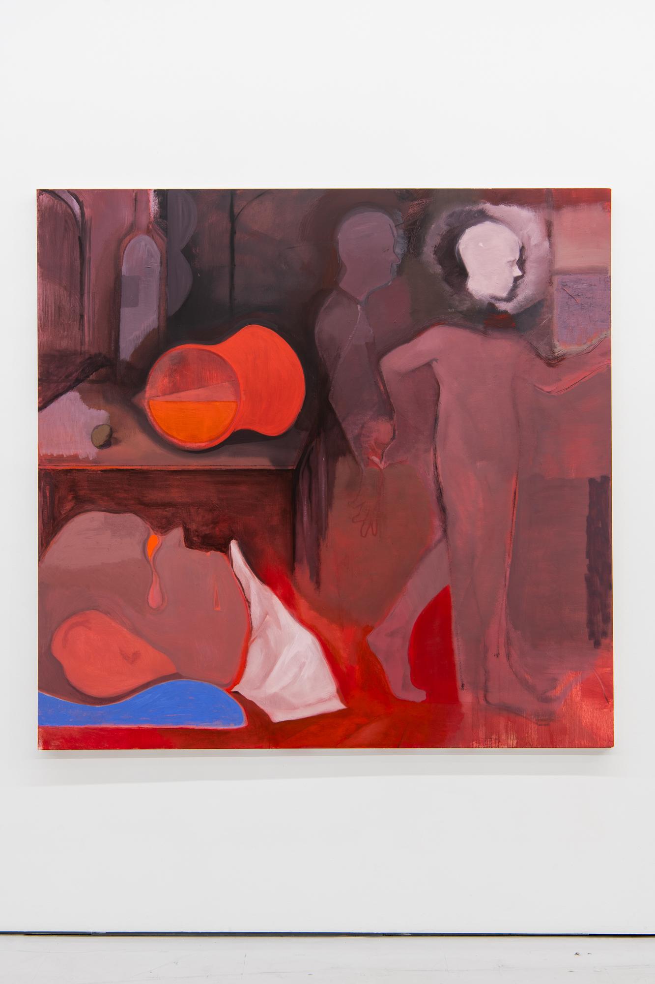 For these new paintings, Hoza abandons the security of autobiography to chart ulterior territory, becoming a narrator of unknown intent. Sinisterly inventive faces marred by harsh angles of thick paint grin off the surfaces with an aggression and urgency absent from previously heartfelt scenes. A once pervasive comforting glow is now compartmentalized, offering only moments of reprieve in the anxiety of obsessively honed brushwork. Hoza’s figural counterparts steadily buzz with an underlying drone of doubt, conflating personal grievances with the burden of participating in an overabundant history. Interactions are dictated by the paradigm of contrasting sizes and gestures of each character. Across several works, figures point flatly in opposition to the amorphous faces peering at them from behind. Perhaps beckoning to an unseen force lying outside the confines of the canvas or asserting themselves to expel their fearfully large companions, each of these narratives becomes intently subjective and associative.