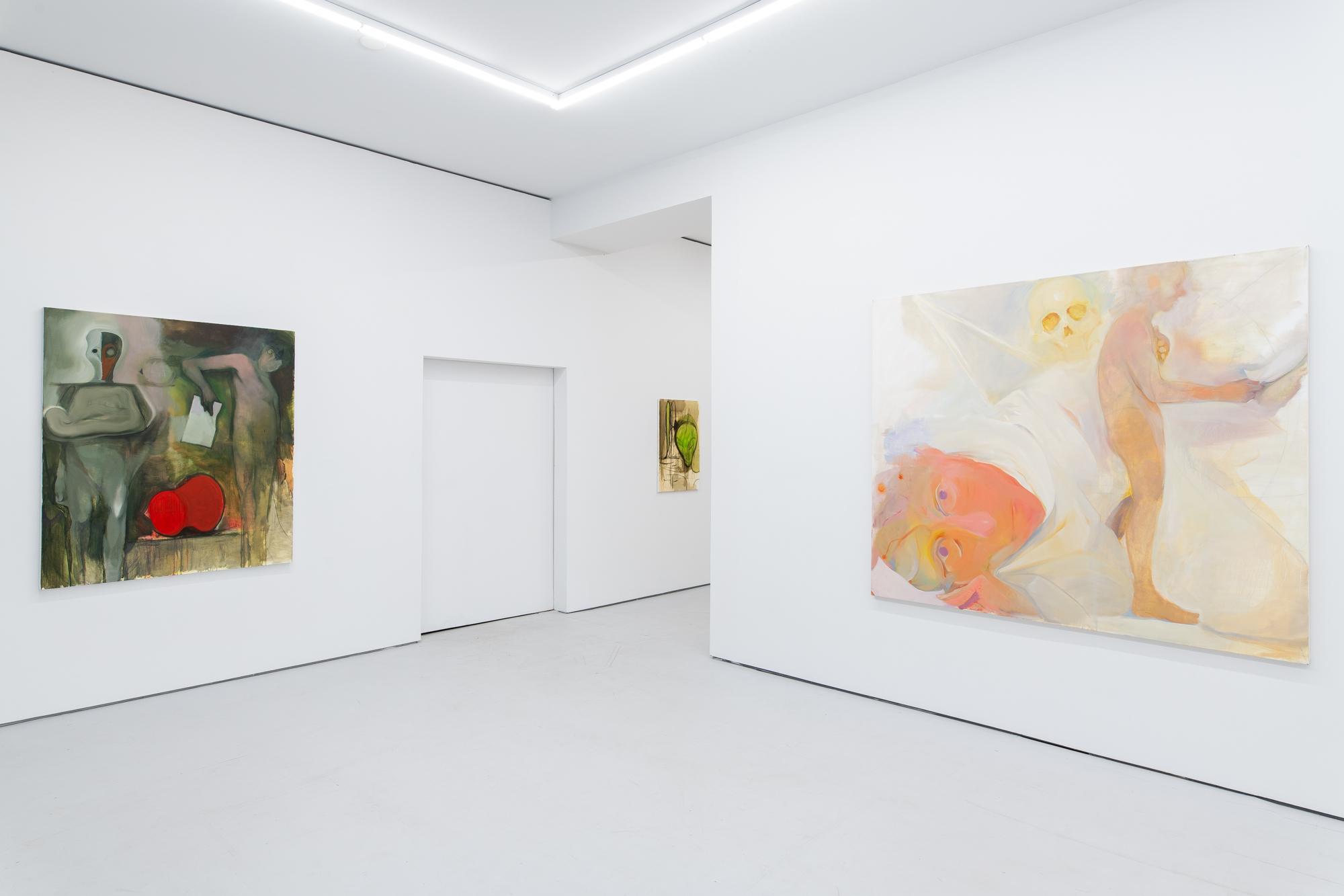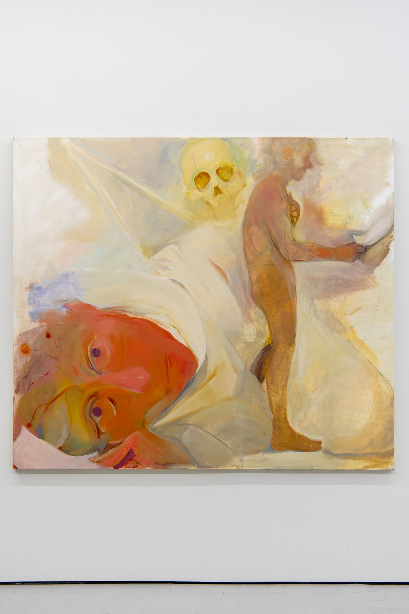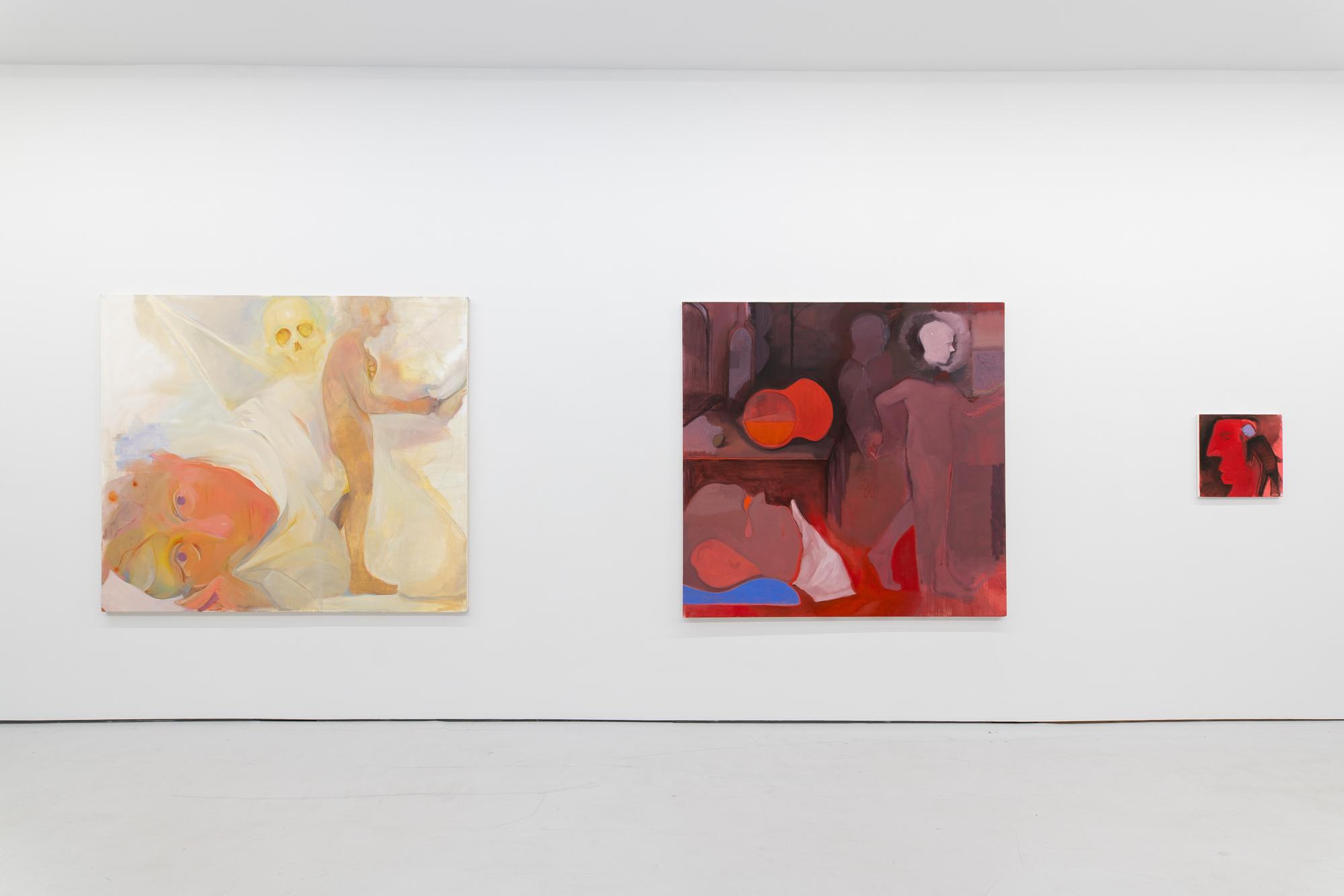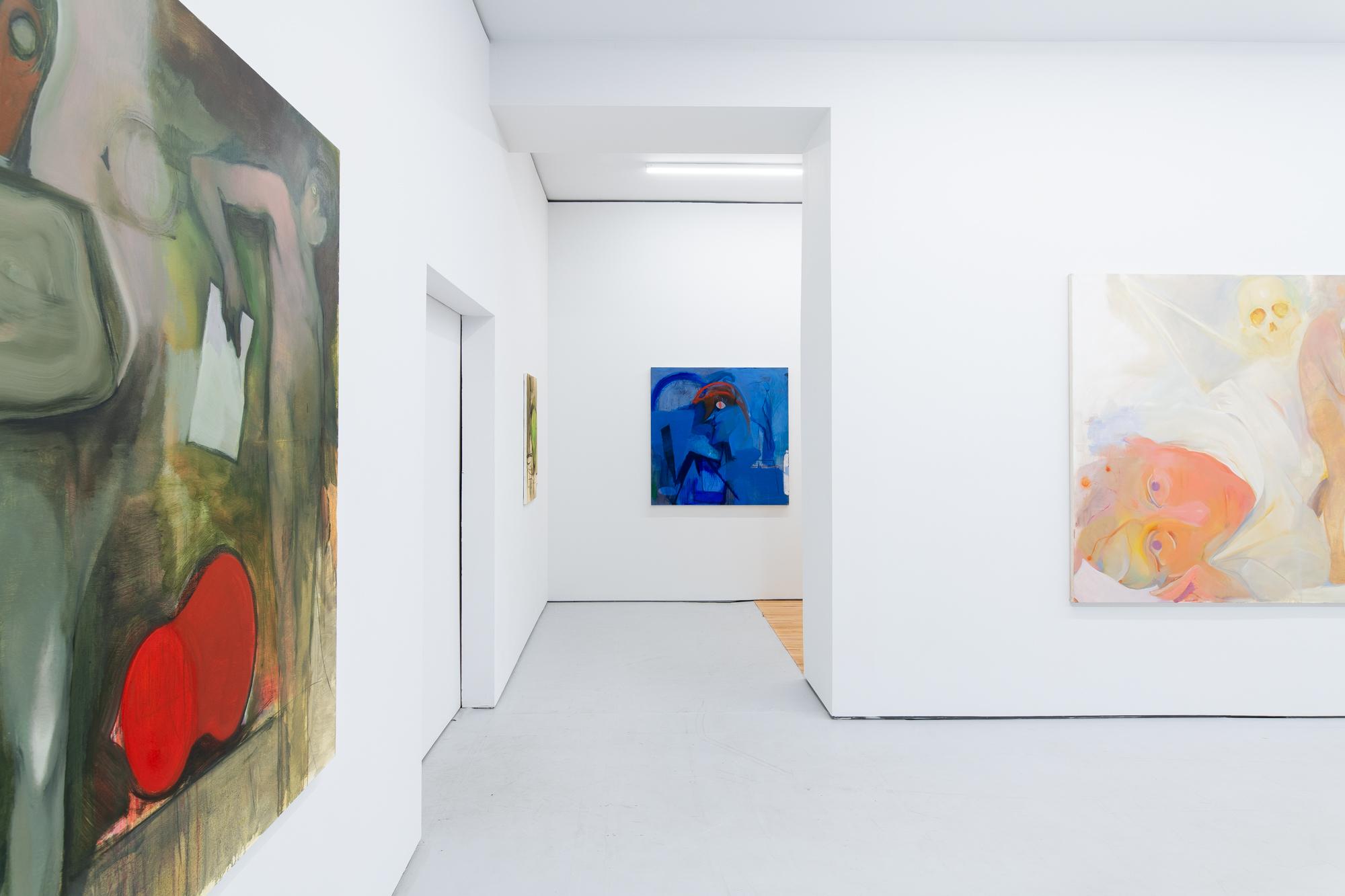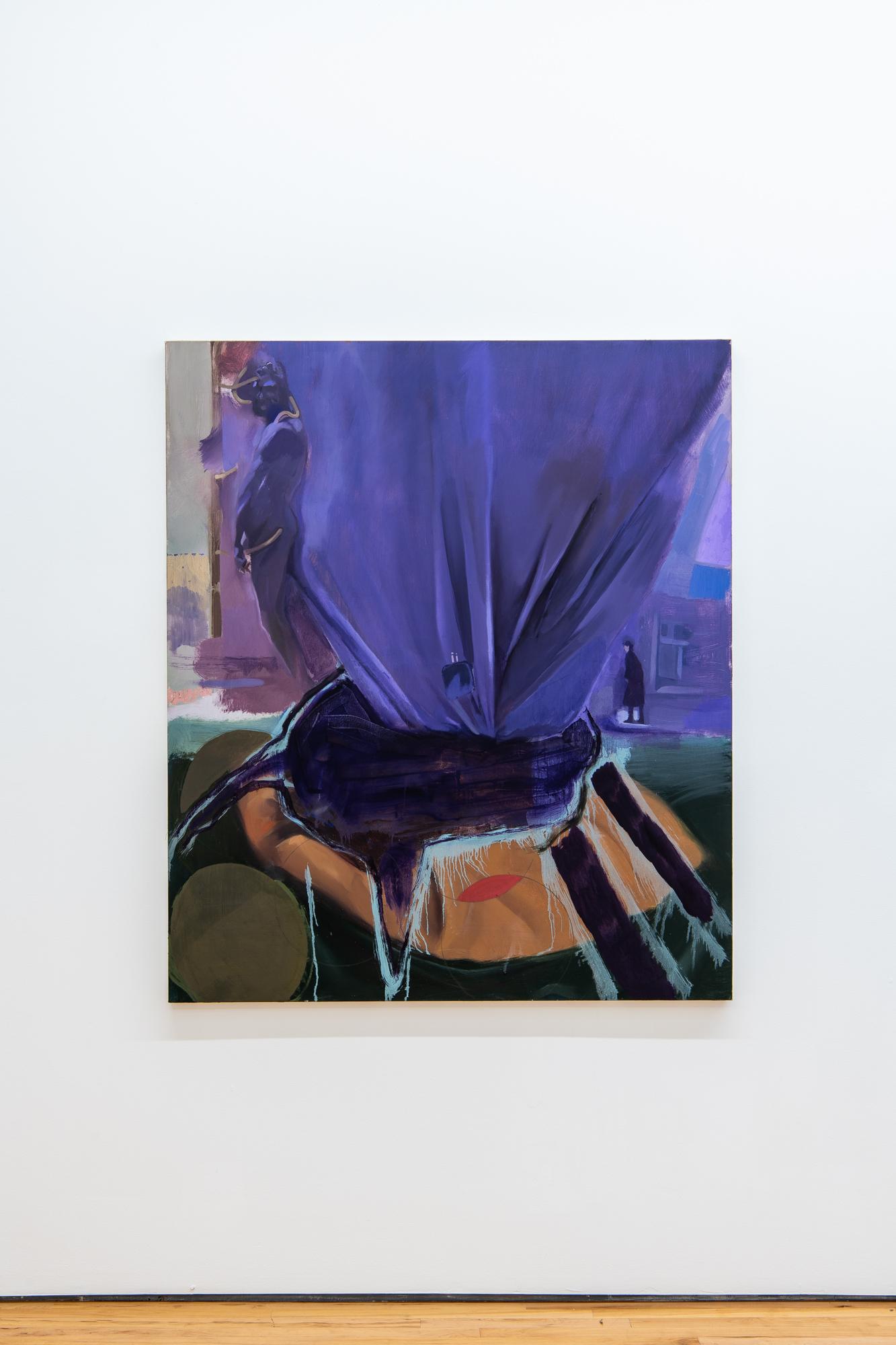 For these new paintings, Hoza abandons the security of autobiography to chart ulterior territory, becoming a narrator of unknown intent. Sinisterly inventive faces marred by harsh angles of thick paint grin off the surfaces with an aggression and urgency absent from previously heartfelt scenes. A once pervasive comforting glow is now compartmentalized, offering only moments of reprieve in the anxiety of obsessively honed brushwork. Hoza’s figural counterparts steadily buzz with an underlying drone of doubt, conflating personal grievances with the burden of participating in an overabundant history. Interactions are dictated by the paradigm of contrasting sizes and gestures of each character. Across several works, figures point flatly in opposition to the amorphous faces peering at them from behind. Perhaps beckoning to an unseen force lying outside the confines of the canvas or asserting themselves to expel their fearfully large companions, each of these narratives becomes intently subjective and associative.