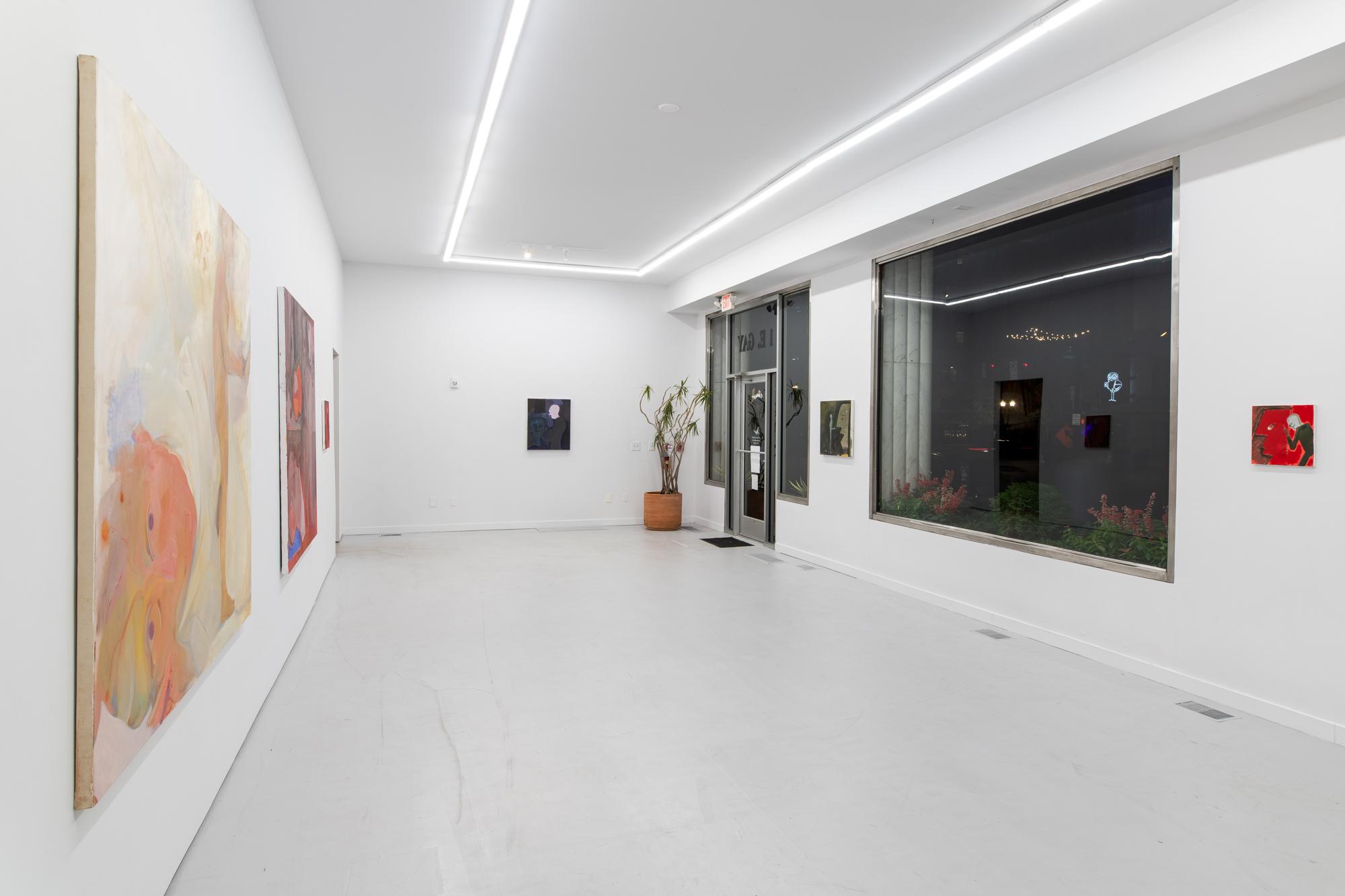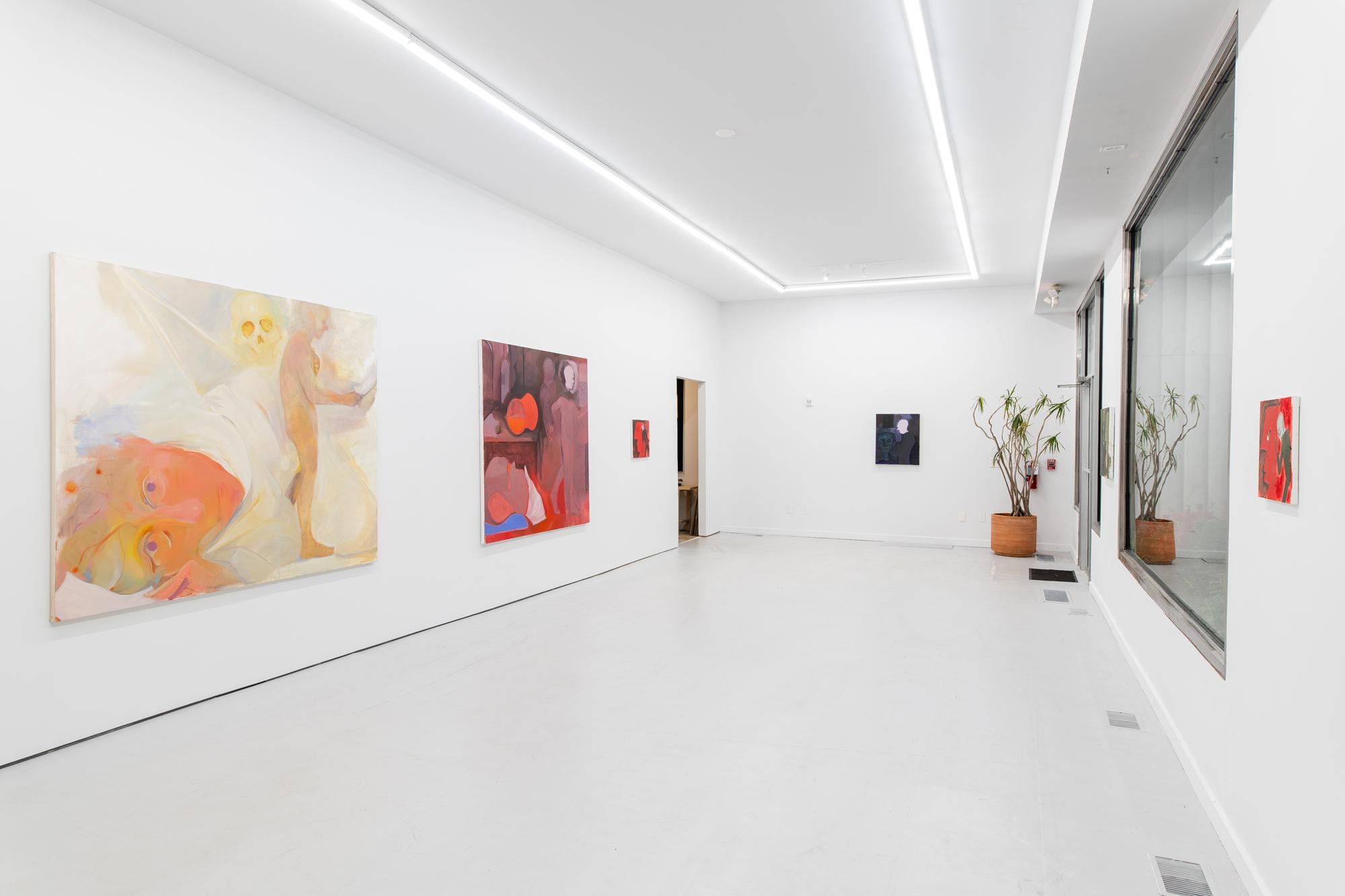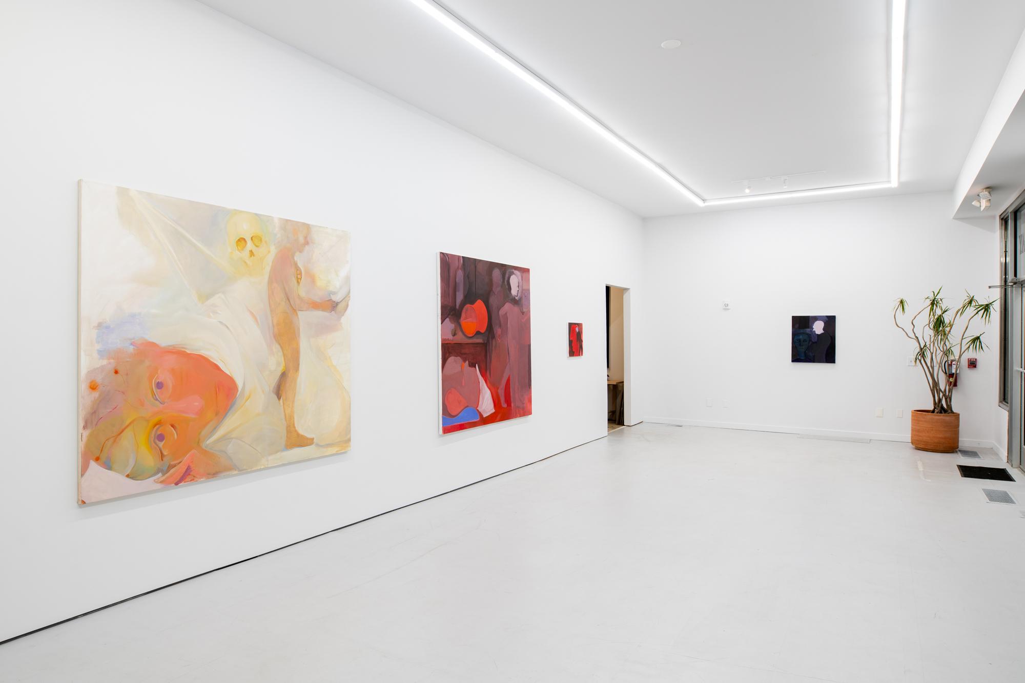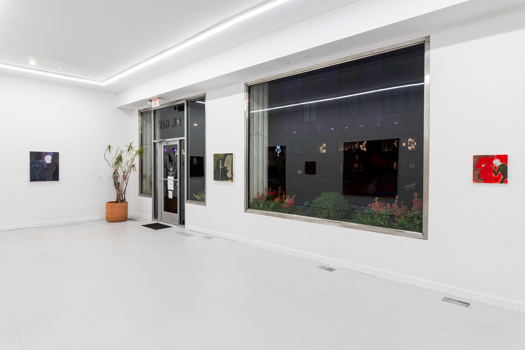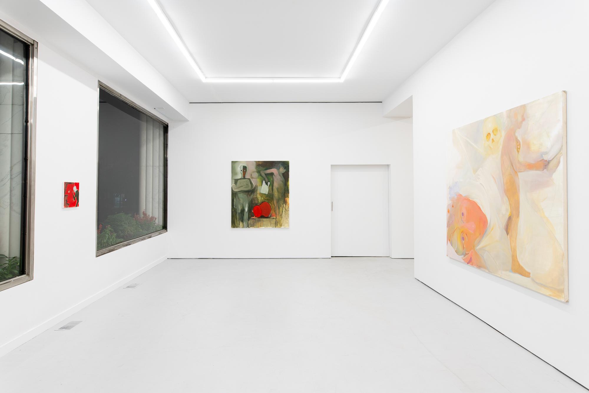 For these new paintings, Hoza abandons the security of autobiography to chart ulterior territory, becoming a narrator of unknown intent. Sinisterly inventive faces marred by harsh angles of thick paint grin off the surfaces with an aggression and urgency absent from previously heartfelt scenes. A once pervasive comforting glow is now compartmentalized, offering only moments of reprieve in the anxiety of obsessively honed brushwork. Hoza’s figural counterparts steadily buzz with an underlying drone of doubt, conflating personal grievances with the burden of participating in an overabundant history. Interactions are dictated by the paradigm of contrasting sizes and gestures of each character. Across several works, figures point flatly in opposition to the amorphous faces peering at them from behind. Perhaps beckoning to an unseen force lying outside the confines of the canvas or asserting themselves to expel their fearfully large companions, each of these narratives becomes intently subjective and associative.