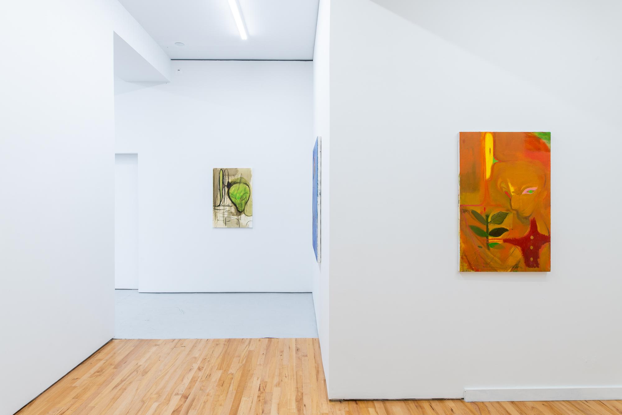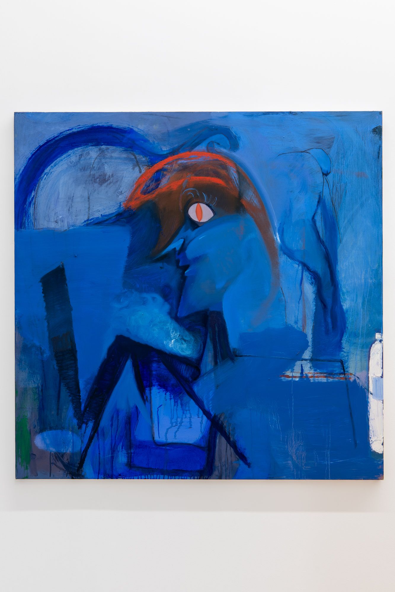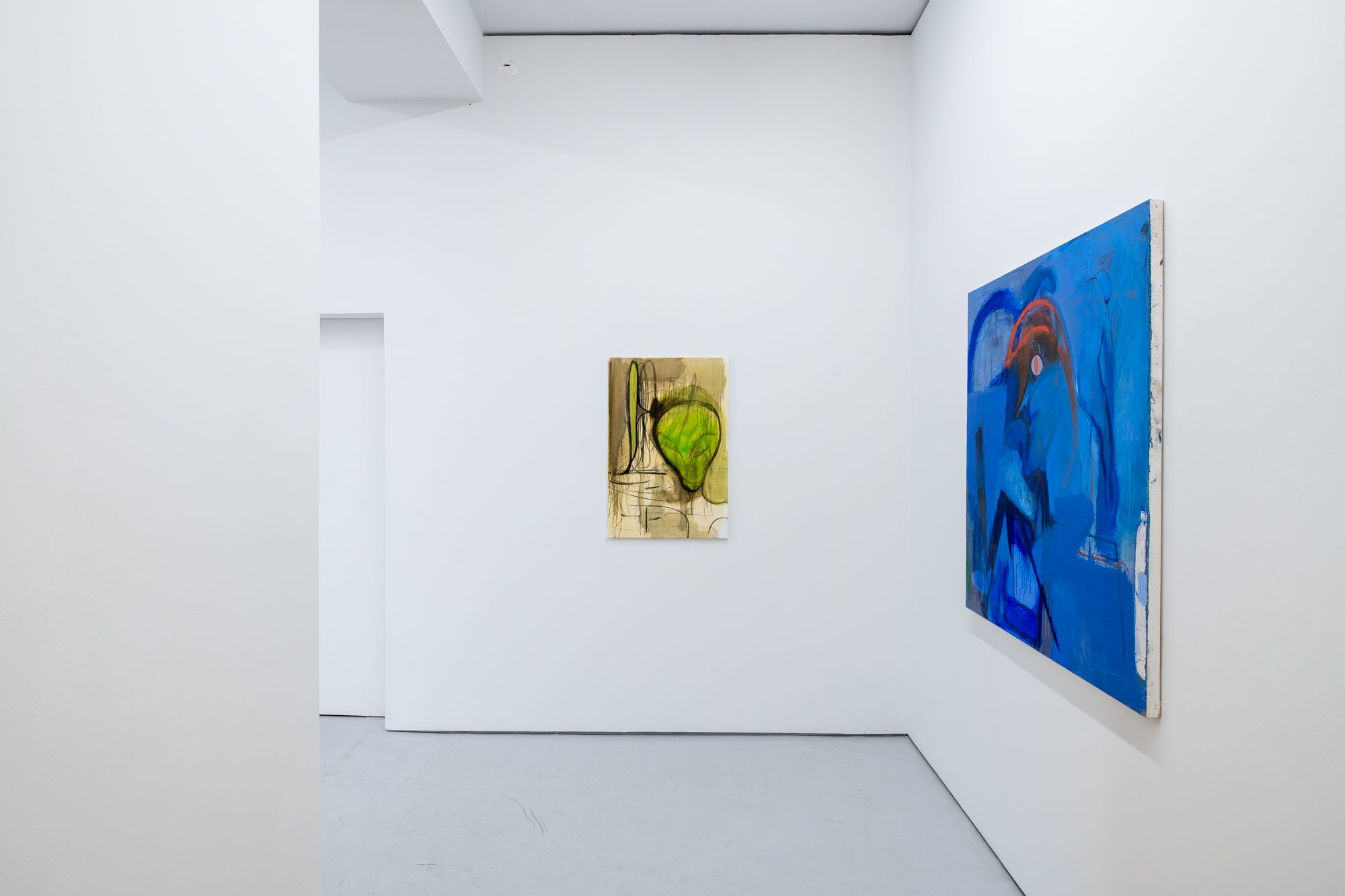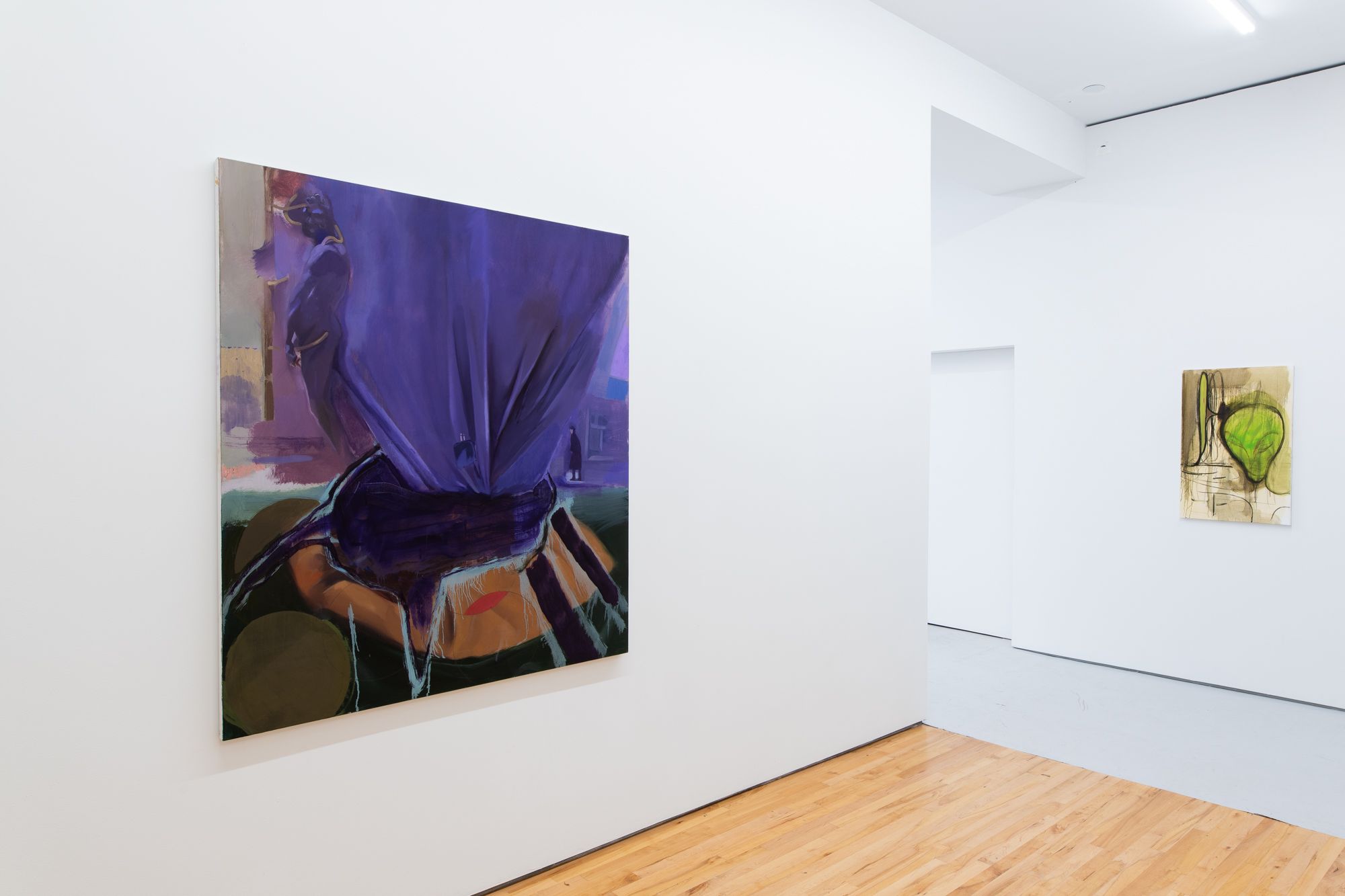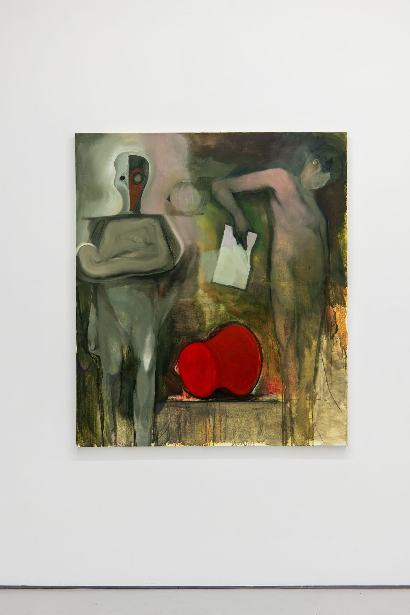 In previous bodies of work, Hoza portrayed interior scenes that dwelled on the warmth of his homelife. The artist’s partner and cats became motifs, transforming into signifiers of domesticity and its inherent complications. While Hoza has shed the representational familiarities of the everyday, themes of banality, longing, and loneliness have remained steadfast. These undercurrents form the connective tissue across the bodies of Hoza’s world. In his new paintings, Hoza wrestles with the isolation that often accompanies a rigorous studio practice. The figurative couples on display become surrogate companions, a simulacrum family quietly arguing about their own interiority.