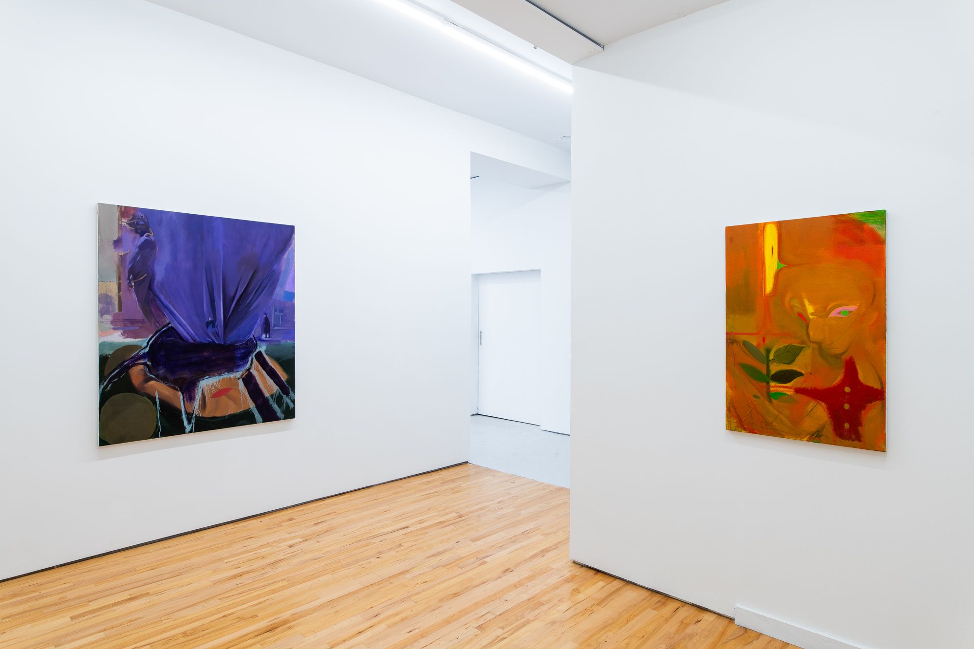 In his solo exhibition There’s No One Else Here, Stefan Hoza presents compositions of duetting figures whose disproportionate scale and variant stylization exist in psychologically dense atmospheres. While punctuated by familiar domestic objects like blankets, lamps, and pillows, the spaces constructed within Hoza’s paintings evade concrete definition. Each of the depicted figurations is tethered to their placelessness between the edges of the canvas.
